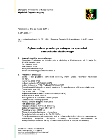 Starostwo Powiatowe w Kościerzynie Wydział Organizacyjny Kościerzyna, dnia 23 marca 2011 r. O-IZP.3150.1.11 Na podstawie uchwały Nr 25/11/2011 Zarządu Powiatu Kościerskiego z dnia 23 marca 2011 r. Ogłoszenie o przetargu ustnym na sprzedaż samochodu służbowego 1. Nazwa i siedziba sprzedającego: Starostwo Powiatowe w Kościerzynie z siedzibą w Kościerzynie, ul. 3 Maja 9c, 83-400 Kościerzyna Tel. 58 680-18-40 Fax 58 680-18-58 www.powiatkoscierski.pl e-mail:[email protected] 2. Przedmiot przetargu: Marka i typ pojazdu: samochód osobowy marki Skoda Roomster hatchback 1,9 TDI. Numer rej.GKS 9F99 Nr karty pojazdu:KP/AAB 2966874 Nr identyfikacyjny (VIN): TMBMG25J5A5032165 Rodzaj powłoki lakierniczej: czerń magiczna 2 – warstwowy z efektem metalicznym Oznaczenie typu: 5J Dop. masa całk. : 1770 kg Pojemność/moc silnika:1896ccm/77kW (105KM) Numer silnika: BSW 093518 Rodzaj silnika: z zapłonem samoczynnym Doładowanie: Turbosprężarka Rodzaj skrzyni biegów: manualna Rok produkcji: 2009 Rodzaj nadwozia: minivan 5 drzwiowy Data pierwszej rejestracji: 04.01.2010 Przebieg w km: 45418 km Okres eksploatacji pojazdu: 14 miesięcy Badania techniczne ważne do: 04.01.2013 r. Pojazd przeznaczony do sprzedaży jest w dobrym stanie technicznym, garażowany, posiadajacy wszystkie niezbędne przeglądy techniczne wykonywane w autoryzowanym serwisie Skody potwierdzone wpisami w książce serwisowej. tel. 058 680 18 40 fax 058 680 18 58 83-400 Kościerzyna, ul. 3 Maja 9c e-mail: [email protected] www.powiat.koscierzyna.pl Wyposażenie stanadardowe: 1) ABS + system wspomagania nagłego hamowania, 2) czujnik cofania, 3) filtr p/pyłkowy, 4) fotel kierowcy z regulacja wysokości, 5) Gniazdo 12V w bagażniku, 6) Immobilizer, 7) kieszenie w oparciach foteli przednich, 8) klimatyzacja Climatic półautomatyczna, 9) kolumna kierownicy z regulacją wysokosci i głębokosci, 10) komputer pokładowy, 11) listwy boczne, 12) lusterka zewnętrzne podgrzewane i regul. elektr. 13) lusterka zewnętrzne w kolorze nadwozia, 14) napinacze przednich pasów bezp. pirotechniczne, 15) oświetlenie przestrzeni bagażowej, 16) pasy bezpieczeństwa przednie z regul. wysokości mocowania, 17) poduszka powietrzna kierowcy, 18) poduszka powietrzna pasażera, 19) poduszki powietrzne boczne, 20) przygotowanie do montażu radia, głośniki 4 szt. 21) reflektory przednie projekcyjne 22) schowek chłodzony, 23) sygnalizacja pozostawienia włączonych świateł, 24) system p/poślizgowy MSR 25) system pokolizyjny ACS, 26) szyby przednie regulowane elektr. 27) szyby przyciemniane 28) światła z regul. kąta pochylenia elektr., 29) tarcze kół stalowe 15” opony 195/55, 30) wspomaganie układu kierowniczego elektrohydrauliczne, 31) zagłówki foteli przednich regulowane, 32) zagłówki siedzeń tylnych 3 szt. 33) zamek centralny zdalnie sterowany. Wypodażenie dodatkowe: 1) dach panoramiczny, 2) lakier metalizowany, 3) radioodtwarzacz CD, 4) reflektory przednie projekcyjne z doświetleniem łuków, 5) relingi dachowe. Pojazd aktualnie ma zamontowane koła z oponami zimowymi a w wyposażeniu znajduja się koła z oponami letnimi zdatne do eksploatacji. Na wyposażeniu znajdują się 2 pary kluczyków. 3. . 4. Tryb przetargu Przetarg ustny na sprzedaż samochodu osobowego. Minimalna cena postąpienia wynosi: 50,00 zł. 5. Cena wywoławcza samochodu Cenę wywoławczą ustalono w wysokości 47.200,00 zł (słownie: czterdzieści siedem tysięcy dwiescie złotych) w tym VAT (23%) 8 826,02 zł. na podstawie ekspertyzy Rzeczoznawcy Samochodowego. Przystępujący do przetargu winni okazać się dowodem wpłacenia wadium w wysokości 1.000,00 zł. Wadium należy wpłacić na konto Starostwa Powiatowego w Kościerzynie. Numer konta 29 1610 1188 0026 6709 2000 0004. Wadium musi być wpłacone najpóźniej do dnia 6 kwietnia 2011 r. Osobom, które przetarg przegrały wadium zostanie niezwłocznie zwrócone. Wadium wpłacone przez uczestnika, który przetarg wygrał, zalicza się na poczet ceny nabycia samochodu. Wadium przepada na rzecz Sprzedającego, jeżeli Kupujący, którego oferta zostanie przyjęta uchyli się od zawarcia umowy. 6. Miejsce i termin. Przetarg odbędzie się w Starostwie Powiatowym w Kościerzynie, ul. 3 Maja 9c, dnia 07.04.2011 r. o godz. 10.00 sala nr 1. Termin związania ofertą sprzedający określa na 14 dni. 7. Miejsce i termin w którym można obejrzeć przedmiot przetargu: Starostwo Powiatowe w Kościerzynie, ul. 3 Maja 9c. Pojazd będzie udostępniony zainteresowanym od dnia 24.03.2011r. od godz. 8.00 do 15.00 Osoba do kontaktu: p. Dariusz Hinca tel. kom. 605 841 709. 8. Organizatorowi przetargu przysługuje prawo zamknięcia przetargu bez wybrania którejkolwiek z ofert. 9. Inne informacje: 1. Komisja przetargowa wybierze Wykonawcę, który zaoferuje najwyższą cenę na pojazd będący przedmiotem przetargu. 2. Data podpisania umowy sprzedaży zostanie wyznaczona niezwłocznie po pozytywnym zakończeniu przetargu. 3. Projekt umowy stanowi załącznik do niniejszego ogłoszenia. Załącznik do ogłoszenia o przetargu ustnym na sprzedaż samochoduy slużbowego; Projekt umowy: UMOWA SPRZEDAŻY SAMOCHODU O-IZP.3150.1.11 zawarta dnia .............................. 2011 r. w Kościerzynie pomiędzy Starostwem Powiatowym w Kościerzynie z siedzibą w Kościerzynie przy ul. 3 maja 9c, reprezentowanym przez: Piotra Lizakowskiego – Starostę Kościerskiego, Marię Jakusz-Gostomską – Głównego Księgowego, zwanym dalej Sprzedającym, a ....................................................................................................................................................... zamieszkałym w ................................................................................................, legitymującym się ........................................................... wydanym przez.............................................., zwanym dalej Kupującym. Po przeprowadzeniu w dniu 7 kwietnia 2011r. przez