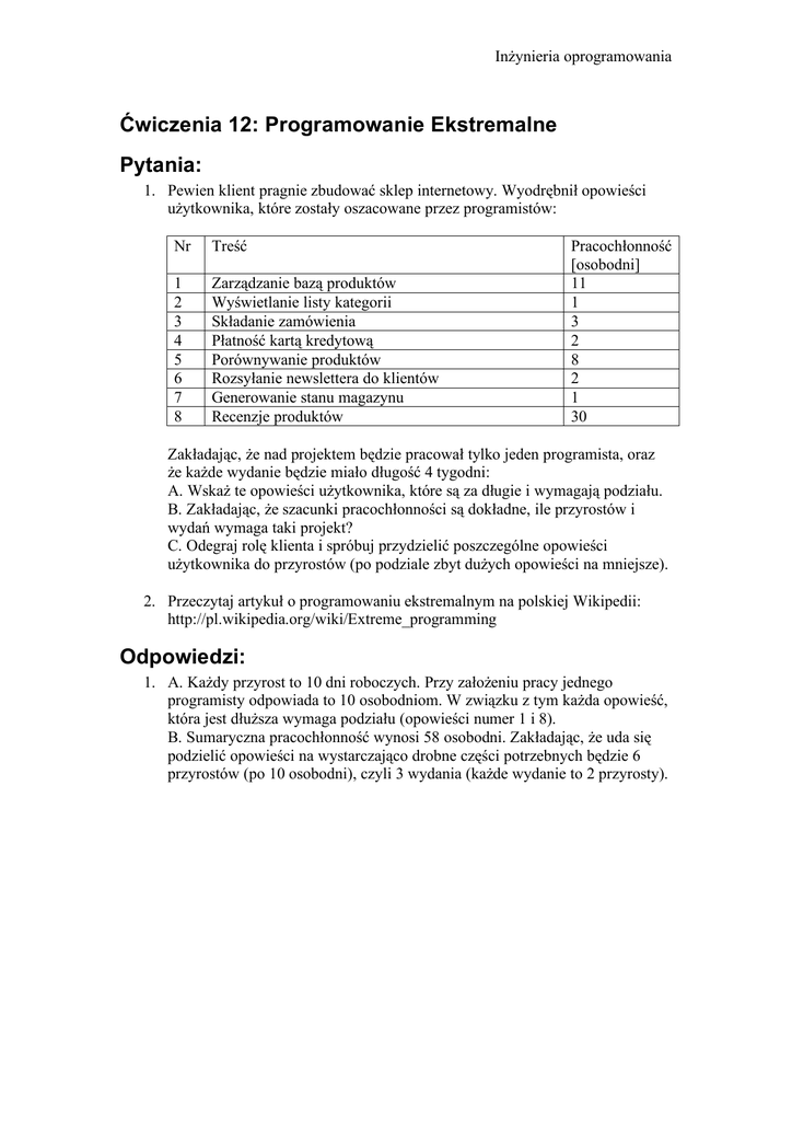 Inżynieria oprogramowania Ćwiczenia 12: Programowanie Ekstremalne Pytania: 1. Pewien klient pragnie zbudować sklep internetowy. Wyodrębnił opowieści użytkownika, które zostały oszacowane przez programistów: Nr Treść 1 2 3 4 5 6 7 8 Zarządzanie bazą produktów Wyświetlanie listy kategorii Składanie zamówienia Płatność kartą kredytową Porównywanie produktów Rozsyłanie newslettera do klientów Generowanie stanu magazynu Recenzje produktów Pracochłonność [osobodni] 11 1 3 2 8 2 1 30 Zakładając, że nad projektem będzie pracował tylko jeden programista, oraz że każde wydanie będzie miało długość 4 tygodni: A. Wskaż te opowieści użytkownika, które są za długie i wymagają podziału. B. Zakładając, że szacunki pracochłonności są dokładne, ile przyrostów i wydań wymaga taki projekt? C. Odegraj rolę klienta i spróbuj przydzielić poszczególne opowieści użytkownika do przyrostów (po podziale zbyt dużych opowieści na mniejsze). 2. Przeczytaj artykuł o programowaniu ekstremalnym na polskiej Wikipedii: http://pl.wikipedia.org/wiki/Extreme_programming Odpowiedzi: 1. A. Każdy przyrost to 10 dni roboczych. Przy założeniu pracy jednego programisty odpowiada to 10 osobodniom. W związku z tym każda opowieść, która jest dłuższa wymaga podziału (opowieści numer 1 i 8). B. Sumaryczna pracochłonność wynosi 58 osobodni. Zakładając, że uda się podzielić opowieści na wystarczająco drobne części potrzebnych będzie 6 przyrostów (po 10 osobodni), czyli 3 wydania (każde wydanie to 2 przyrosty).