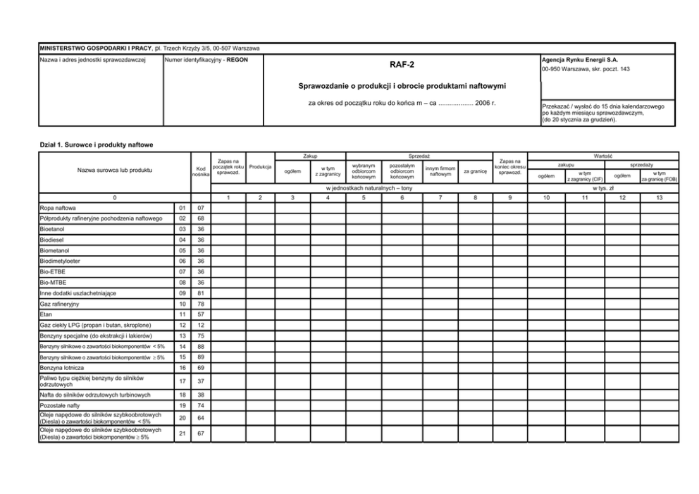 MINISTERSTWO GOSPODARKI I PRACY, pl. Trzech Krzyży 3/5, 00-507 Warszawa Nazwa i adres jednostki sprawozdawczej Numer identyfikacyjny - REGON Agencja Rynku Energii S.A. RAF-2 00-950 Warszawa, skr. poczt. 143 Sprawozdanie o produkcji i obrocie produktami naftowymi za okres od początku roku do końca m – ca ................... 2006 r. Przekazać / wysłać do 15 dnia kalendarzowego po każdym miesiącu sprawozdawczym, (do 20 stycznia za grudzień). Dział 1. Surowce i produkty naftowe Zapas na Kod początek roku sprawozd. nośnika Nazwa surowca lub produktu Zakup Produkcja ogółem Sprzedaż w tym z zagranicy wybranym odbiorcom końcowym pozostałym odbiorcom końcowym innym firmom naftowym za granicę Zapas na koniec okresu sprawozd. 7 8 9 Wartość zakupu sprzedaży ogółem w tym z zagranicy (CIF) 10 11 w jednostkach naturalnych – tony 0 1 Ropa naftowa 01 07 Półprodukty rafineryjne pochodzenia naftowego 02 68 Bioetanol 03 36 Biodiesel 04 36 Biometanol 05 36 Biodimetyloeter 06 36 Bio-ETBE 07 36 Bio-MTBE 08 36 Inne dodatki uszlachetniające 09 81 Gaz rafineryjny 10 78 Etan 11 57 Gaz ciekły LPG (propan i butan, skroplone) 12 12 Benzyny specjalne (do ekstrakcji i lakierów) 13 75 Benzyny silnikowe o zawartości biokomponentów < 5% 14 88 Benzyny silnikowe o zawartości biokomponentów ≥ 5% 15 89 Benzyna lotnicza 16 69 Paliwo typu ciężkiej benzyny do silników odrzutowych 17 37 Nafta do silników odrzutowych turbinowych 18 38 Pozostałe nafty 19 74 20 64 21 67 Oleje napędowe do silników szybkoobrotowych (Diesla) o zawartości biokomponentów < 5% Oleje napędowe do silników szybkoobrotowych (Diesla) o zawartości biokomponentów ≥ 5% 2 3 4 5 6 ogółem w tym za granicę (FOB) 12 13 w tys. zł Dział 1. Surowce i produkty naftowe (cd.) Zapas na Kod początek roku sprawozd. nośnika Nazwa surowca lub produktu Zakup Produkcja ogółem Sprzedaż w tym z zagranicy wybranym odbiorcom końcowym pozostałym odbiorcom końcowym innym firmom naftowym za granicę Zapas na koniec okresu sprawozd. 7 8 9 Wartość zakupu sprzedaży ogółem w tym z zagranicy (CIF) 10 11 w jednostkach naturalnych – tony 0 1 Oleje napędowe do silników wolno- i średnioobrotowych (paliwo żeglugowe) 22 10 Oleje opałowe lekkie 23 96 Oleje opałowe ciężkie niskosiarkowe (< 1% ) 24 98 Oleje opałowe ciężkie wysokosiarkowe ( > 1% ) 25 99 Pozostałości olejów ropy naftowej (Gudron) 26 59 Benzyny do pirolizy 27 76 Oleje silnikowe 28 71 Oleje i preparaty smarowe 29 82 Asfalty z przerobu ropy naftowej 30 73 Wazelina, parafina, woski pochodzenia naftowego 31 72 Koks naftowy 32 58 Benzole surowe 33 52 Siarka 34 55 Pozostałe produkty naftowe 35 77 Oleje odpadowe - przepracowane 36 22 2 3 4 5 6 38 39 40 41 42 Uwaga: w wolnych wierszach wpisać inne występujące produkty. (imię, nazwisko i telefon osoby która sporządziła sprawozdanie) ............................................................. (miejscowość, data) w tym za granicę (FOB) w tys. zł. 37 .............................................................. ogółem .................................................................... (pieczątka imienna i podpis osoby działającej w imieniu sprawozdawcy) 12 13 Dział 2. Import i nabycie wewnątrzwspólnotowe produktów naftowych Kraj pochodzenia Ropa naftowa kod 07 Gaz ciekły kod 12 Benzyny silnikowe kod 88 Benzyna lotnicza kod 69 0 1 2 3 4 Paliwa do silników odrzutowych benzynowe kod 37 naftowe kod 38 Olej napędowy kod 64 Lekki olej opałowy kod 96 7 8 Ciężki olej opałowy o zawartości <1% siarki kod 98 >1% siarki kod 99 9 10 w jednostkach naturalnych - tony 01 Kraje spoza Unii Europejskiej 02 03 04 05 06 07 08 09 10 11 12 13 Kraje Unii Europejskiej 14 15 16 17 18 19 20 21 22 5 6 Dział 3. Eksport i dostawa wewnątrzwspólnotowa produktów naftowych Kraj docelowy Ropa naftowa kod 07 Gaz ciekły kod 12 Benzyny silnikowe kod 88 Benzyna lotnicza kod 69 1 2 3 4 Paliwa do silników odrzutowych benzynowe kod 37 naftowe kod 38 Olej napędowy kod 64 Lekki olej opałowy kod 96 7 8 Ciężki olej opałowy o zawartości <1% siarki kod 98 >1% siarki kod 99 9 10 w jednostkach naturalnych - tony 0 5 6 01 02 Kraje spoza Unii Europejskiej 03 04 05 06 07 08 09 10 11 12 13 Kraje Unii Europejskiej 14 15 16 17 18 19 20 21 22 .............................................................. (imię, nazwisko i telefon osoby która sporządziła sprawozdanie) ............................................................. (miejscowość, data) .................................................................... (pieczątka imienna i podpis osoby działającej w imieniu sprawozdawcy) Dział 4. Import i nabycie wewnątrzwspólnotowe ropy naftowej Typ ropy naftowej (zakres gęstości wg API) Kraj pochodzenia 1 01 Ural (31-32.5) 02 Pozostała ropa rosyjska Azerbejdżan 03 Kazachstan 04 Ukraina 05 Pozostałe kraje byłego ZSRR 06 Dania 07 (33-34.5) Norwegia 08 Statfjord (37.5-38) 09 Gullfaks (29.3-29.8) 10 Oseberg (34) 11 Ekofisk (43.4) EUROPA Kraje byłego ZSRR 0 Rosja Wielka Brytania *) 12 Pozostała ropa norweska 13 Brent Blend (37-38) 14 Forties (39-40) 15 Flotta (34.7) 16 Pozostała ropa brytyjska Wielkość zakupu z zagranicy Wartość zakupu z zagranicy ***) Gęstość wg API Zawartość siarki tony baryłki tys. zł tys. USD - % 2 3 4 5 6 7 x x Pozostałe kraje 17 18 19 20 21 OGÓŁEM **) 22 X *) Dział 4 wypełniają tylko zakupujący ropę naftową za granicą. **) Wielkość i wartość w pozycji OGÓŁEM muszą być zgodne z wielkością i wartością zakupu z zagranicy ropy naftowej wykazanymi w Dziale 1. ***) Wartość zakupu z zagranicy należy podać w cenach CIF (cena z kosztami ubezpieczenia i transportu). .............................................................. (imię, nazwisko i telefon osoby która sporządziła sprawozdanie) ............................................................. (miejscowość, data) .................................................................... (pieczątka imien