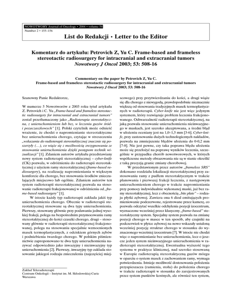 NOWOTWORY Journal of Oncology • 2004 • volume 54 Number 2 • 155–156 List do Redakcji • Letter to the Editor Komentarz do artyku∏u: Petrovich Z, Yu C. Frame-based and frameless stereotactic radiosurgery for intracranial and extracranial tumors Nowotwory J Oncol 2003; 53: 508-16 Commentary on the paper by Petrovich Z, Yu C. Frame-based and frameless stereotactic radiosurgery for intracranial and extracranial tumors Nowotwory J Oncol 2003; 53: 508-16 Szanowny Panie Redaktorze, W numerze 5 Nowotworów z 2003 roku tytu∏ artyku∏u Z. Petrovich i C. Yu „Frame-based and frameless stereotactic radiosurgery for intracranial and extracranial tumors” zosta∏ przet∏umaczony jako „Radioterapia stereotaktyczna, z unieruchomieniem lub bez, w leczeniu guzów Êródi pozaczaszkowych” [1]. Polski czytelnik mo˝e odnieÊç wra˝enie, ˝e chodzi o napromienianie stereotaktyczne bez unieruchomienia chorego, czytajàc w streszczeniu „wskazania do radioterapii stereotaktycznej znacznie si´ poszerzy∏y (…), co wià˝e si´ z mo˝liwoÊcià zrezygnowania ze stosowania unieruchomienia dzi´ki post´pom technik wizualizacji” [1]. Zdaniem autorów artyku∏u przedstawiany nowy system radioterapii stereotaktycznej – cyber-knife (CK) pozwala, w odró˝nieniu do radioterapii stereotaktycznej z u˝yciem ramy stereotaktycznej (frame-based radiosurgery), na realizacj´ napromieniania w wi´kszym komforcie dla chorego, bez stosowania Êrodków znieczulajàcych miejscowo lub ogólnie. Zdaniem autorów ten system radioterapii stereotaktycznej pozwala na stosowanie radioterapii frakcjonowanej w odró˝nieniu od „frame-based radiosurgery” [1]. W istocie ka˝dy typ radioterapii zak∏ada jakiÊ typ unieruchomienia chorego. Obecnie w radioterapii stereotaktycznej stosowane sà dwa typy unieruchomienia. Pierwszy, stosowany g∏ównie przy podawaniu jednej wysokiej frakcji, polega na bezpoÊrednim przymocowaniu ramy stereotaktycznej do koÊci czaszki chorego, drugi – stosowany g∏ównie w radioterapii stereotaktycznej frakcjonowanej, polega na stosowaniu specjalnie wzmocnionych masek termoplastycznych, z odciskiem górnych z´bów i podniebienia twardego chorego. W polskim piÊmiennictwie zaproponowano te dwa typy unieruchomienia nazywaç odpowiednio jako inwazyjny i nieinwazyjny typ unieruchomienia [2]. Pierwszy, inwazyjny typ zak∏ada stosowanie jakiegoÊ rodzaju znieczulenia (najcz´Êciej miej- Zak∏ad Teleradioterapii Centrum Onkologii – Instytut im. M. Sk∏odowskiej-Curie Warszawa scowego) przy przytwierdzaniu do koÊci, a drugi wià˝e si´ dla chorego z niewygodà, prawdopodobnie nieznacznie wi´kszà od stosowania tradycyjnych masek termoplastycznych w radioterapii. Cyber-knife nie jest wi´c jedynym systemem, który rozwiàzuje problem leczenia frakcjonowanego. OdtwarzalnoÊç radioterapii stereotaktycznej, na jakà pozwala stosowanie unieruchomienia nieinwazyjnego w maskach, jest szeroko akceptowana, a Êredni b∏àd w u∏o˝eniu oceniany jest na 1,0–1,5 mm [3-6]. Cyber-knife, przy zastosowaniu du˝ych technologicznych nak∏adów, pozwala na zmniejszenie b∏´dów u∏o˝enia do 0-0,2 mm [7-8]. Nie jest pewne, czy taka poprawa b∏´du u∏o˝enia mo˝e si´ prze∏o˝yç na popraw´ wyników leczenia, szczególnie w przypadku chorób nowotworowych, w których wspó∏czesne metody obrazowania nie sà w stanie okreÊliç z takà precyzjà granic zmiany chorobowej. W przedstawionym przez autorów „frameless SRS” dokonano rozdzia∏u lokalizacji stereotaktycznej przy zastosowaniu ramy z pud∏em stereotaktycznym w trakcie planowania i pierwszej frakcji leczenia, z nast´powym unieruchomieniem chorego w trakcie napromieniania przy pomocy indywidualnie wykonanej maski, ju˝ bez ramy stereotaktycznej, lecz z obecnoÊcià „bite plate” – rodzaju p∏ytki z´bowej. Zawiera ona 6 diod emitujàcych promieniowanie podczerwone, rejestrowane przez kamer´, co pozwala odczytaç wszelkie odchylenia pozycji izocentrum, wyznaczone wczeÊniej przez klasyczny „frame-based” stereotaktyczny system. Specjalny system pozwala na zmian´ pozycji chorego w masce w ten sposób, aby czujniki na podczerwieƒ w p∏ytce z´bowej na nowo wskaza∏y ustalonà wczeÊniej pozycj´ struktur chorego w stosunku do wyznaczonego wczeÊniej izocentrum [7]. W istocie nie chodzi wi´c o napromienianie bez unieruchomienia, lecz o jeszcze jeden system nieinwazyjnego unieruchomienia w radioterapii stereotaktycznej. Ewentualna wy˝szoÊç tego systemu w praktyce klinicznej, nad szeroko stosowanà w Europie radioterapià stereotaktycznà guzów mózgu w oparciu o system masek z zachowaniem ramy, wymaga potwierdzenia. Istnieje mo˝liwoÊç dostosowania po∏o˝enia przyspieszacza (ramienia, sto∏u) do po∏o˝enia chorego w trakcie radioterapii w stosunku do zarejestrowanych przez system punktów kostnych, ale równie˝ ten system, 156 jakkolwiek bez ramy stereotaktycznej, zak∏ada (nieinwazyjne) unieruchomienie chorego, aby proces napromieniania przebiega∏ sprawnie [9]. OczywiÊcie, mo˝liwoÊç zastosowania tego systemu do lokalizacji pozaczaszkowych jest interesujàca. Obecnie istnieje jednak wiele systemów napromieniania stereotaktycznego, opartych na wykorzystaniu, sprz´˝onych z systemem kamer, czujników umieszczonych na ciele chorego. Wszystkie one zak∏adajà jednak jakiÊ system unieruchomienia chorego, aby proces napromieniania móg∏ byç przeprowadzany sprawnie, a ewentualne zmiany u∏o˝enia chorego czy guza wynika∏y z przyczyn, które trudno poddawaç kontroli przy stosowaniu tradycyjnych technik. Dr n. med. Lucyna K´pka Zak∏ad Teleradioterapii Centrum Onkologii – Instytut im. M. Sk∏odowskiej–Curie ul. Roentgena 5 02-781 Warszawa PiÊmiennictwo 1. Petrovich Z, Yu C. Frame-based and frameless stereotactic radiosurgery for intracranial and extracranial tumors. Nowotwory J Oncol 2003; 53: 508-16. 2. Fijuth J, Kepka L. Stereotactic radiotherapy of central nervous system