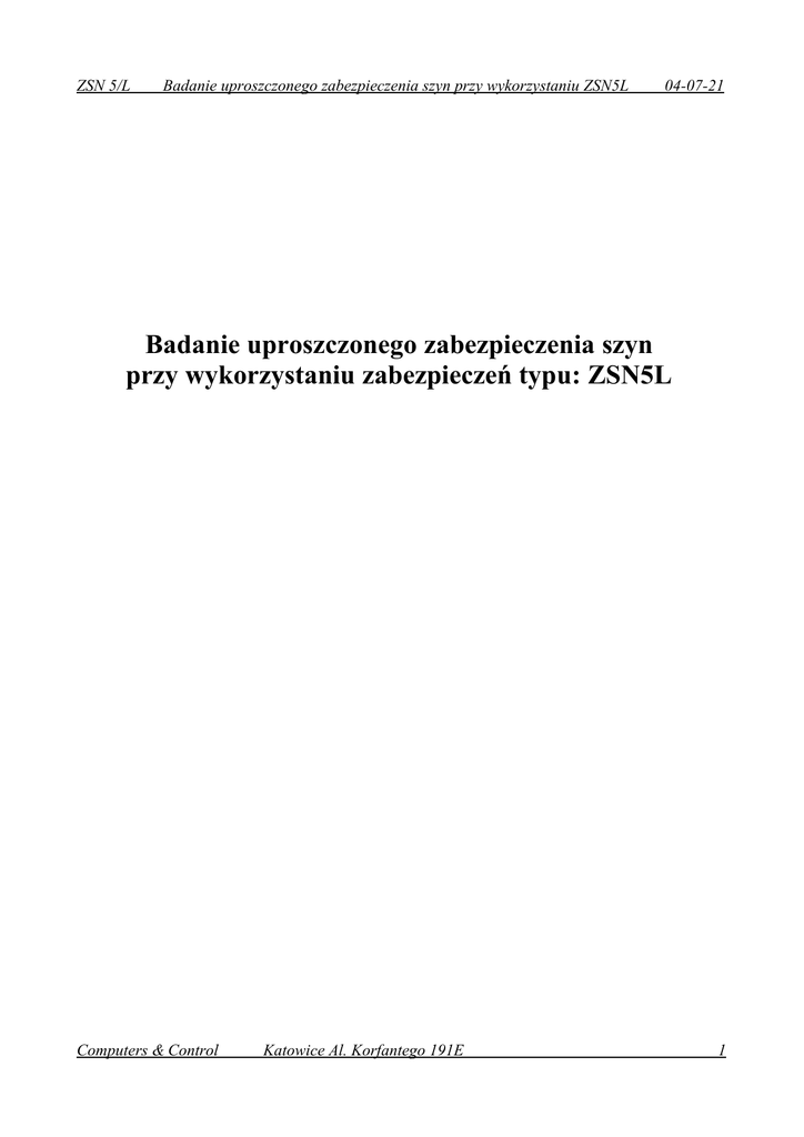 ZSN 5/L Badanie uproszczonego zabezpieczenia szyn przy wykorzystaniu ZSN5L 04-07-21 Badanie uproszczonego zabezpieczenia szyn przy wykorzystaniu zabezpieczeń typu: ZSN5L Computers & Control Katowice Al. Korfantego 191E 1 ZSN 5/L Badanie uproszczonego zabezpieczenia szyn przy wykorzystaniu ZSN5L 04-07-21 1. Wstęp W rozdzielniach SN zwykle nie stosuje się odzielnych zabezpieczeń szyn. Najczęściej stosuje się metodę uproszczonego zabezpieczenia szyn. Polega ona na blokowaniu szybkiego stopnia nadprądowego w polu transforamtora oraz łącznika szyn przez odpływy liniowe danych sekcji. Celem takiej metody jest minimalizacja czasu „trzymania” zwarcia na szynach z jednoczesnym zachowaniem selektywności wyłączeń. Tak więc o czasie nastawy stopnia nadprądowego w polu transformatora decyduje tylko czas od chwili pobudzenia stopnia nadprądowego w polu liniowym do chwili przyblokowania szybkiego stopnia nadprądowego w polu transformatora. Schemat stanowiska: Ze względu na to, iż wspomniany wcześniej czas zwłoki jest cechą danych zabezpieczeń postanowiliśmy przeprowadzić takie badania, wykorzystując w tym celu wbudowane standardowo we wszystkich rodzajach zabezpieczeń naszej firmy rejestratory zakłóceń oraz zdarzeń. Zostało zmontowane, zgodnie ze schematem przedstawionym obok, stanowisko widoczne na zamieszczonym zdjęciu. Nastawy ZSN5L w polu transformatora: I1> : Zdjęcie stanowiska: I = 1In (5A); T = 80ms; I2> : I = 1In (5A); T =30ms; blokowany z wejścia dwustanowego sygnałem od pobudzenia I1> w polu linowym; Nastawy ZSN5L w polu liniowym: I1> : I = 1In (5A); T = 30ms; W tak zmontowanym układzie oraz nastawach został wymuszony prąd ponad 5A. Computers & Control Katowice Al. Korfantego 191E 2 ZSN 5/L Badanie uproszczonego zabezpieczenia szyn przy wykorzystaniu ZSN5L 04-07-21 2. Zwarcie w linii odpływowej. (cykl poprawny) Prąd zwarciowy jest widoczny przez obydwa zabezpieczenia typu: ZSN5L. Ze względu na jednakowe nastawy prądowe, wszystkie stopnie nadprądowe pobudzają się w jednej chwili. Zabezpieczenie ZSN5L w polu liniowym wysyła sygnał blokady (funkcja wyjściowa: pobudzenie I1>) poprzez przekaźnik programowalny PU 4 do ZSN5L w polu transformatora (sterując funkcją wejściową: gotowość stopnia I1>) poprzez wejście dwustanowe RZK 1. Zabezpieczenie w polu transformatora, po przyjęciu sygnału blokuje stopień I1> (stopień nadprądowy szybki). Po upływie nastawionego czasu 50ms ZSN5L w polu liniowym daje sygnał WYŁĄCZ na swój wyłącznik likwidując przez to zwarcie. Przebieg czasowy z cyklu oraz dzienniki zabezpieczeń pokazane są poniżej. Czas pomiędzy pobudzeniem stopnia I1> w polu liniowym a blokadą stopnia I1> w polu transformatora wynosi 24ms. Tak więc pozostawiony margines czasu wynosi: 6ms. Rejestrator zakłóceń w zabezpieczeniu ZSN5L w polu liniowym Dziennik zdarzeń zabezpieczenia ZSN5L w polu liniowym 16:49:13.184 Pobudzenie stopnia 1. modułu nadprądowego 16:49:13.206 Pobudzenie fazy R 16:49:13.214 Zwarcie fazy R === W Y Ł Ą C Z A N I E === Prąd pętli zwarciowej : 13.8473 [A] Start stopnia 1. modułu nadprądowego Wyłączanie od modułu nadprądowego 16:49:13.243 Koniec pobudzenia fazy R Koniec pobudzenia stopnia 1. modułu nadprądow Koniec startu stopnia 1. modułu nadprądowego Koniec wyłączania od modułu nadprądowego 16:49:13.275 K O N I E C === W Y Ł Ą C Z A N I A === Rejestrator zakłóceń w zabezpieczeniu ZSN5L w polu transformatora Dziennik zdarzeń zabezpieczenia ZSN5L w polu transformatora 16:49:13.183 Pobudzenie fazy R Pobudzenie stopnia 1. modułu nadprądowego Pobudzenie stopnia 2. modułu nadprądowego 16:49:13.207 Koniec pobudzenia stopnia 1. modułu nadprądowego Blokada stopnia 1. modułu nadprądowego 16:49:13.240 Koniec pobudzenia fazy R Koniec pobudzenia stopnia 2. modułu nadprądowego 16:49:13.261 Koniec blokady stopnia 1. modułu nadprądowego Computers & Control Katowice Al. Korfantego 191E 3 ZSN 5/L Badanie uproszczonego zabezpieczenia szyn przy wykorzystaniu ZSN5L 04-07-21 3. Zwarcie w linii odpływowej. (brak wyłączenia pola liniowego - cykl niepoprawny) Prąd zwarciowy jest widoczny przez obydwa zabezpieczenia typu: ZSN5L. Ze względu na jednakowe nastawy prądowe, wszystkie stopnie nadprądowe pobudzają się w jednej chwili. Zabezpieczenie ZSN5L w polu liniowym wysyła sygnał blokady (funkcja wyjściowa: pobudzenie I1>) poprzez przekaźnik programowalny PU 4 do ZSN5L w polu transformatora (sterując funkcją wejściową: gotowość stopnia I1>) poprzez wejście dwustanowe RZK 1. Zabezpieczenie w polu transformatora, po przyjęciu sygnału blokuje stopień I1> (stopień nadprądowy szybki). Po upływie nastawionego czasu 30ms ZSN5L w polu liniowym daje sygnał WYŁĄCZ na swój wyłącznik. Wyłącznik nie wyłącza (np. uszkodzony), a tym samym nie likwiduje zwarcia. Po czasie 80ms od pobudzenia ZSN5L w polu transformatora daje sygnał WYŁĄCZ na swój wyłącznik likwidując zwarcie. Przebieg czasowy z cyklu oraz dzienniki zabezpieczeń pokazane są poniżej. Rejestrator zakłóceń w zabezpieczeniu ZSN5L w polu liniowym Dziennik zdarzeń zabezpieczenia ZSN5L w polu liniowym 18:18:22.389 Pobudzenie stopnia 1. modułu nadprądowego 18:18:22.410 Pobudzenie fazy R 18:18:22.420 Zwarcie fazy R === W Y Ł Ą C Z A N I E === Prąd pętli zwarciowej : 13.8854 [A] Start stopnia 1. modułu nadprądowego Wyłączanie od modułu nadprądowego 18:18:22.500 Koniec pobudzenia stopnia 1. modułu nadprądowego Koniec startu stopnia 1. modułu nadprądowego Koniec wyłączania od modułu nadprądowego 18:18:22.503 Koniec pobudzenia fazy R 18:18:22.533 K O N I E C === W Y Ł Ą C Z A N I A === Rejestrator zakłóceń w zabezpieczeniu ZSN5L w polu transformatora Dziennik zdarzeń zabezpieczenia ZSN5L w polu transformatora 18:18:22.385 Pobudzenie fazy R 18:18:22.388 Pobudzenie stopnia 1. modułu nadprądowego Pobudzenie stopnia 2. modułu nadprądowego 18:18:22.409 Koniec pobudzenia stopni