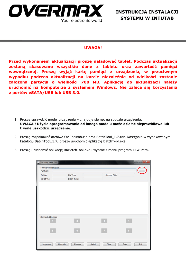 INSTRUKCJA INSTALACJI SYSTEMU W INTUTAB UWAGA! Przed wykonaniem aktualizacji proszę naładować tablet. Podczas aktualizacji zostaną skasowane wszystkie dane z tabletu oraz zawartość pamięci wewnętrznej. Proszę wyjąć kartę pamięci z urządzenia, w przeciwnym wypadku podczas aktualizacji na karcie niezależnie od wielkości zostanie założona partycja o wielkości 700 MB. Aplikację do aktualizacji należy uruchomić na komputerze z systemem Windows. Nie zaleca się korzystania z portów eSATA/USB lub USB 3.0. 1. Proszę sprawdzić model urządzenia – znajduje się np. na spodzie urządzenia. UWAGA ! Użycie oprogramowania od innego modelu może działać nieprawidłowo lub trwale uszkodzić urządzenie. 2. Proszę rozpakować archiwa OV-Intutab.zip oraz BatchTool_1.7.rar. Następnie w wypakowanym katalogu BatchTool_1.7, proszę uruchomić aplikację BatchTool.exe. 3. Proszę uruchomić aplikację RKBatchTool.exe i wybrać z menu programu FW Path. 4. Proszę wskazać rozpakowany plik OV-Intutab.img 5. Okno programu po dodaniu pliku z obrazem oprogramowania – proszę nie zamykać. 6. Upewniamy się, że tablet jest wyłączony. Przytrzymujemy przycisk VOLUME -. Następnie nie zwalniając przycisku VOLUME - podłączamy urządzenie do komputera za pomocą kabla microUSB. Jeżeli komputer nie wykryje urządzenia, a tablet włączy się lub pojawi się ikona ładowania należy dodatkowo wcisnąć przycisk RESET. Przy tej operacji należy cały czas trzymać przycisk VOLUME - , a urządzenie musi być połączone z komputerem. 7. System operacyjny wykryje nowy sprzęt. W tym momencie można zwolnić przycisk VOLUME -. System Windows poprosi o sterowniki do urządzenia, należy wskazać pliki sterownika np. c:\ BatchTool_1.7 \Driver. 8. Następnie w oknie programu BatchTool_1.7 zaświeci się na zielono ikona z nr 1, należy wcisnąć przycisk UPGRADE i czekać na zakończenie aktualizacji systemu operacyjnego w urządzeniu. 9. Po zakończeniu aktualizacji proszę odłączyć urządzenie od komputera i włączyć je w celu pierwszego uruchomienia systemu. Może ono potrwać do 5 minut. W tym czasie proszę nie wykonywać żadnych prac na tablecie aż do pojawienia się standardowego pulpitu. [email protected] www.overmax.pl