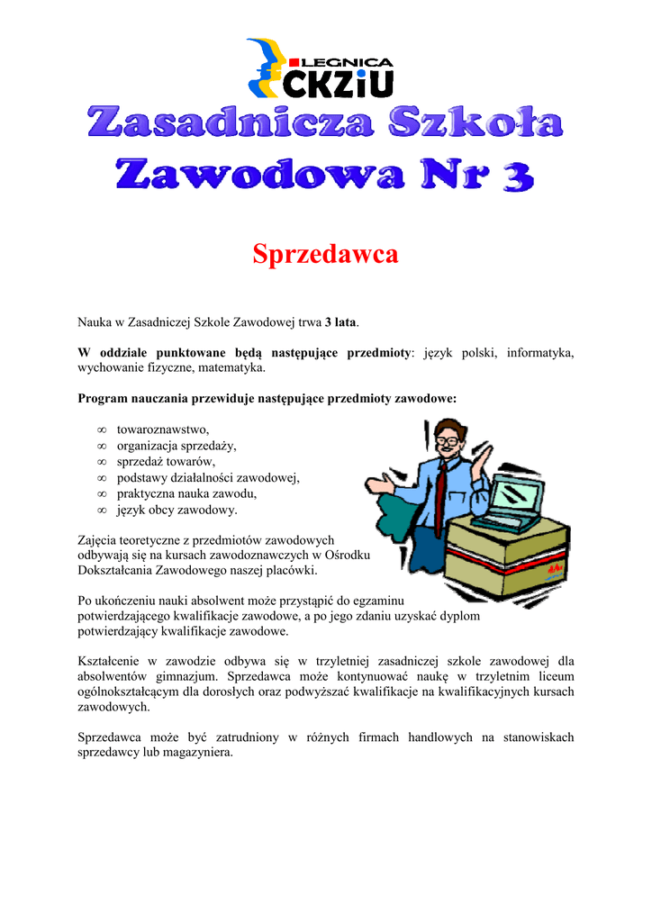 Sprzedawca Nauka w Zasadniczej Szkole Zawodowej trwa 3 lata. W oddziale punktowane będą następujące przedmioty: język polski, informatyka, wychowanie fizyczne, matematyka. Program nauczania przewiduje następujące przedmioty zawodowe: • • • • • • towaroznawstwo, organizacja sprzedaży, sprzedaż towarów, podstawy działalności zawodowej, praktyczna nauka zawodu, język obcy zawodowy. Zajęcia teoretyczne z przedmiotów zawodowych odbywają się na kursach zawodoznawczych w Ośrodku Dokształcania Zawodowego naszej placówki. Po ukończeniu nauki absolwent może przystąpić do egzaminu potwierdzającego kwalifikacje zawodowe, a po jego zdaniu uzyskać dyplom potwierdzający kwalifikacje zawodowe. Kształcenie w zawodzie odbywa się w trzyletniej zasadniczej szkole zawodowej dla absolwentów gimnazjum. Sprzedawca może kontynuować naukę w trzyletnim liceum ogólnokształcącym dla dorosłych oraz podwyższać kwalifikacje na kwalifikacyjnych kursach zawodowych. Sprzedawca może być zatrudniony w różnych firmach handlowych na stanowiskach sprzedawcy lub magazyniera.