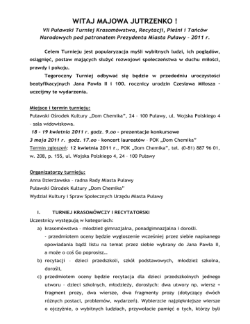 WITAJ MAJOWA JUTRZENKO ! VII Puławski Turniej Krasomówstwa, Recytacji, Pieśni i Tańców Narodowych pod patronatem Prezydenta Miasta Puławy – 2011 r. Celem Turnieju jest popularyzacja myśli wybitnych ludzi, ich poglądów, osiągnięć, postaw mających słuŜyć rozwojowi społeczeństwa w duchu miłości, prawdy i pokoju. Tegoroczny Turniej odbywać się będzie w przededniu uroczystości beatyfikacyjnych Jana Pawła II i 100. rocznicy urodzin Czesława Miłosza – uczcijmy te wydarzenia. Miejsce i termin turnieju: Puławski Ośrodek Kultury „Dom Chemika”, 24 – 100 Puławy, ul. Wojska Polskiego 4 – sala widowiskowa. 18 – 19 kwietnia 2011 r. godz. 9.oo – prezentacje konkursowe 3 maja 2011 r. godz. 17.oo – koncert laureatów – POK „Dom Chemika” Termin zgłoszeń: 12 kwietnia 2011 r., POK „Dom Chemika”, tel. (0-81) 887 96 01, w. 208, p. 155, ul. Wojska Polskiego 4, 24 – 100 Puławy Organizatorzy turnieju: Anna DzierŜawska – radna Rady Miasta Puławy Puławski Ośrodek Kultury „Dom Chemika” Wydział Kultury i Spraw Społecznych Urzędu Miasta Puławy I. TURNIEJ KRASOMÓWCZY I RECYTATORSKI Uczestnicy występują w kategoriach: a) krasomówstwa – młodzieŜ gimnazjalna, ponadgimnazjalna i dorośli. - przedmiotem oceny będzie wygłoszenie wcześniej przez siebie napisanego opowiadania bądź listu na temat przez siebie wybrany do Jana Pawła II, a moŜe o coś Go poprosisz… b) recytacji – dzieci przedszkoli, szkół podstawowych, młodzieŜ szkolna, dorośli, c) przedmiotem oceny będzie recytacja dla dzieci przedszkolnych jednego utworu – dzieci szkolnych, młodzieŜy, dorosłych: dwa utwory np. wiersz + fragment prozy, dwa wiersze, dwa fragmenty prozy (dotyczący dwóch róŜnych postaci, problemów, wydarzeń). Wybierzcie najpiękniejsze wiersze o ojczyźnie, o wybitnych ludziach, przywołacie pamięć o tych, którzy byli wiernymi synami i córkami Polski by głosić, szerzyć i czynić dobro – jak zawsze postępował Jan Paweł II. Wybierzcie humorystyczne scenki z Ŝycia Jana Pawła II z ksiąŜki pt. „Uśmiech Jana Pawła II” – ks. Kazimierza Pielatowskiego (i innych jest wiele). Sięgnijcie po twórczość Cz. Miłosza, wybierzcie te utwory, które są zrozumiałe i dostosowane do wieku. II. PRZEGLĄD MAŁYCH FORM TEATRALNYCH: montaŜ słowno – muzyczny ( moŜe nawiązywać do 3 maja lub montaŜ oparty na wspomnieniach o Janie Pawle II np. montaŜ przy „pozornym” ognisku, przy wprowadzeniu choć jednego utworu Miłosza) – czas do 25 min. III. TURNIEJ PIEŚNI NARODOWYCH Uczestnicy będą oceniani w kategoriach: - soliści, - zespoły wokalne, - zespoły wokalno - instrumentalne - zespoły rodzinne - chóry (uczestnicy przygotowują 2 pieśni) IV. TURNIEJ TAŃCA NARODOWEGO Ocenie będzie podlegać wykonanie jednego z wymienionych tańców: polonez, krakowiak. a) w grupie przedszkolnej i szkół podstawowych moŜe być taniec ludowy z przyśpiewką. V. KaŜda z kategorii artystycznych oceniana będzie w grupie wiekowej: a) dzieci przedszkolne b) dzieci szkół podstawowych c) młodzieŜ szkolna d) dorośli VI. Jury będzie brać pod uwagę dobór repertuaru do moŜliwości wykonawczych uczestników, poprawność wykonywania i ogólny wyraz artystyczny. - Organizatorzy zapewniają reklamę imprezy, sprzęt nagłaśniający oraz jego obsługę podczas turnieju, moŜliwość korzystania z fortepianu. Pozostałe instrumenty wykonawcy zapewniają sobie we własnym zakresie. - Uczestnicy spoza Puław przyjeŜdŜają na koszt własny - Uczestnicy otrzymują pamiątkowe dyplomy, a laureaci nagrody. - Informacja o kolejności występowania jak równieŜ o moŜliwości próby w dniach poprzedzających turniej i koncercie laureatów moŜna uzyskać w POK „Dom Chemika” w pok. 155 lub telefonicznie (081) 887 96 01, p. Anna Grądziel. Termin zgłoszeń do 12 kwietnia 2011 r. Pragniemy zaprosić do turnieju wszystkich nauczycieli przygotowujących montaŜ słowno- muzyczny z okazji 3 Maja w szkołach. Zaproście rodziców swoich uczniów by mogli zobaczyć swoje dzieci na duŜej scenie. Organizatorzy proszą o przeprowadzenie eliminacji środowiskowych w dziedzinie recytacji. W doborze repertuaru kierujmy się myślą „co chciałabym – chciałbym opowiedzieć, zarecytować, poprosić, zaśpiewać, zatańczyć Janowi Pawłowi II” – by przywołać pamięć i uczcić największego z Polaków. Propozycje do repertuaru pieśni: (wybraliśmy ulubione piosenki Jana Pawłą II) 1. „Prząśniczka”- muz. S. Moniuszko 2. „Pieśń wieczorna” – muz. S. Moniuszko 3. „Góralu, czy ci nie Ŝal” – słowa: M. Bałucki 4. „Czerwony pas” – słowa: J. Korzeniowski 5. „Jak długo w sercach naszych” – muz. Ks. Władysław Piętkiewicz 6. „Witaj majowa jutrzenko” – muz. F. Chopin 7. „Harcerska dola” (Z miejsca na miejsce…) – sł. Michalina Czajkówna – Mrazek 8. „Płonie ognisko i szumią knieje” – muz. J. Braun 9. „O Panie BoŜe, Ojcze nasz” – modlitwa harcerska 10.„Płonie ognisko w lesie” – muz. i sł. A. Kowalski 11.„Morze, nasze morze” – muz . i sł. A. Kowalski 12.„Pod Ŝaglami „Zawiszy” – sł. Marusia Bukarówna, muz. autor nieznany 13.„Płynie Wisła, płynie po polskiej krainie” – sł. E. Wasilewski 14.„Wieczorny dzwon” – muz. S. Moniuszko, sł. T. Moore 15.„Upływa szybko Ŝycie” – tekst i muzyka ks. F. Leśniak _________________________________________________________________ 16. „Puławianka” – z ksiąŜki M. Strzemskiego
