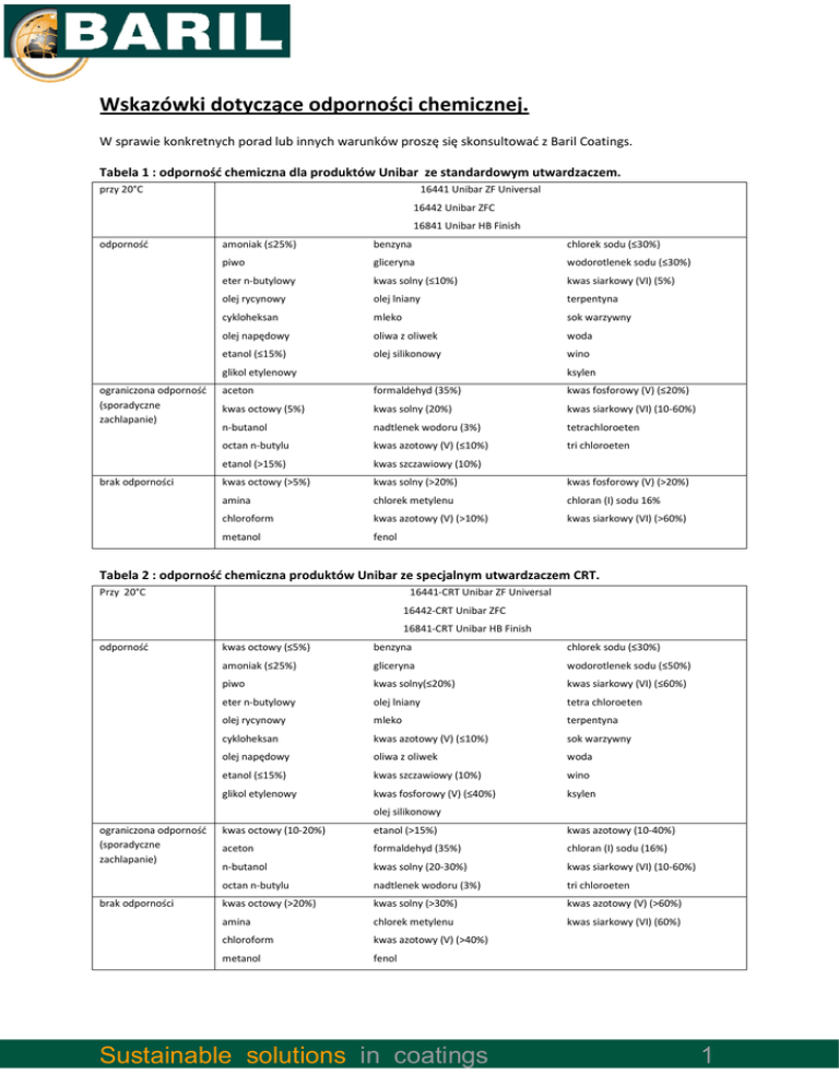 Wskazówki dotyczące odporności chemicznej. W sprawie konkretnych porad lub innych warunków proszę się skonsultować z Baril Coatings. Tabela 1 : odporność chemiczna dla produktów Unibar ze standardowym utwardzaczem. przy 20°C 16441 Unibar ZF Universal 16442 Unibar ZFC 16841 Unibar HB Finish odporność amoniak (≤25%) benzyna chlorek sodu (≤30%) piwo gliceryna wodorotlenek sodu (≤30%) eter n-butylowy kwas solny (≤10%) kwas siarkowy (VI) (5%) olej rycynowy olej lniany terpentyna cykloheksan mleko sok warzywny olej napędowy oliwa z oliwek woda etanol (≤15%) olej silikonowy wino glikol etylenowy ograniczona odporność (sporadyczne zachlapanie) brak odporności ksylen aceton formaldehyd (35%) kwas fosforowy (V) (≤20%) kwas octowy (5%) kwas solny (20%) kwas siarkowy (VI) (10-60%) n-butanol nadtlenek wodoru (3%) tetrachloroeten octan n-butylu kwas azotowy (V) (≤10%) tri chloroeten etanol (>15%) kwas szczawiowy (10%) kwas octowy (>5%) kwas solny (>20%) kwas fosforowy (V) (>20%) amina chlorek metylenu chloran (I) sodu 16% chloroform kwas azotowy (V) (>10%) kwas siarkowy (VI) (>60%) metanol fenol Tabela 2 : odporność chemiczna produktów Unibar ze specjalnym utwardzaczem CRT. Przy 20°C 16441-CRT Unibar ZF Universal 16442-CRT Unibar ZFC 16841-CRT Unibar HB Finish odporność kwas octowy (≤5%) benzyna chlorek sodu (≤30%) amoniak (≤25%) gliceryna wodorotlenek sodu (≤50%) piwo kwas solny(≤20%) kwas siarkowy (VI) (≤60%) eter n-butylowy olej lniany tetra chloroeten olej rycynowy mleko terpentyna cykloheksan kwas azotowy (V) (≤10%) sok warzywny olej napędowy oliwa z oliwek woda etanol (≤15%) kwas szczawiowy (10%) wino glikol etylenowy kwas fosforowy (V) (≤40%) ksylen olej silikonowy ograniczona odporność (sporadyczne zachlapanie) brak odporności kwas octowy (10-20%) etanol (>15%) kwas azotowy (10-40%) aceton formaldehyd (35%) chloran (I) sodu (16%) n-butanol kwas solny (20-30%) kwas siarkowy (VI) (10-60%) octan n-butylu nadtlenek wodoru (3%) tri chloroeten kwas octowy (>20%) kwas solny (>30%) kwas azotowy (V) (>60%) amina chlorek metylenu kwas siarkowy (VI) (60%) chloroform kwas azotowy (V) (>40%) metanol fenol Sustainable solutions in coatings 1