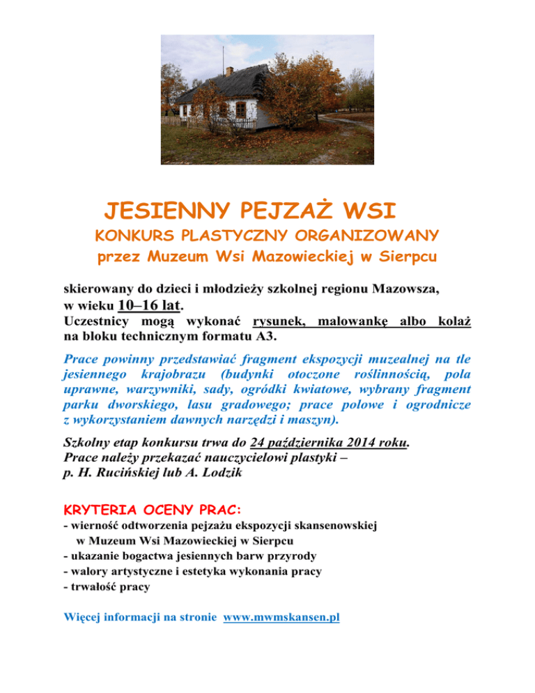 JESIENNY PEJZAŻ WSI KONKURS PLASTYCZNY ORGANIZOWANY przez Muzeum Wsi Mazowieckiej w Sierpcu skierowany do dzieci i młodzieży szkolnej regionu Mazowsza, w wieku 10–16 lat. Uczestnicy mogą wykonać rysunek, malowankę albo kolaż na bloku technicznym formatu A3. Prace powinny przedstawiać fragment ekspozycji muzealnej na tle jesiennego krajobrazu (budynki otoczone roślinnością, pola uprawne, warzywniki, sady, ogródki kwiatowe, wybrany fragment parku dworskiego, lasu gradowego; prace polowe i ogrodnicze z wykorzystaniem dawnych narzędzi i maszyn). Szkolny etap konkursu trwa do 24 października 2014 roku. Prace należy przekazać nauczycielowi plastyki – p. H. Rucińskiej lub A. Lodzik KRYTERIA OCENY PRAC: - wierność odtworzenia pejzażu ekspozycji skansenowskiej w Muzeum Wsi Mazowieckiej w Sierpcu - ukazanie bogactwa jesiennych barw przyrody - walory artystyczne i estetyka wykonania pracy - trwałość pracy Więcej informacji na stronie www.mwmskansen.pl