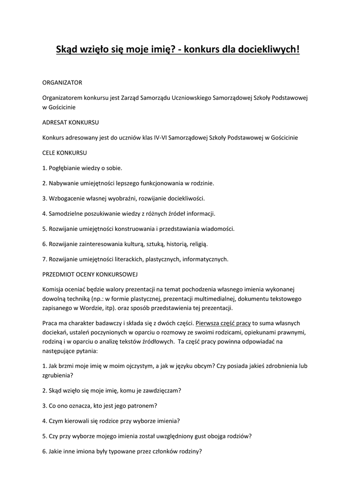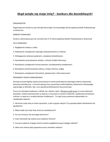 Skąd wzięło się moje imię? - konkurs dla dociekliwych! ORGANIZATOR Organizatorem konkursu jest Zarząd Samorządu Uczniowskiego Samorządowej Szkoły Podstawowej w Gościcinie ADRESAT KONKURSU Konkurs adresowany jest do uczniów klas IV-VI Samorządowej Szkoły Podstawowej w Gościcinie CELE KONKURSU 1. Pogłębianie wiedzy o sobie. 2. Nabywanie umiejętności lepszego funkcjonowania w rodzinie. 3. Wzbogacenie własnej wyobraźni, rozwijanie dociekliwości. 4. Samodzielne poszukiwanie wiedzy z różnych źródeł informacji. 5. Rozwijanie umiejętności konstruowania i przedstawiania wiadomości. 6. Rozwijanie zainteresowania kulturą, sztuką, historią, religią. 7. Rozwijanie umiejętności literackich, plastycznych, informatycznych. PRZEDMIOT OCENY KONKURSOWEJ Komisja oceniać będzie walory prezentacji na temat pochodzenia własnego imienia wykonanej dowolną techniką (np.: w formie plastycznej, prezentacji multimedialnej, dokumentu tekstowego zapisanego w Wordzie, itp). oraz sposób przedstawienia tej prezentacji. Praca ma charakter badawczy i składa się z dwóch części. Pierwsza część pracy to suma własnych dociekań, ustaleń poczynionych w oparciu o rozmowy ze swoimi rodzicami, opiekunami prawnymi, rodziną i w oparciu o analizę tekstów źródłowych. Ta część pracy powinna odpowiadać na następujące pytania: 1. Jak brzmi moje imię w moim ojczystym, a jak w języku obcym? Czy posiada jakieś zdrobnienia lub zgrubienia? 2. Skąd wzięło się moje imię, komu je zawdzięczam? 3. Co ono oznacza, kto jest jego patronem? 4. Czym kierowali się rodzice przy wyborze imienia? 5. Czy przy wyborze mojego imienia został uwzględniony gust obojga rodziów? 6. Jakie inne imiona były typowane przez członków rodziny? 7. Jakie inne imiona, kiedy się urodziłem/am były wówczas modne? 8. Czy rodzice wybierając moje imię kierowali się skojarzeniami z innymi osobami? 9. Czy wybierając dla mnie imię wzięto pod uwagę jego ponadzasowość i uniwersalność? 10. Jakie znaczenie pełni imię, które noszę w moim życiu? 11. Czy moje imię w mojej ocenie pasuje do nazwiska, które noszę? Czy chciałabym je zmienić? 12. Kto ze sławnych osób nosi takie same imię jak ja? Druga część pracy ma charakter refleksyjny i powinna odpowiadać na pytania: 1. W jaki sposób doszło do napisania pracy? 2. Z jakich materiałów, tekstów źródłowych korzystało się podczas tworzenia pracy? 3. Z czyjej pomocy korzystało się przygotowując odpowiedzi na pytania? 4. Jakie uczucia towarzyszyły mi podczas tworzenia prezentacji? 5. Czy dowiedziałem się czegoś nowego o sobie? STRUKTURA I PRZEBIEG KONKURSU: 1. Uczniowie biorą udział w konkursie indywidualnie. 2. Konkurs jest jednoetapowy. Komisja składająca się z Zarządu Samorządu Uczniowskiego i jego Opiekunek oceniać będzie walory prezentacji według następujących kryteriów: 1. Treść prezentacji. 2. Zgodność z tematem. 3. Dobór, układ oraz poprawność merytoryczna przygotowanego materiału. 4. Bogactwo zastosowanego materiału(obraz, tekst, animacja). 5. Ogólny wyraz artystyczny prezentacji. 6. Poprawność ortograficzna, stylistyczna i gramatyczna tekstu. 7. Podanie źródeł pochodzenia zastosowanych materiałów i informacji. TERMINARZ KONKURSU Prace konkursowe należy złożyć do Opiekunek Samorządu Uczniowskiego do 8 listopada 2013 roku. SPOSÓB I TERMIN OGŁOSZENIA WYNIKÓW Wyniki konkursu zostaną ogłoszone 12 listopada 2013 roku na tablicy SU. Natomiast nagrody i dyplomy zostaną wręczone laureatom podczas apelu debaty szkolnej. NAGRODY Laureaci konkursu otrzymają dyplomy oraz nagrody. UWAGI KOŃCOWE Wyniki konkursu zatwierdzone przez Komisję Konkursową są ostateczne.