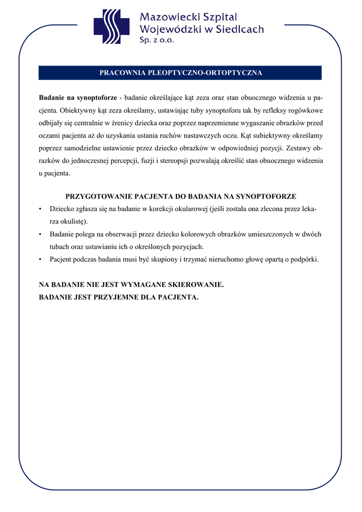 PRACOWNIA PLEOPTYCZNO-ORTOPTYCZNA Badanie na synoptoforze - badanie określające kąt zeza oraz stan obuocznego widzenia u pacjenta. Obiektywny kąt zeza określamy, ustawiając tuby synoptoforu tak by refleksy rogówkowe odbijały się centralnie w źrenicy dziecka oraz poprzez naprzemienne wygaszanie obrazków przed oczami pacjenta aż do uzyskania ustania ruchów nastawczych oczu. Kąt subiektywny określamy poprzez samodzielne ustawienie przez dziecko obrazków w odpowiedniej pozycji. Zestawy obrazków do jednoczesnej percepcji, fuzji i stereopsji pozwalają określić stan obuocznego widzenia u pacjenta. PRZYGOTOWANIE PACJENTA DO BADANIA NA SYNOPTOFORZE • Dziecko zgłasza się na badanie w korekcji okularowej (jeśli została ona zlecona przez lekarza okulistę). • Badanie polega na obserwacji przez dziecko kolorowych obrazków umieszczonych w dwóch tubach oraz ustawianiu ich o określonych pozycjach. • Pacjent podczas badania musi być skupiony i trzymać nieruchomo głowę opartą o podpórki. NA BADANIE NIE JEST WYMAGANE SKIEROWANIE. BADANIE JEST PRZYJEMNE DLA PACJENTA.