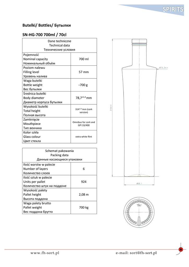 Butelki/ Bottles/ Бутылки SN-HG-700 700ml / 70cl Dane techniczne Technical data Технические условия Pojemność Nominal capacity Номинальный объём Poziom nalewu Filling level Уровень налива Waga butelki Bottle weight Вес бутылки Średnica butelki Body diameter Диаметр корпуса бутылки Wysokość butelki Total height Полная высота Zamknięcie Mouthpiece Тип венчика Kolor szkła Glass colour Цвет стекла 700 ml 57 mm ̴700 g 78,7±1,4 mm 314±1,9 mm (cork version) Omnibus for cork and GPI 33/400 extra white flint Schemat pakowania Packing data Данные касающиеся упаковки Ilość warstw w palecie Number of layers 6 Количество слоев Ilość sztuk w palecie Units per pallet 924 Количество штук на поддоне Wysokość palety Pallet height 2,08 m Высота поддона Waga palety brutto Pallet weight 700 kg Вес поддона брутто