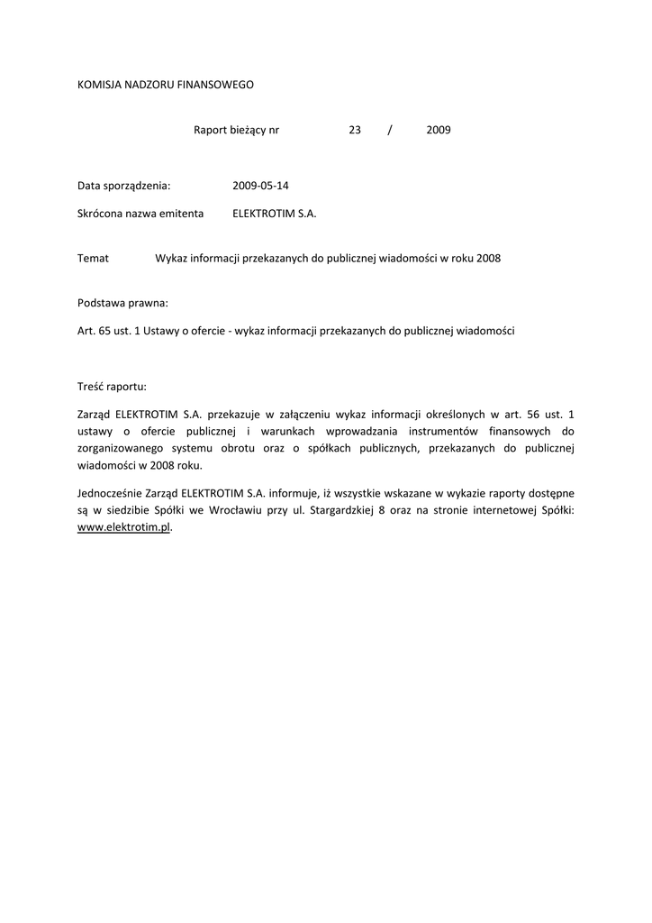 KOMISJA NADZORU FINANSOWEGO Raport bieżący nr Data sporządzenia: 2009-05-14 Skrócona nazwa emitenta ELEKTROTIM S.A. Temat 23 / 2009 Wykaz informacji przekazanych do publicznej wiadomości w roku 2008 Podstawa prawna: Art. 65 ust. 1 Ustawy o ofercie - wykaz informacji przekazanych do publicznej wiadomości Treść raportu: Zarząd ELEKTROTIM S.A. przekazuje w załączeniu wykaz informacji określonych w art. 56 ust. 1 ustawy o ofercie publicznej i warunkach wprowadzania instrumentów finansowych do zorganizowanego systemu obrotu oraz o spółkach publicznych, przekazanych do publicznej wiadomości w 2008 roku. Jednocześnie Zarząd ELEKTROTIM S.A. informuje, iż wszystkie wskazane w wykazie raporty dostępne są w siedzibie Spółki we Wrocławiu przy ul. Stargardzkiej 8 oraz na stronie internetowej Spółki: www.elektrotim.pl. Wykaz informacji przekazanych do publicznej wiadomości w roku 2008 przez ELEKTROTIM S.A. Raporty bieżące Nr raportu 1 Data przekazania raportu 11-01-2008 2 15-01-2008 3 15-01-2008 3/K 25-02-2008 4 22-01-2008 5 22-01-2008 6 24-01-2008 7 8 10-02-2008 26-02-2008 9 26-02-2008 10 17-03-2008 11 19-03-2008 12 25-04-2008 13 08-05-2008 14 21-05-2008 15 06-06-2008 16 18-06-2008 17 18-06-2008 18 19 18-06-2008 19-06-2008 20 29-07-2008 21 12-08-2008 22 23 21-08-2008 21-08-2008 Temat Nabycie aktywów o znacznej wartości – zakup udziałów Spółki INFRABUD Sp. z o.o. Oświadczenie o zamiarze przekazywania rozszerzonych skonsolidowanych raportów kwartalnych i skonsolidowanego raportu półrocznego Terminy przekazywania raportów okresowych w roku 2008 Korekta raportu nr 3/2008 – terminy przekazywania raportów okresowych w roku 2008 Skonsolidowana prognoza wyników finansowych ELEKTROTIM S.A. na rok 2008 Zbycie akcji przez Członka Rady Nadzorczej ELEKTROTIM S.A. Nabycie aktywów o znacznej wartości – zakup udziałów Spółki ELEKTROMONT-BETA Sp. z o.o. Zbycie aktywów o znacznej wartości Uzupełnienie raportu nr 4/2008 z dn. 22.01.2008r. – skonsolidowana prognoza wyników finansowych Grupy Kapitałowej ELEKTROTIM na rok 2008 Korekta prognozy jednostkowych przychodów netto ze sprzedaży ELEKTROTIM S.A. za rok 2007 Wybór podmiotu uprawnionego do badania sprawozdań finansowych Spółki ELEKTROTIM S.A. Wykaz informacji przekazanych do publicznej wiadomości w roku 2007 Zawiadomienie o nabyciu akcji ELEKTROTIM S.A. i przekroczeniu 5% ogólnej liczby głosów Zwołanie Zwyczajnego Walnego Zgromadzenia Akcjonariuszy ELEKTROTIM S.A. Termin publikacji jednostkowego oraz skonsolidowanego raportu rocznego za rok 2007 Projekty uchwał na WZA ELEKTROTIM S.A. zwołane na dzień 17 czerwca 2008r. Dywidenda dla Akcjonariuszy ELEKTROTIM S.A. za rok 2007 Uchwały podjęte przez WZA ELEKTROTIM S.A. w dniu 17.06.2008r. Tekst jednolity Statutu Spółki Wykaz akcjonariuszy posiadających co najmniej 5% liczby głosów na WZA ELEKTROTIM S.A. w dn. 17.06.2008r. Zwołanie Nadzwyczajnego Walnego Zgromadzenia Akcjonariuszy ELEKTROTIM S.A. Korekta prognozy skonsolidowanych wyników finansowych na rok 2008 Zawarcie umowy – informacja poufna Nabycie akcji ELEKTROTIM S.A. przez osobę zobowiązaną 24 22-08-2008 25 25-08-2008 26 02-09-2008 27 28 04-09-2008 05-09-2008 29 18-10-2008 30 31 32 18-10-2008 30-10-2008 17-11-2008 33 20-11-2008 34 10-12-2008 35 10-12-2008 36 10-12-2008 Nabycie akcji ELEKTROTIM S.A. przez osobę zobowiązaną Projekty uchwał na NWZA ELEKTROTIM S.A. na dzień 02.09.2008r. Uchwały podjęte przez NWZA ELEKTROTIM S.A. w dniu 02.09.2008r. Zawarcie znaczącej umowy Wykaz akcjonariuszy posiadających co najmniej 5% liczby głosów na NWZA ELEKTROTIM S.A. w dn. 02.09.2008r. Rezygnacja osoby zarządzającej z pełnienia funkcji od dnia 01.01.2009r. Powołanie osoby zarządzającej od dnia 01.01.2009r. Zawiadomienie o zbyciu akcji ELEKTROTIM S.A. Rozpoczęcie Programu skupu akcji własnych ELEKTROTIM S.A. celem ich umorzenia Zawiadomienie o przekroczeniu 5% ogólnej liczby głosów na walnym zgromadzeniu ELEKTROTIM S.A. Odwołanie osoby zarządzającej – Prokurenta Spółki – od dnia 01.01.2009r. Powołanie osoby zarządzającej – Prokurenta Spółki – od dnia 01.01.2009r. Przydział warrantów subskrypcyjnych serii A – realizacja Programu Motywacyjnego za rok 2007 Raporty okresowe dot. roku 2007 opublikowane w roku 2008 Nr raportu QSr 4/2007 SA-R 2007 RS 2007 Data przekazania raportu 27-02-2008 Temat Skonsolidowany raport kwartalny za IV kw. 2007 28-05-2008 Jednostkowy raport roczny za rok 2007 28-05-2008 Skonsolidowany raport roczny za rok 2007 Raporty okresowe dot. roku 2008 opublikowane w roku 2008 Nr raportu QSr 1/2008 QSr 2/2008 PSr 2008 QSr 3/2008 Data przekazania raportu 14-05-2008 Temat Skonsolidowany raport kwartalny za I kw. 2008r. 13-08-2008 Skonsolidowany raport kwartalny za II kw. 2008r. 30-09-2008 Skonsolidowany raport półroczny 2008 13-11-2008 Skonsolidowany raport kwartalny za III kw. 2008r.