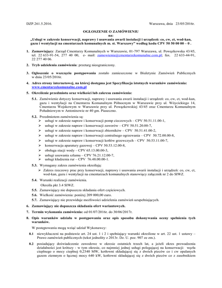 DZP.261.5.2016. Warszawa, dnia 23/05/2016r. OGŁOSZENIE O ZAMÓWIENIU na: „Usługi w zakresie konserwacji, naprawy i usuwania awarii instalacji i urządzeń: co, cw, ct, wod-kan, gazu i wentylacji na cmentarzach komunalnych m. st. Warszawy” według kodu CPV 50 50 00 00 – 0 . 1. Zamawiający: Zarząd Cmentarzy Komunalnych w Warszawie, 01-797 Warszawa, ul. Powązkowska 43/45, tel. 22 633-91-54, 277 40 00, e- mail: [email protected]; fax. 22 633-44-91, 22 277 40 06. 2. Tryb udzielenia zamówienia: przetarg nieograniczony. 3. Ogłoszenie o wszczęciu postępowania zostało zamieszczone w Biuletynie Zamówień Publicznych w dniu 23/05/2016r. 4. Adres strony internetowej, na której dostępna jest Specyfikacja istotnych warunków zamówienia: www.cmentarzekomunalne.com.pl 5. Określenie przedmiotu oraz wielkości lub zakresu zamówienia: 5.1. Zamówienie dotyczy konserwacji, naprawy i usuwania awarii instalacji i urządzeń: co, cw, ct, wod-kan, gazu i wentylacji na Cmentarzu Komunalnym Północnym w Warszawie przy ul. Wóycickiego 14, Cmentarzu Wojskowym w Warszawie przy ul. Powązkowskiej 43/45 oraz Cmentarzu Komunalnym Południowym w Antoninowie nr 40 gm. Piaseczno. 5.2. Przedmiotem zamówienia są: usługi w zakresie napraw i konserwacji pomp cieczowych – CPV 50.51.11.00-1, usługi w zakresie napraw i konserwacji zaworów – CPV 50.51.20.00-7, usługi w zakresie napraw i konserwacji zbiorników – CPV 50.51.41.00-2, usługi w zakresie napraw i konserwacji centralnego ogrzewania – CPV 50.72.00.00-8, usługi w zakresie napraw i konserwacji kotłów grzewczych – CPV 50.53.11.00-7, konserwacja aparatury gazowej – CPV 50.53.12.00-8, obsługa stacji wody – CPV 65.13.00.00-3, usługi usuwania szlamu – CPV 76.21.12.00-7, usługi kładzenia rur – CPV 76.48.00.00-1. 5.3. Wymagany zakres zamówienia określają: Zakres rzeczowy prac przy konserwacji, naprawy i usuwania awarii instalacji i urządzeń: co, cw, ct, wod-kan, gazu i wentylacji na cmentarzach komunalnych stanowiący załącznik nr 2 do SIWZ. 5.4. Warunki realizacji zamówienia. Określa pkt 3.4 SIWZ. 5.5. Zamawiający nie dopuszcza składania ofert częściowych. 5.6. Wielkość zamówienia: poniżej 209 000,00 euro. 5.7. Zamawiający nie przewiduje możliwości udzielenia zamówień uzupełniających. 6. Zamawiający nie dopuszcza składania ofert wariantowych. 7. Termin wykonania zamówienia: od 01/07/2016r. do 30/06/2017r. 8. Opis warunków udziału w postępowaniu oraz opis sposobu dokonywania oceny spełnienia tych warunków. W postępowaniu mogą wziąć udział Wykonawcy: 8.1 niewykluczeni na podstawie art. 24 ust. 1 i 2 i spełniający warunki określone w art. 22 ust. 1 ustawy – Prawo zamówień publicznych (tekst jednolity z 2013r. Dz. U. poz. 907 ze zm.). 8.2 posiadający doświadczenie zawodowe w okresie ostatnich trzech lat, a jeżeli okres prowadzenia działalności jest krótszy - w tym okresie, co najmniej jednej usługi polegającej na konserwacji: węzła cieplnego o mocy cieplnej 0,2340 MW, kotłowni składającej się z dwóch pieców co i cw opalanych gazem ziemnym o łącznej mocy 640 kW, kotłowni składającej się z dwóch pieców co z zasobnikiem opalanych olejem opałowym o łącznej mocy 200 kW, czterech studni głębinowych, 2 hydroforni, letniej sieci wodociągowej o łącznej długości 40 km z 550 punktami czerpalnymi, oraz 600 studni chłonnych, stacji uzdatniania wody o łącznej wartości 60.000,00 zł brutto i trwającej co najmniej 6 miesięcy. Zamawiający dopuszcza możliwość łączenia kontraktów o mniejszej wartości, z zachowaniem minimum 6 miesięcznego okresu świadczenia pod warunkiem, że są one wykonywane w tym samym czasie. W przypadku składania ofert wspólnych, warunek ten musi być spełniony przez, co najmniej jeden z podmiotów. 8.3 którzy nie należą do tej samej grupy kapitałowej, w rozumieniu Ustawy o ochronie konkurencji i konsumentów (Dz.U. Nr 50 z 2007r, poz. 331 ze zmianami), chyba że mimo takiej przynależności wykażą, że istniejące między nimi powiązania nie prowadzą do zachwiania uczciwej konkurencji pomiędzy wykonawcami w niniejszym postępowaniu. 8.4 Dokonanie oceny spełnienia warunków odbędzie się na podstawie przedłożonych przez Wykonawcę dokumentów, tj.: a) Oświadczenia o spełnieniu wymogów określonych w art. 22 ust. 1 i braku podstaw do wykluczenia z postępowania na podstawie art. 24 ust. 1 ustawy - Prawo zamówień publicznych - załącznik nr 3 do SIWZ. b) Aktualnego odpisu z właściwego rejestru lub z centralnej ewidencji i informacji o działalności gospodarczej, wystawionego nie wcześniej niż 6 miesięcy przed upływem terminu składania ofert. W przypadku korzystania z zasobów innych podmiotów określonych w art. 26 ust. 2b ustawy PZP w celu wykazania spełniania warunków, o których mowa w art. 22 ust. 1 Wykonawca załącza do oferty analogiczny dokument dotyczący podmiotu udostępniającego. c) Oświadczenia o braku przynależności do grupy kapitałowej w rozumieniu Ustawy o ochronie konkurencji i konsumentów (Dz.U. Nr 50 z 2007r, poz. 331 ze zmianami) lub o przynależności do grupy kapitałowej wraz z wykazem podmiotów należących do tej samej grupy kapitałowej załącznik nr 4 do SIWZ. d) Oświadczenia Wykonawcy o dysponowaniu doświadczeniem zawodowym, załącznik nr 5 do SIWZ wraz z dowodami potwierdzającymi, że usługi zostały wykonane należycie. 9. Wadium w wysokości: 2.000,00 zł należy wnieść przed upływem terminu składania ofert w formach określonych w SIWZ. 10. Kryteria oceny oferty i ich znaczenie: Cena oferty Czas na przystąpienie do usuwania awarii waga – 90%, waga – 10 % 11. Miejsce i termin składania ofert: Siedziba Zamawiającego, pokój Nr 5, w terminie do dnia 31/05/2016r. do godz. 1230 12. Termin związania ofertą Wykonawca pozostaje związany złożoną przez siebie ofertą do dnia 29/06/2016r. 13. Zamawiający nie przewiduje zawarcia umowy ramowej. 14. W ni