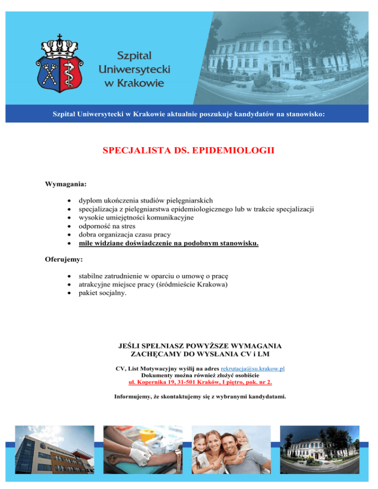 Szpital Uniwersytecki w Krakowie aktualnie poszukuje kandydatów na stanowisko: SPECJALISTA DS. EPIDEMIOLOGII Wymagania: dyplom ukończenia studiów pielęgniarskich specjalizacja z pielęgniarstwa epidemiologicznego lub w trakcie specjalizacji wysokie umiejętności komunikacyjne odporność na stres dobra organizacja czasu pracy mile widziane doświadczenie na podobnym stanowisku. Oferujemy: stabilne zatrudnienie w oparciu o umowę o pracę atrakcyjne miejsce pracy (śródmieście Krakowa) pakiet socjalny. JEŚLI SPEŁNIASZ POWYŻSZE WYMAGANIA ZACHĘCAMY DO WYSŁANIA CV i LM CV, List Motywacyjny wyślij na adres [email protected] Dokumenty można również złożyć osobiście ul. Kopernika 19, 31-501 Kraków, I piętro, pok. nr 2. Informujemy, że skontaktujemy się z wybranymi kandydatami.