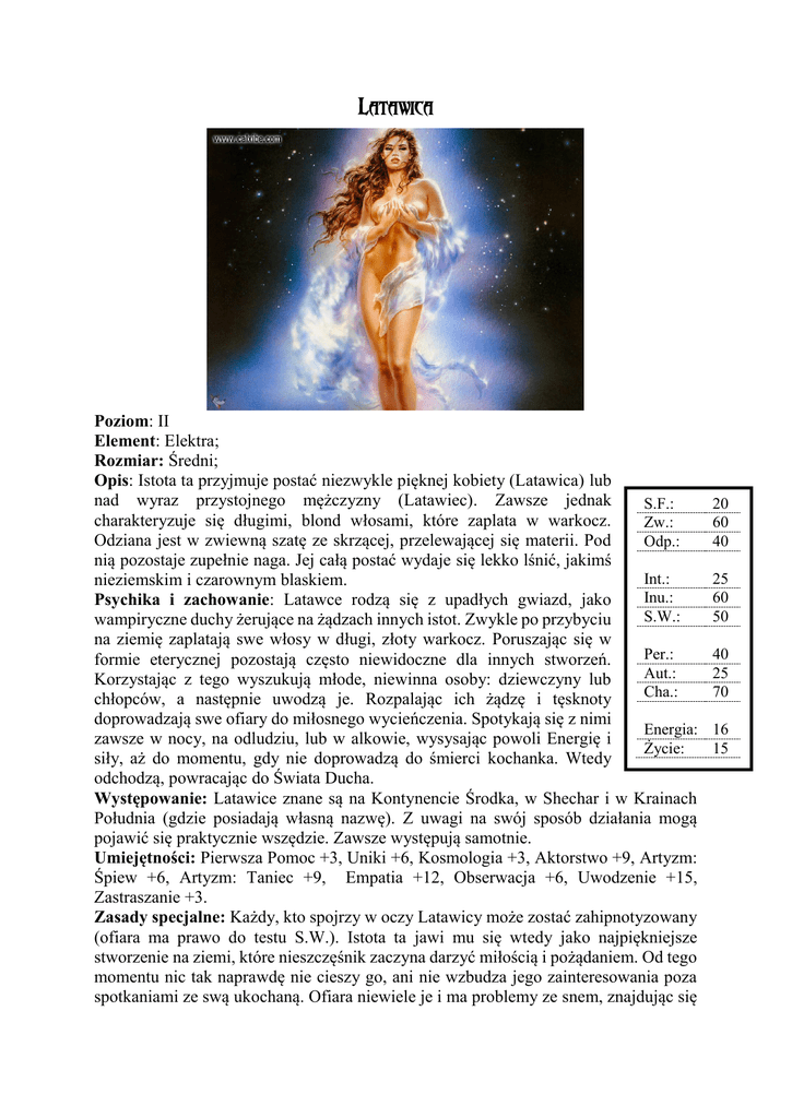 Latawica Poziom: II Element: Elektra; Rozmiar: Średni; Opis: Istota ta przyjmuje postać niezwykle pięknej kobiety (Latawica) lub nad wyraz przystojnego mężczyzny (Latawiec). Zawsze jednak S.F.: charakteryzuje się długimi, blond włosami, które zaplata w warkocz. Zw.: Odziana jest w zwiewną szatę ze skrzącej, przelewającej się materii. Pod Odp.: nią pozostaje zupełnie naga. Jej całą postać wydaje się lekko lśnić, jakimś Int.: nieziemskim i czarownym blaskiem. Inu.: Psychika i zachowanie: Latawce rodzą się z upadłych gwiazd, jako S.W.: wampiryczne duchy żerujące na żądzach innych istot. Zwykle po przybyciu na ziemię zaplatają swe włosy w długi, złoty warkocz. Poruszając się w Per.: formie eterycznej pozostają często niewidoczne dla innych stworzeń. Aut.: Korzystając z tego wyszukują młode, niewinna osoby: dziewczyny lub Cha.: chłopców, a następnie uwodzą je. Rozpalając ich żądzę i tęsknoty doprowadzają swe ofiary do miłosnego wycieńczenia. Spotykają się z nimi Energia: zawsze w nocy, na odludziu, lub w alkowie, wysysając powoli Energię i Życie: siły, aż do momentu, gdy nie doprowadzą do śmierci kochanka. Wtedy odchodzą, powracając do Świata Ducha. Występowanie: Latawice znane są na Kontynencie Środka, w Shechar i w Krainach Południa (gdzie posiadają własną nazwę). Z uwagi na swój sposób działania mogą pojawić się praktycznie wszędzie. Zawsze występują samotnie. Umiejętności: Pierwsza Pomoc +3, Uniki +6, Kosmologia +3, Aktorstwo +9, Artyzm: Śpiew +6, Artyzm: Taniec +9, Empatia +12, Obserwacja +6, Uwodzenie +15, Zastraszanie +3. Zasady specjalne: Każdy, kto spojrzy w oczy Latawicy może zostać zahipnotyzowany (ofiara ma prawo do testu S.W.). Istota ta jawi mu się wtedy jako najpiękniejsze stworzenie na ziemi, które nieszczęśnik zaczyna darzyć miłością i pożądaniem. Od tego momentu nic tak naprawdę nie cieszy go, ani nie wzbudza jego zainteresowania poza spotkaniami ze swą ukochaną. Ofiara niewiele je i ma problemy ze snem, znajdując się 20 60 40 25 60 50 40 25 70 16 15 w miłosnej gorączce. Jej tęsknotę jest w stanie ukoić tylko kolejne spotkanie z Wąpierzem. Zdolności specjalne: Latawica żeruje na swych ofiarach w czasie aktu - Infrawizja; seksualnego, wysączając z nich K6 punktów Energii i - Aura magiczna; K3 punkty Żywotności. O ile ofiara regeneruje - Negatywna energia; energię naturalnie, to spadek Żywotności pozostaje - Wyczucie życia; stały, objawiając się bladością ciała i ogólnym - Przebudzenie Astralu; osłabieniem. - Forma mgły; Jeśli Latawica zostanie zaatakowana stara się - Wampiryzm energetyczny; zahipnotyzować przeciwnika, aby zyskać nad nim - Hipnoza; kontrolę. Gdy się jej to nie uda ucieka, najczęściej przemieniając się w mgłę. Stwór włada następującymi Zdolnościami Astralnymi: 3 P.M. 1 St. Wtajemniczenia: LD (A); 2 St. Wtajemniczenia: OoBE (1), Astralne Wejrzenie (1); Mistrzostwa Potrafi także biegle władać Czarostwem korzystając z zaklęć Duch 2 Elementarnych, Księżycowych Uroków i Czarów Energii: Elektra 4 Dotyk Elektry, Odporność na Elektrę, Astralna Kryjówka, Księżycowy Woda 3 Ognik, Srebrzysta Aura, Zakrzywienie Promienia, Lśniąca Aura, Przekazanie Energii, Zakłócenie Mocy; Większość powyższych czarów wykorzystuje do tego aby uwieść swoją ofiarę, niektóre wykorzystuje także do obrony. Otacza ją stała aura magiczna, która zapewnia ochronę przed atakami każdego rodzaju. Ciekawostki: W Krainach Południa Latawicę nazywa się Sukubem, Latawca zaś Inkubem. Istoty te nie mają w tych krainach jasnych włosów, lecz czarne – poznać je jednak można po błękitnych oczach, lśniących światłem gwiazd. Odcięcie warkocza Latawicy pozwala uzyskać kontrolę nad tą istotą, ponieważ zniszczenie go Biegłość P.A. Obr. uniemożliwia jej powrót do Dewachanu. Należy Bez broni 105 K6 + 2 zagrozić Wąpierzowi spaleniem włosów. Będzie on się starał wszelkimi siłami uwieść przeciwnika lub wzbudzić litość – należy jednak być 1% Krytyk: nieporuszonym, lecz rozkazać mu odejść do Świata 60 Inicjatywa: Ducha. Gdy Latawica ujrzy, że jej starania nie mają efektu, zgodzi się opuścić świat jawy. Dopiero po 50 P.O. tym przyrzeczeniu bezpiecznie można oddać jej warkocz. Aura magiczna: 4 Pancerz: obrony