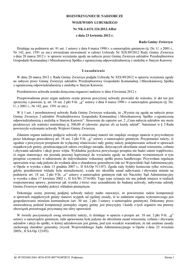 ROZSTRZYGNIECIE NADZORCZE WOJEWODY LUBUSKIEGO Nr NK-I.4131.124.2012.AHor z dnia 23 kwietnia 2012 r. Rada Gminy Zwierzyn Działając na podstawie art. 91 ust. 1 ustawy z dnia 8 marca 1990 r. o samorządzie gminnym (tj. Dz. U. z 2001 r., Nr 142, poz. 1591 ze zm.) stwierdzam nieważność w całości Uchwały Nr XIX/89/2012 Rady Gminy Zwierzyn z dnia 28 marca 2012 r. w sprawie wyrażenia zgody na nabycie przez Gminę Zwierzyn udziałów Przedsiębiorstwa Gospodarki Komunalnej i Mieszkaniowej Spółka z ograniczoną odpowiedzialnością z siedzibą w Starym Kurowie. Uzasadnienie W dniu 28 marca 2012 r. Rada Gminy Zwierzyn podjęła Uchwałę Nr XIX/89/2012 w sprawie wyrażenia zgody na nabycie przez Gminę Zwierzyn udziałów Przedsiębiorstwa Gospodarki Komunalnej i Mieszkaniowej Spółka z ograniczoną odpowiedzialnością z siedzibą w Starym Kurowie. Przedmiotowa uchwała została doręczona organowi nadzoru w dniu 4 kwietnia 2012 r. Przeprowadzona przez organ nadzoru ocena prawna powyższej uchwały prowadzi do wniosku, iż akt ten jest sprzeczny z prawem, tj. art. 18 ust. 2 pkt 9 lit. „g” ustawy z dnia 8 marca 1990 r. o samorządzie gminnym (tj. Dz. U. z 2001 r., Nr 142, poz. 1591 ze zm.). W § 1 ust. 1 przedmiotowej uchwały Rada Gminy Zwierzyn wskazała, że „Wyraża się zgodę na nabycie przez Gminę Zwierzyn 2 udziałów Przedsiębiorstwa Gospodarki Komunalnej i Mieszkaniowej Spółka z ograniczoną odpowiedzialnością z siedzibą w Starym Kurowie”. Stosownie do zapisów ust. 2 „Cena nabycia udziałów nie może przekroczyć ich wartości nominalnej tj. 500,00 zł (słownie: pięćset zł) za każdy udział”. Natomiast w § 2 Rada powierzyła wykonanie uchwały Wójtowi Gminy Zwierzyn. Zdaniem organu nadzoru podjęcie uchwały w omawianej materii nie znajduje swojego oparcia w przywołanym przez lokalnego prawodawcę art. 18 ust. 2 pkt 9 lit. „g” ustawy o samorządzie gminnym. Przypomnieć należy, iż zgodnie z powyższym przepisem do wyłącznej właściwości rady gminy należy podejmowanie uchwał w sprawach majątkowych gminy, przekraczających zakres zwykłego zarządu, dotyczących określania zasad wnoszenia, cofania i zbywania udziałów i akcji przez wójta. Wykładnia językowa powyższego przepisu nie budzi zatem wątpliwości, iż organ stanowiący nie posiada prawnej legitymacji do wyrażania zgody na dokonanie wymienionych w tym przepisie czynności w odniesieniu do indywidualnie wskazanej spółki prawa handlowego. Przywołana regulacja upoważnia więc radę jedynie do wydania aktu o charakterze generalnym (tak też Wojewódzki Sąd Administracyjny w Opolu w wyroku z dnia 13 grudnia 2007 r., II SA/Op 511/07). Zgoda rady byłaby konieczna tylko wówczas, gdyby przedmiotem wkładu była nieruchomość, a rada nie określiła zasad nabywania i zbywania mienia na podstawie art. 18 ust. 2 pkt 9 lit. „a” ustawy o samorządzie gminnym (tak też Naczelny Sąd Administracyjny w wyroku z dnia 17 kwietnia 2002 r., II SA/Wr 2716/00). Tego typu sytuacja nie ma jednak miejsca w realiach rozpoznawanej sprawy, ponieważ jak wynika z treści oraz uzasadnienia do badanej uchwały, nabywane udziały Gmina Zwierzyn miałaby pokryć wkładem pieniężnym. Dokonując oceny prawnej podjętej uchwały należy nadto zauważyć, że powierzenie radzie kompetencji w sprawach majątkowych gminy stanowi wyjątek od ogólnej zasady, iż to zadaniem organu wykonawczego jest gospodarowanie mieniem komunalnym (art. 30 ust. 2 pkt 3 ustawy o samorządzie gminnym). Dokonany przez ustawodawcę podział kompetencji pomiędzy organy gminy jest precyzyjny i każdy z tych organów ma prawny obowiązek przestrzegać przyznanej mu sfery uprawnień. W świetle poczynionych uwag stwierdzić należy, iż działając w oparciu o przepis art. 18 ust. 2 pkt 9 lit. „g” ustawy o samorządzie gminnym, rada uprawniona była jedynie do określenia zasad wnoszenia, cofania i zbywania udziałów i akcji do spółki, w której udziałowcem jest gmina, pod tym wszakże warunkiem, że tak ustalone zasady zachowują charakter generalny (wyrok Wojewódzkiego Sądu Administracyjnego w Opolu z dnia 22 września 2005r., II SA/Op 123/05). ————————————————————————————————————————————————————————— Id: 4F1D256D-2681-4F26-853F-B977424FDF35. Podpisany Strona 1 Podjęta przez Radę Gminy Zwierzyn uchwała nie spełnia powyższego wymogu,w związku z czym w sposób istotny narusza przywołany na wstępie przepis art. 18 ust. 2 pkt 9lit. „g” ustawy o samorządzie gminnym. Z uwagi na powyższe orzeczono jak w sentencji. Pouczenie: Na niniejsze rozstrzygnięcie służy prawo wniesienia skargi do Wojewódzkiego Sądu Administracyjnego w Gorzowie Wlkp. w terminie 30 dni od daty doręczenia rozstrzygnięcia. Skargę wnosi się za pośrednictwem Wojewody Lubuskiego. Zgodnie z art. 92 ust. 1 ustawy o samorządzie gminnym stwierdzenie przez organ nadzoru nieważności uchwały organu gminy wstrzymuje jej wykonanie z mocy prawa w zakresie objętym stwierdzeniem nieważności, z dniem doręczenia rozstrzygnięcia nadzorczego. z up. Wojewody Lubuskiego Dyrektor Wydziału Nadzoru i Kontroli Teresa Kaczmarek ————————————————————————————————————————————————————————— Id: 4F1D256D-2681-4F26-853F-B977424FDF35. Podpisany Strona 2