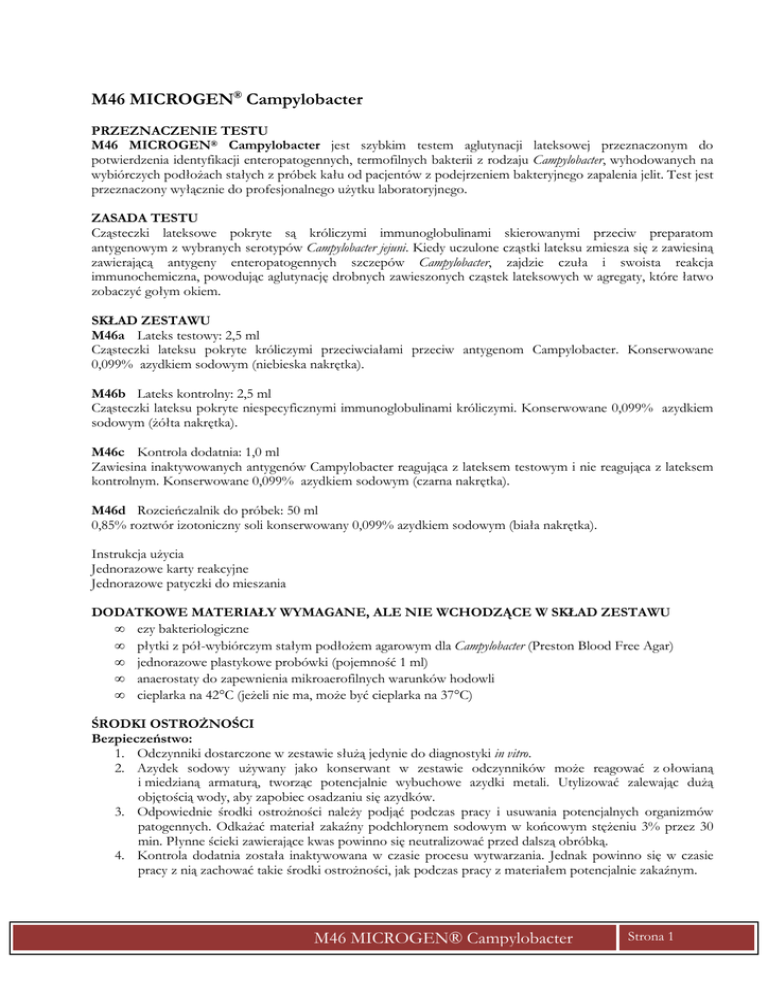 M46 MICROGEN® Campylobacter PRZEZNACZENIE TESTU M46 MICROGEN® Campylobacter jest szybkim testem aglutynacji lateksowej przeznaczonym do potwierdzenia identyfikacji enteropatogennych, termofilnych bakterii z rodzaju Campylobacter, wyhodowanych na wybiórczych podłoŜach stałych z próbek kału od pacjentów z podejrzeniem bakteryjnego zapalenia jelit. Test jest przeznaczony wyłącznie do profesjonalnego uŜytku laboratoryjnego. ZASADA TESTU Cząsteczki lateksowe pokryte są króliczymi immunoglobulinami skierowanymi przeciw preparatom antygenowym z wybranych serotypów Campylobacter jejuni. Kiedy uczulone cząstki lateksu zmiesza się z zawiesiną zawierającą antygeny enteropatogennych szczepów Campylobacter, zajdzie czuła i swoista reakcja immunochemiczna, powodując aglutynację drobnych zawieszonych cząstek lateksowych w agregaty, które łatwo zobaczyć gołym okiem. SKŁAD ZESTAWU M46a Lateks testowy: 2,5 ml Cząsteczki lateksu pokryte króliczymi przeciwciałami przeciw antygenom Campylobacter. Konserwowane 0,099% azydkiem sodowym (niebieska nakrętka). M46b Lateks kontrolny: 2,5 ml Cząsteczki lateksu pokryte niespecyficznymi immunoglobulinami króliczymi. Konserwowane 0,099% azydkiem sodowym (Ŝółta nakrętka). M46c Kontrola dodatnia: 1,0 ml Zawiesina inaktywowanych antygenów Campylobacter reagująca z lateksem testowym i nie reagująca z lateksem kontrolnym. Konserwowane 0,099% azydkiem sodowym (czarna nakrętka). M46d Rozcieńczalnik do próbek: 50 ml 0,85% roztwór izotoniczny soli konserwowany 0,099% azydkiem sodowym (biała nakrętka). Instrukcja uŜycia Jednorazowe karty reakcyjne Jednorazowe patyczki do mieszania DODATKOWE MATERIAŁY WYMAGANE, ALE NIE WCHODZĄCE W SKŁAD ZESTAWU • ezy bakteriologiczne • płytki z pół-wybiórczym stałym podłoŜem agarowym dla Campylobacter (Preston Blood Free Agar) • jednorazowe plastykowe probówki (pojemność 1 ml) • anaerostaty do zapewnienia mikroaerofilnych warunków hodowli • cieplarka na 42°C (jeŜeli nie ma, moŜe być cieplarka na 37°C) ŚRODKI OSTROśNOŚCI Bezpieczeństwo: 1. Odczynniki dostarczone w zestawie słuŜą jedynie do diagnostyki in vitro. 2. Azydek sodowy uŜywany jako konserwant w zestawie odczynników moŜe reagować z ołowianą i miedzianą armaturą, tworząc potencjalnie wybuchowe azydki metali. Utylizować zalewając duŜą objętością wody, aby zapobiec osadzaniu się azydków. 3. Odpowiednie środki ostroŜności naleŜy podjąć podczas pracy i usuwania potencjalnych organizmów patogennych. OdkaŜać materiał zakaźny podchlorynem sodowym w końcowym stęŜeniu 3% przez 30 min. Płynne ścieki zawierające kwas powinno się neutralizować przed dalszą obróbką. 4. Kontrola dodatnia została inaktywowana w czasie procesu wytwarzania. Jednak powinno się w czasie pracy z nią zachować takie środki ostroŜności, jak podczas pracy z materiałem potencjalnie zakaźnym. M46 MICROGEN® Campylobacter Strona 1 Środki proceduralne: 1. MICROGEN® Campylobacter powinien być uŜywany zgodnie z dołączoną instrukcją. 2. Pozwolić wszystkim odczynnikom na osiągnięcie temperatury pokojowej przed uŜyciem. 3. Nie rozcieńczać Ŝadnego odczynnika z zestawu. 4. Nie mieszać odczynników z róŜnych partii i zestawów. 5. Nie zamraŜać Ŝadnych odczynników. 6. UwaŜać, Ŝeby zakraplacz z odczynnikiem lateksowym nie dotknął próbek bakteryjnych. 7. Przed uŜyciem upewnić się, Ŝe karta reakcyjna jest czysta i sucha. PRZECHOWYWANIE I TERMIN WAśNOŚCI MICROGEN® Campylobacter powinien być przechowywany w temp. 2 - 8°C, kiedy nie jest uŜywany. Zestawu nie naleŜy uŜywać po upływie daty waŜności wydrukowanej na naklejce na kartonie. PRÓBKI Próbki kału naleŜy posiać na wybiórcze płytki agarowe bez krwi (Preston Blood Free Agar) w ilości 0,2 – 0,3 g materiału na płytkę. Płytki powinny być inkubowane w atmosferze mikroaerofilnej w 42°C przez 48 godz. Kolonie o morfologii przypominającej Campylobacter naleŜy pobrać i sprawdzić testem MICROGEN® Campylobacter (zob. niŜej). SPOSÓB WYKONANIA Kontrola jakości: Aby potwierdzić, Ŝe odczynniki działają prawidłowo, naleŜy za kaŜdym razem, kiedy uŜywa się zestaw, wykonać następujący sprawdzian z kontrolą dodatnią: 1. Dodać po jednej 50 µl kropli kontroli dodatniej do 2 oddzielnych pól na karcie testowej. 2. NaleŜy obie krople sprawdzić z lateksem testowym i kontrolnym, jak opisano w „Sposobie wykonania testu” poniŜej. 3. NaleŜy podejrzewać degradację odczynnika, jeŜeli: • Brak reakcji między lateksem testowym i kontrolą dodatnią LUB reakcja wykazuje znaczny spadek nasilenia z upływem czasu. • Lateks kontrolny reaguje z kontrolą dodatnią. • Odczynnik lateksowy staje się bezbarwny lub tworzy kłaczki, które nie znikają po delikatnym wytrząsaniu. Sposób wykonania testu: 1. Doprowadzić wszystkie odczynniki do temperatury pokojowej. Delikatnie wytrząsnąć odczynniki lateksowe, aby otrzymać jednorodną zawiesinę. 2. Nanieść po 50 µl rozcieńczalnika do próbek na dwa pola na czystej, suchej karcie reakcyjnej. 3. Przy pomocy ezy pobrać kilka kolonii o morfologii przypominającej Campylobacter. JeŜeli wzrost na płytce jest skąpy, pobrać bakterie przy pomocy wymazówki. Zmieszać bakterie z kaŜdą z dwu kropli rozcieńczalnika do próbek na karcie reakcyjnej, aby powstała jednorodna zawiesina. 4. Dodać 1 kroplę (50 µl) lateksu kontrolnego do zawiesiny bakteryjnej na jednym polu karty. Podobnie dodać 1 kroplę (50 µl) lateksu testowego do drugiej zawiesiny bakteryjnej. 5. Zmieszać zawiesiny bakteryjne z odczynnikami lateksowymi uŜywając patyczki do mieszania, zaczynając od lateksu kontrolnego. Rozprowadzić mieszaninę na całym polu na karcie reakcyjnej. 6. Obracać delikatnie kartę, utrzymując płynne zawiesiny w ciągłym ruchu przez 3 minuty. Obserwować, czy zachodzi aglutynacja. 7. Odczytać wyniki (zob. INTERPRETACJA PONIśEJ). 8. Wyrzucić zuŜ