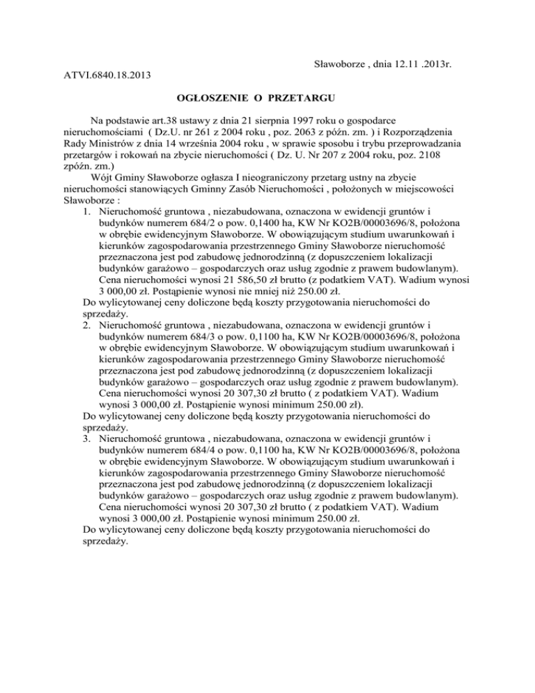 Sławoborze , dnia 12.11 .2013r. ATVI.6840.18.2013 OGŁOSZENIE O PRZETARGU Na podstawie art.38 ustawy z dnia 21 sierpnia 1997 roku o gospodarce nieruchomościami ( Dz.U. nr 261 z 2004 roku , poz. 2063 z późn. zm. ) i Rozporządzenia Rady Ministrów z dnia 14 września 2004 roku , w sprawie sposobu i trybu przeprowadzania przetargów i rokowań na zbycie nieruchomości ( Dz. U. Nr 207 z 2004 roku, poz. 2108 zpóźn. zm.) Wójt Gminy Sławoborze ogłasza I nieograniczony przetarg ustny na zbycie nieruchomości stanowiących Gminny Zasób Nieruchomości , położonych w miejscowości Sławoborze : 1. Nieruchomość gruntowa , niezabudowana, oznaczona w ewidencji gruntów i budynków numerem 684/2 o pow. 0,1400 ha, KW Nr KO2B/00003696/8, położona w obrębie ewidencyjnym Sławoborze. W obowiązującym studium uwarunkowań i kierunków zagospodarowania przestrzennego Gminy Sławoborze nieruchomość przeznaczona jest pod zabudowę jednorodzinną (z dopuszczeniem lokalizacji budynków garażowo – gospodarczych oraz usług zgodnie z prawem budowlanym). Cena nieruchomości wynosi 21 586,50 zł brutto (z podatkiem VAT). Wadium wynosi 3 000,00 zł. Postąpienie wynosi nie mniej niż 250.00 zł. Do wylicytowanej ceny doliczone będą koszty przygotowania nieruchomości do sprzedaży. 2. Nieruchomość gruntowa , niezabudowana, oznaczona w ewidencji gruntów i budynków numerem 684/3 o pow. 0,1100 ha, KW Nr KO2B/00003696/8, położona w obrębie ewidencyjnym Sławoborze. W obowiązującym studium uwarunkowań i kierunków zagospodarowania przestrzennego Gminy Sławoborze nieruchomość przeznaczona jest pod zabudowę jednorodzinną (z dopuszczeniem lokalizacji budynków garażowo – gospodarczych oraz usług zgodnie z prawem budowlanym). Cena nieruchomości wynosi 20 307,30 zł brutto ( z podatkiem VAT). Wadium wynosi 3 000,00 zł. Postąpienie wynosi minimum 250.00 zł). Do wylicytowanej ceny doliczone będą koszty przygotowania nieruchomości do sprzedaży. 3. Nieruchomość gruntowa , niezabudowana, oznaczona w ewidencji gruntów i budynków numerem 684/4 o pow. 0,1100 ha, KW Nr KO2B/00003696/8, położona w obrębie ewidencyjnym Sławoborze. W obowiązującym studium uwarunkowań i kierunków zagospodarowania przestrzennego Gminy Sławoborze nieruchomość przeznaczona jest pod zabudowę jednorodzinną (z dopuszczeniem lokalizacji budynków garażowo – gospodarczych oraz usług zgodnie z prawem budowlanym). Cena nieruchomości wynosi 20 307,30 zł brutto ( z podatkiem VAT). Wadium wynosi 3 000,00 zł. Postąpienie wynosi minimum 250.00 zł. Do wylicytowanej ceny doliczone będą koszty przygotowania nieruchomości do sprzedaży. 4. Nieruchomość gruntowa , niezabudowana, oznaczona w ewidencji gruntów i budynków numerem 684/5 o pow. 0,1100 ha, KW Nr KO2B/00003696/8, położona w obrębie ewidencyjnym Sławoborze. W obowiązującym studium uwarunkowań i kierunków zagospodarowania przestrzennego Gminy Sławoborze nieruchomość przeznaczona jest pod zabudowę jednorodzinną (z dopuszczeniem lokalizacji budynków garażowo – gospodarczych oraz usług zgodnie z prawem budowlanym). Cena nieruchomości wynosi 20 307,30 zł brutto ( z podatkiem VAT). Wadium wynosi 3 000,00 zł. Postąpienie wynosi minimum 250.00 zł. Do wylicytowanej ceny doliczone będą koszty przygotowania nieruchomości do sprzedaży. 5. Nieruchomość gruntowa , niezabudowana, oznaczona w ewidencji gruntów i budynków numerem 684/6 o pow. 0,1150 ha, KW Nr KO2B/00003696/8, położona w obrębie ewidencyjnym Sławoborze. W obowiązującym studium uwarunkowań i kierunków zagospodarowania przestrzennego Gminy Sławoborze nieruchomość przeznaczona jest pod zabudowę jednorodzinną (z dopuszczeniem lokalizacji budynków garażowo – gospodarczych oraz usług zgodnie z prawem budowlanym). Cena nieruchomości wynosi 21 426,60 zł brutto (z podatkiem VAT). Wadium wynosi 3 000,00 zł. Postąpienie wynosi minimum 250.00 zł. Do wylicytowanej ceny doliczone będą koszty przygotowania nieruchomości do sprzedaży. 6. Nieruchomość gruntowa , niezabudowana, oznaczona w ewidencji gruntów i budynków numerem 684/7 o pow. 0,1150 ha, KW Nr KO2B/00003696/8, położona w obrębie ewidencyjnym Sławoborze. W obowiązującym studium uwarunkowań i kierunków zagospodarowania przestrzennego Gminy Sławoborze nieruchomość przeznaczona jest pod zabudowę jednorodzinną (z dopuszczeniem lokalizacji budynków garażowo – gospodarczych oraz usług zgodnie z prawem budowlanym). Cena nieruchomości wynosi 21 426,60 zł brutto (z podatkiem VAT). Wadium wynosi 3 000,00 zł. Postąpienie wynosi minimum 250.00 zł. Do wylicytowanej ceny doliczone będą koszty przygotowania nieruchomości do sprzedaży. 7. Nieruchomość gruntowa , niezabudowana, oznaczona w ewidencji gruntów i budynków numerem 684/8 o pow. 0,1200 ha, KW Nr KO2B/00003696/8, położona w obrębie ewidencyjnym Sławoborze. W obowiązującym studium uwarunkowań i kierunków zagospodarowania przestrzennego Gminy Sławoborze nieruchomość przeznaczona jest pod zabudowę jednorodzinną (z dopuszczeniem lokalizacji budynków garażowo – gospodarczych oraz usług zgodnie z prawem budowlanym). Cena nieruchomości wynosi 22 066,20 zł brutto (z podatkiem VAT). Wadium wynosi 3 000,00 zł. Postąpienie wynosi minimum 250.00 zł. Do wylicytowanej ceny doliczone będą koszty przygotowania nieruchomości do sprzedaży. 8. Nieruchomość gruntowa , niezabudowana, oznaczona w ewidencji gruntów i budynków numerem 684/9 o pow. 0,1200ha, KW Nr KO2B/00003696/8, położona w obrębie ewidencyjnym Sławoborze. W obowiązującym studium uwarunkowań i kierunków zagospodarowania przestrzennego Gminy Sławoborze nieruchomość przeznaczona jest pod zabudowę jednorodzinną (z dopuszczeniem lokalizacji budynków garażowo – gospodarczych oraz usług zgodnie z prawem budowlanym). Cena nieruchomości wynosi 22 066,20 zł brutto ( z podatkiem VAT). Wadium wynosi 3 000,00 zł. Postąpieni