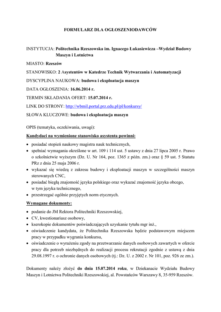 FORMULARZ DLA OGŁOSZENIODAWCÓW INSTYTUCJA: Politechnika Rzeszowska im. Ignacego Łukasiewicza –Wydział Budowy Maszyn i Lotnictwa MIASTO: Rzeszów STANOWISKO: 2 Asystentów w Katedrze Technik Wytwarzania i Automatyzacji DYSCYPLINA NAUKOWA: budowa i eksploatacja maszyn DATA OGŁOSZENIA: 16.06.2014 r. TERMIN SKŁADANIA OFERT: 15.07.2014 r. LINK DO STRONY: http://wbmil.portal.prz.edu.pl/pl/konkursy/ SŁOWA KLUCZOWE: budowa i eksploatacja maszyn OPIS (tematyka, oczekiwania, uwagi): Kandydaci na wymienione stanowisko asystenta powinni: posiadać stopień naukowy magistra nauk technicznych, spełniać wymagania określone w art. 109 i 114 ust. 5 ustawy z dnia 27 lipca 2005 r. Prawo o szkolnictwie wyższym (Dz. U. Nr 164, poz. 1365 z późn. zm.) oraz § 59 ust. 5 Statutu PRz z dnia 25 maja 2006 r. wykazać się wiedzą z zakresu budowy i eksploatacji maszyn w szczególności maszyn sterowanych CNC, posiadać biegłą znajomość języka polskiego oraz wykazać znajomość języka obcego, w tym języka technicznego, przestrzegać ogólnie przyjętych norm etycznych. Wymagane dokumenty: podanie do JM Rektora Politechniki Rzeszowskiej, CV, kwestionariusz osobowy, kserokopie dokumentów poświadczających uzyskanie tytułu mgr inż., oświadczenie kandydata, że Politechnika Rzeszowska będzie podstawowym miejscem pracy w przypadku wygrania konkursu, oświadczenie o wyrażeniu zgody na przetwarzanie danych osobowych zawartych w ofercie pracy dla potrzeb niezbędnych do realizacji procesu rekrutacji zgodnie z ustawą z dnia 29.08.1997 r. o ochronie danych osobowych (tj.: Dz. U. z 2002 r. Nr 101, poz. 926 ze zm.). Dokumenty należy złożyć do dnia 15.07.2014 roku, w Dziekanacie Wydziału Budowy Maszyn i Lotnictwa Politechniki Rzeszowskiej, al. Powstańców Warszawy 8, 35-959 Rzeszów. Politechnika Rzeszowska zastrzega sobie prawo do zamknięcia konkursu bez wyłaniania kandydata. Niepoinformowanie kandydata o wynikach konkursu jest równoznaczne z odrzuceniem jego oferty.