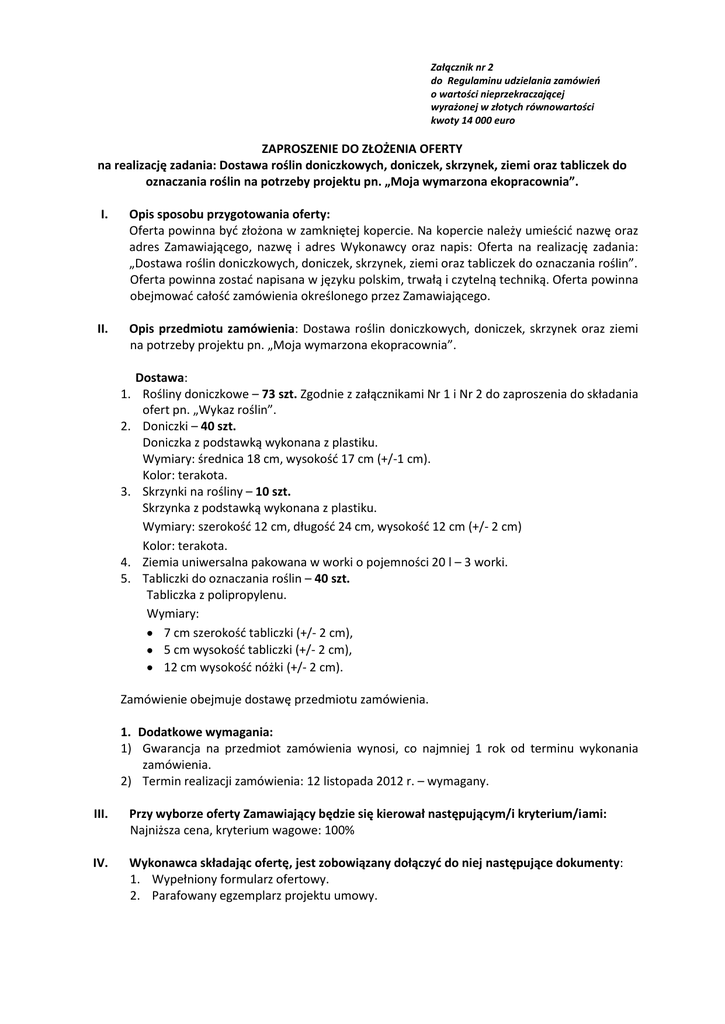 Załącznik nr 2 do Regulaminu udzielania zamówieo o wartości nieprzekraczającej wyrażonej w złotych równowartości kwoty 14 000 euro ZAPROSZENIE DO ZŁOŻENIA OFERTY na realizację zadania: Dostawa roślin doniczkowych, doniczek, skrzynek, ziemi oraz tabliczek do oznaczania roślin na potrzeby projektu pn. „Moja wymarzona ekopracownia”. I. Opis sposobu przygotowania oferty: Oferta powinna byd złożona w zamkniętej kopercie. Na kopercie należy umieścid nazwę oraz adres Zamawiającego, nazwę i adres Wykonawcy oraz napis: Oferta na realizację zadania: „Dostawa roślin doniczkowych, doniczek, skrzynek, ziemi oraz tabliczek do oznaczania roślin”. Oferta powinna zostad napisana w języku polskim, trwałą i czytelną techniką. Oferta powinna obejmowad całośd zamówienia określonego przez Zamawiającego. II. Opis przedmiotu zamówienia: Dostawa roślin doniczkowych, doniczek, skrzynek oraz ziemi na potrzeby projektu pn. „Moja wymarzona ekopracownia”. Dostawa: 1. Rośliny doniczkowe – 73 szt. Zgodnie z załącznikami Nr 1 i Nr 2 do zaproszenia do składania ofert pn. „Wykaz roślin”. 2. Doniczki – 40 szt. Doniczka z podstawką wykonana z plastiku. Wymiary: średnica 18 cm, wysokośd 17 cm (+/-1 cm). Kolor: terakota. 3. Skrzynki na rośliny – 10 szt. Skrzynka z podstawką wykonana z plastiku. Wymiary: szerokośd 12 cm, długośd 24 cm, wysokośd 12 cm (+/- 2 cm) Kolor: terakota. 4. Ziemia uniwersalna pakowana w worki o pojemności 20 l – 3 worki. 5. Tabliczki do oznaczania roślin – 40 szt. Tabliczka z polipropylenu. Wymiary: 7 cm szerokośd tabliczki (+/- 2 cm), 5 cm wysokośd tabliczki (+/- 2 cm), 12 cm wysokośd nóżki (+/- 2 cm). Zamówienie obejmuje dostawę przedmiotu zamówienia. 1. Dodatkowe wymagania: 1) Gwarancja na przedmiot zamówienia wynosi, co najmniej 1 rok od terminu wykonania zamówienia. 2) Termin realizacji zamówienia: 12 listopada 2012 r. – wymagany. III. Przy wyborze oferty Zamawiający będzie się kierował następującym/i kryterium/iami: Najniższa cena, kryterium wagowe: 100% IV. Wykonawca składając ofertę, jest zobowiązany dołączyd do niej następujące dokumenty: 1. Wypełniony formularz ofertowy. 2. Parafowany egzemplarz projektu umowy. V. Opis sposobu obliczania ceny: W cenę oferty należy wliczyd wszystkie koszty wykonania przedmiotu zamówienia. Wykonawca jest zobowiązany do podania ceny netto usługi będącej przedmiotem zamówienia powiększonej o obowiązujący podatek VAT. VI. Cena podana przez Wykonawcę za świadczoną dostawę obowiązuje przez cały okres obowiązywania umowy i nie będzie podlegała waloryzacji. VII. Miejsce i termin złożenia oferty: Ofertę należy złożyd w terminie do dnia: 17 października 2012 r. do godz. 12:00 w siedzibie Zamawiającego ul. Staromiejska 6, 26-300 Opoczno, sekretariat Urzędu Miejskiego, w zamkniętej kopercie opisanej zgodnie ze wskazówkami z pkt. I. Oferta otrzymana przez Zamawiającego po upływie terminu na składanie ofert zostanie zwrócona bez otwierania Wykonawcy i nie będzie podlegała procesowi oceny. Wykonawca może złożyd tylko jedną ofertę, wykonawca może wprowadzid zmiany lub wycofad złożona przez siebie ofertę przed upływem terminu wyznaczonego na składanie ofert. VIII. Miejsce oraz termin otwarcia oferty: Otwarcie złożonych w postępowaniu ofert nastąpi 17 października 2012 r. godz. 12:30 w siedzibie Zamawiającego ul. Staromiejska 6, 26-300 Opoczno, pok. B2. Osobą uprawnioną do kontaktów z Wykonawcą jest Pani Magdalena Jarzębowska, tel. 44 736-31-27. IX. Informacje dotyczące zawarcia umowy: W terminie do 3 dni od dnia powiadomienia przez Zamawiającego o wyborze oferty Wykonawca, którego oferta została uznana za najkorzystniejszą w postępowaniu, jest zobowiązany do podpisania umowy. Umowa musi zawierad w swojej treści wszystkie elementy oferty Wykonawcy. …………………………………….. (data, podpis) Załączniki: 1. Wykaz roślin – załączniki Nr 1, Nr 2. 2. Formularz ofertowy. 3. Projekt umowy.