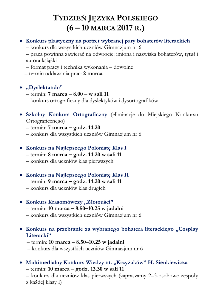 TYDZIEŃ JĘZYKA POLSKIEGO (6 – 10 MARCA 2017 R.) • Konkurs plastyczny na portret wybranej pary bohaterów literackich – konkurs dla wszystkich uczniów Gimnazjum nr 6 – praca powinna zawierać na odwrocie: imiona i nazwiska bohaterów, tytuł i autora książki – format pracy i technika wykonania – dowolne – termin oddawania prac: 2 marca • „Dyslektando” – termin: 7 marca – 8.00 – w sali 11 – konkurs ortograficzny dla dyslektyków i dysortografików • Szkolny Konkurs Ortograficzny (eliminacje do Miejskiego Konkursu Ortograficznego) – termin: 7 marca – godz. 14.20 – konkurs dla wszystkich uczniów Gimnazjum nr 6 • Konkurs na Najlepszego Polonistę Klas I – termin: 8 marca – godz. 14.20 w sali 11 – konkurs dla uczniów klas pierwszych • Konkurs na Najlepszego Polonistę Klas II – termin: 9 marca – godz. 14.20 w sali 11 – konkurs dla uczniów klas drugich • Konkurs Krasomówczy „Złotouści” – termin: 10 marca – 8.50–10.25 w jadalni – konkurs dla wszystkich uczniów Gimnazjum nr 6 • Konkurs na przebranie za wybranego bohatera literackiego „Cosplay Literacki” – termin: 10 marca – 8.50–10.25 w jadalni – konkurs dla wszystkich uczniów Gimnazjum nr 6 • Multimedialny Konkurs Wiedzy nt. „Krzyżaków” H. Sienkiewicza – termin: 10 marca – godz. 13.30 w sali 11 – konkurs dla uczniów klas pierwszych (zapraszamy 2–3-osobowe zespoły z każdej klasy I)