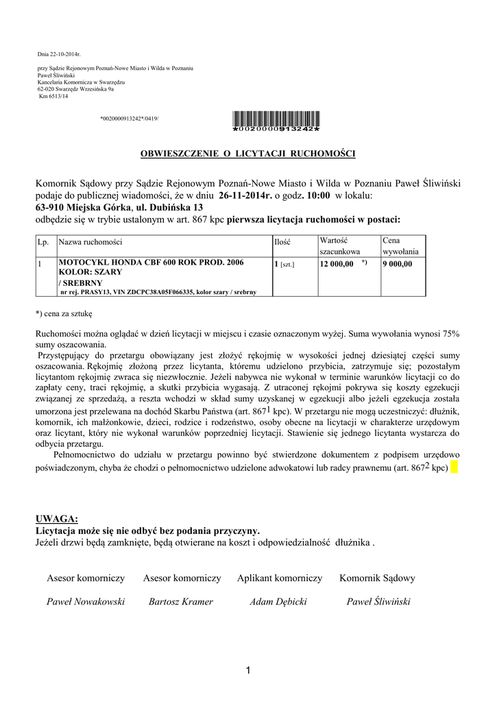 Dnia 22-10-2014r. przy Sądzie Rejonowym Poznań-Nowe Miasto i Wilda w Poznaniu Paweł Śliwiński Kancelaria Komornicza w Swarzędzu 62-020 Swarzędz Wrzesińska 9a Km 6513/14 *0020000913242*/0419/ *0020000913242* OBWIESZCZENIE O LICYTACJI RUCHOMOŚCI Komornik Sądowy przy Sądzie Rejonowym Poznań-Nowe Miasto i Wilda w Poznaniu Paweł Śliwiński podaje do publicznej wiadomości, że w dniu 26-11-2014r. o godz. 10:00 w lokalu: 63-910 Miejska Górka, ul. Dubińska 13 odbędzie się w trybie ustalonym w art. 867 kpc pierwsza licytacja ruchomości w postaci: Lp. Nazwa ruchomości Ilość 1 MOTOCYKL HONDA CBF 600 ROK PROD. 2006 KOLOR: SZARY / SREBRNY 1 [szt.] Wartość szacunkowa 12 000,00 *) Cena wywołania 9 000,00 .nr rej. PRASY13, VIN ZDCPC38A05F066335, kolor szary / srebrny *) cena za sztukę Ruchomości można oglądać w dzień licytacji w miejscu i czasie oznaczonym wyżej. Suma wywołania wynosi 75% sumy oszacowania. Przystępujący do przetargu obowiązany jest złożyć rękojmię w wysokości jednej dziesiątej części sumy oszacowania. Rękojmię złożoną przez licytanta, któremu udzielono przybicia, zatrzymuje się; pozostałym licytantom rękojmię zwraca się niezwłocznie. Jeżeli nabywca nie wykonał w terminie warunków licytacji co do zapłaty ceny, traci rękojmię, a skutki przybicia wygasają. Z utraconej rękojmi pokrywa się koszty egzekucji związanej ze sprzedażą, a reszta wchodzi w skład sumy uzyskanej w egzekucji albo jeżeli egzekucja została umorzona jest przelewana na dochód Skarbu Państwa (art. 8671 kpc). W przetargu nie mogą uczestniczyć: dłużnik, komornik, ich małżonkowie, dzieci, rodzice i rodzeństwo, osoby obecne na licytacji w charakterze urzędowym oraz licytant, który nie wykonał warunków poprzedniej licytacji. Stawienie się jednego licytanta wystarcza do odbycia przetargu. Pełnomocnictwo do udziału w przetargu powinno być stwierdzone dokumentem z podpisem urzędowo poświadczonym, chyba że chodzi o pełnomocnictwo udzielone adwokatowi lub radcy prawnemu (art. 8672 kpc) UWAGA: Licytacja może się nie odbyć bez podania przyczyny. Jeżeli drzwi będą zamknięte, będą otwierane na koszt i odpowiedzialność dłużnika . Asesor komorniczy Asesor komorniczy Aplikant komorniczy Komornik Sądowy Paweł Nowakowski Bartosz Kramer Adam Dębicki Paweł Śliwiński 1 2