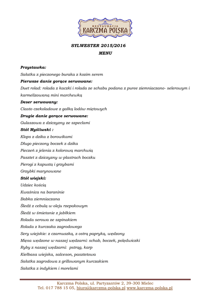 SYLWESTER 2015/2016 MENU Przystawka: Sałatka z pieczonego buraka z kozim serem Pierwsze danie gorące serwowane: Duet rolad: rolada z kaczki i rolada ze schabu podana z puree ziemniaczano- selerowym i karmelizowaną mini marchewką Deser serwowany: Ciasto czekoladowe z gałką lodów miętowych Drugie danie gorące serwowane: Gulaszowa z dziczyzny ze szpeclami Stół Myśliwski : Klops z dzika z borowikami Długo pieczony boczek z dzika Pieczeń z jelenia z kolorową marchwią Pasztet z dziczyzny w plastrach boczku Pierogi z kapustą i grzybami Grzybki marynowane Stół wiejski: Udziec kością Kwaśnica na baraninie Babka ziemniaczana Śledź z cebulą w oleju rzepakowym Śledź w śmietanie z jabłkiem Rolada serowa ze szpinakiem Rolada z kurczaka zagrodowego Sery wiejskie: z czarnuszką, z ostrą papryką, wędzony Mięsa wędzone w naszej wędzarni: schab, boczek, polędwiczki Ryby z naszej wędzarni: pstrąg, karp Kiełbasa wiejska, salceson, pasztetowa Sałatka zagrodowa z grillowanym kurczakiem Sałatka z indykiem i morelami Karczma Polska, ul. Partyzantów 2, 39-300 Mielec Tel. 017 788 15 05, [email protected] www.karczma-polska.pl Galaretka drobiowa Wędliny wiejskie tradycyjne Gęsi smalczyk Proziaki i buchty, pieczywo Smalczyki smakowe Ogórki kiszone Sosy do mięs O północy ognisko: Kiełbasa z kija Żur staropolski Grzaniec galicyjski Stół słodki: Ciasta własnego wypieku Owoce Napoje bez ograniczeń: Kawa/herbata Pepsi/7 UP/ Mirinda Soki owocowe Woda mineralna Alkohol: Wódka 0,7 l lub wino na parę Dodatkowo 50% zniżki na pozostałe alkohole zakupione w barze Cena 199,00 zł/osoba Karczma Polska, ul. Partyzantów 2, 39-300 Mielec Tel. 017 788 15 05, [email protected] www.karczma-polska.pl