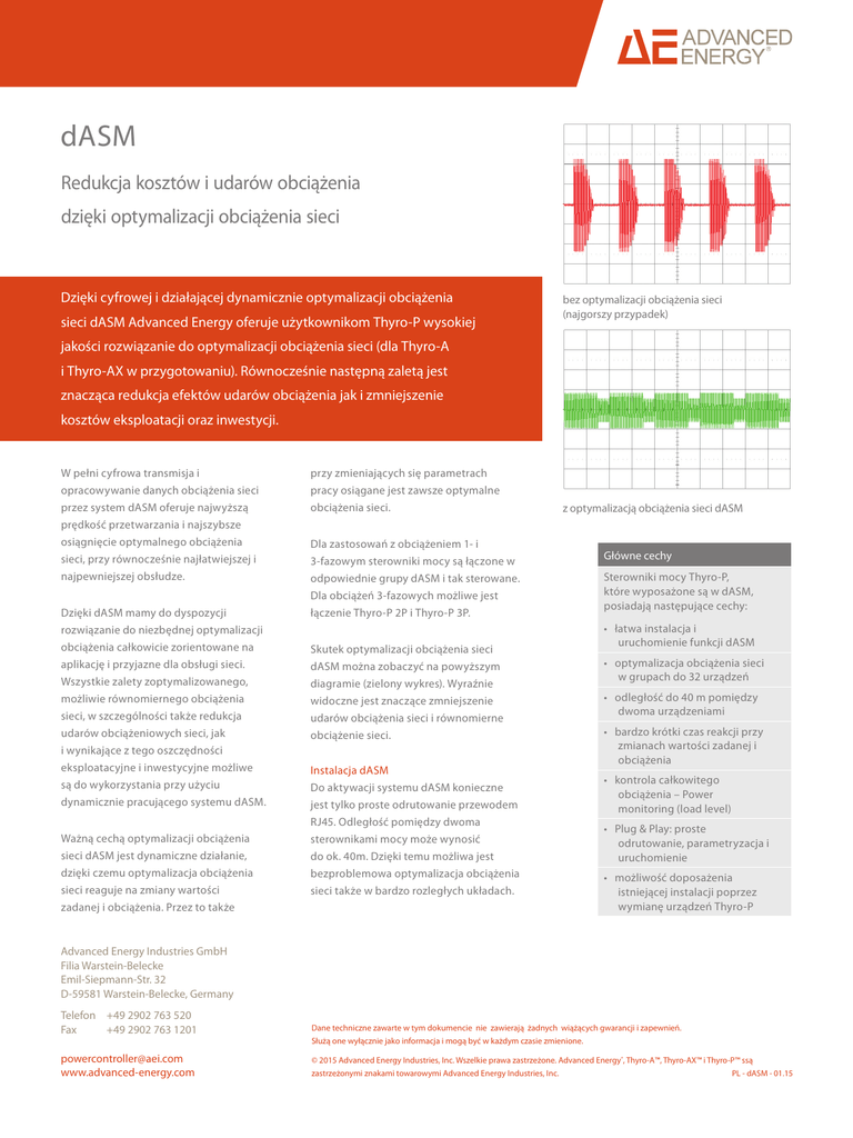 dasm Redukcja kosztów i udarów obciążenia dzięki optymalizacji obciążenia sieci Dzięki cyfrowej i działającej dynamicznie optymalizacji obciążenia sieci dASM Advanced Energy oferuje użytkownikom Thyro-P wysokiej bez optymalizacji obciążenia sieci (najgorszy przypadek) jakości rozwiązanie do optymalizacji obciążenia sieci (dla Thyro-A i Thyro-AX w przygotowaniu). Równocześnie następną zaletą jest znacząca redukcja efektów udarów obciążenia jak i zmniejszenie kosztów eksploatacji oraz inwestycji. W pełni cyfrowa transmisja i opracowywanie danych obciążenia sieci przez system dASM oferuje najwyższą prędkość przetwarzania i najszybsze osiągnięcie optymalnego obciążenia sieci, przy równocześnie najłatwiejszej i najpewniejszej obsłudze. Dzięki dASM mamy do dyspozycji rozwiązanie do niezbędnej optymalizacji obciążenia całkowicie zorientowane na aplikację i przyjazne dla obsługi sieci. Wszystkie zalety zoptymalizowanego, możliwie równomiernego obciążenia sieci, w szczególności także redukcja udarów obciążeniowych sieci, jak i wynikające z tego oszczędności eksploatacyjne i inwestycyjne możliwe są do wykorzystania przy użyciu dynamicznie pracującego systemu dASM. Ważną cechą optymalizacji obciążenia sieci dASM jest dynamiczne działanie, dzięki czemu optymalizacja obciążenia sieci reaguje na zmiany wartości zadanej i obciążenia. Przez to także przy zmieniających się parametrach pracy osiągane jest zawsze optymalne obciążenia sieci. z optymalizacją obciążenia sieci dASM Dla zastosowań z obciążeniem 1- i 3-fazowym sterowniki mocy są łączone w odpowiednie grupy dASM i tak sterowane. Dla obciążeń 3-fazowych możliwe jest łączenie Thyro-P 2P i Thyro-P 3P. Skutek optymalizacji obciążenia sieci dASM można zobaczyć na powyższym diagramie (zielony wykres). Wyraźnie widoczne jest znaczące zmniejszenie udarów obciążenia sieci i równomierne obciążenie sieci. Instalacja dASM Do aktywacji systemu dASM konieczne jest tylko proste odrutowanie przewodem RJ45. Odległość pomiędzy dwoma sterownikami mocy może wynosić do ok. 40m. Dzięki temu możliwa jest bezproblemowa optymalizacja obciążenia sieci także w bardzo rozległych układach. Główne cechy Sterowniki mocy Thyro-P, które wyposażone są w dASM, posiadają następujące cechy: • ł atwa instalacja i uruchomienie funkcji dASM • o ptymalizacja obciążenia sieci w grupach do 32 urządzeń • o dległość do 40 m pomiędzy dwoma urządzeniami • b ardzo krótki czas reakcji przy zmianach wartości zadanej i obciążenia • k ontrola całkowitego obciążenia – Power monitoring (load level) • P lug & Play: proste odrutowanie, parametryzacja i uruchomienie • m ożliwość doposażenia istniejącej instalacji poprzez wymianę urządzeń Thyro-P Advanced Energy Industries GmbH Filia Warstein-Belecke Emil-Siepmann-Str. 32 D-59581 Warstein-Belecke, Germany Telefon +49 2902 763 520 Fax +49 2902 763 1201 Dane techniczne zawarte w tym dokumencie nie zawierają żadnych wiążących gwarancji i zapewnień. [email protected] www.advanced-energy.com zastrzeżonymi znakami towarowymi Advanced Energy Industries, Inc. Służą one wyłącznie jako informacja i mogą być w każdym czasie zmienione. © 2015 Advanced Energy Industries, Inc. Wszelkie prawa zastrzeżone. Advanced Energy®, Thyro-A™, Thyro-AX™ i Thyro-P™ ssą PL - dASM - 01.15 dasm Reduced costs and reduced flicker effects by mains load optimization With the digital and dynamic operating mains load optimization dASM, Advanced Energy offers a high efficiency solution of mains without mains load optimization (worst case) load optimization for users of Thyro-P (upcoming for Thyro-A and Thyro-AX). At the same time further advantages are the significant reductions of flicker effects as well as possible cost reductions of operating and investment costs. By transmitting and processing mains load data digitally, dASM technology offers the maximum processing speed possible, quickly achieving an optimized network load. At the same time, it provides simple and safe handling. dASM is an application-oriented and user-friendly solution of optimizing mains loads. Customers can benefit from all advantages of optimized and mainly smooth network load by using the dynamic operating dASM technology. Furthermore dASM offers reduction of peak loads, and subsequently resulting cost savings for investment and operating costs. The dASM mains load optimization operates dynamically, which means it also reacts to setpoint and load changes. In this way an optimal network load will always be reached even when the operating values change. For applications with 1- or 3-phase loads, power controllers are pooled in appropriate dASM groups and are operated jointly. A combination of Thyro-P 2P and Thyro-P 3P can also be used for 3-phase loads. The results of the dASM mains load optimization are illustrated in the diagram above (green diagram). It clearly shows the significant reduced peak loads and the smooth network load. dASM installation The dASM mains load optimization can be activated by easy wiring using RJ45 plugs. The distance between two power controllers can be up to approximately 40 meters. Thus mains load optimization can be optimized without problems even for very large installations. dASM mains load optimization Key features Thyro-P power controllers have the following features when equipped with dASM: • E asy installation and commissioning of dASM feature • M ains load optimization in groups of up to 32 units • D istance of up to 40 meters between two power controllers • V ery short response times for setpoint and load changes • M onitoring of total load Power monitoring (load level) • P lug & Play: Easy wiring, parameter-setting and commissioning • R etrofittable to existing units by replacing the Thyro-P control unit Advanced Energy Industries GmbH Branch office Warstein-Bel