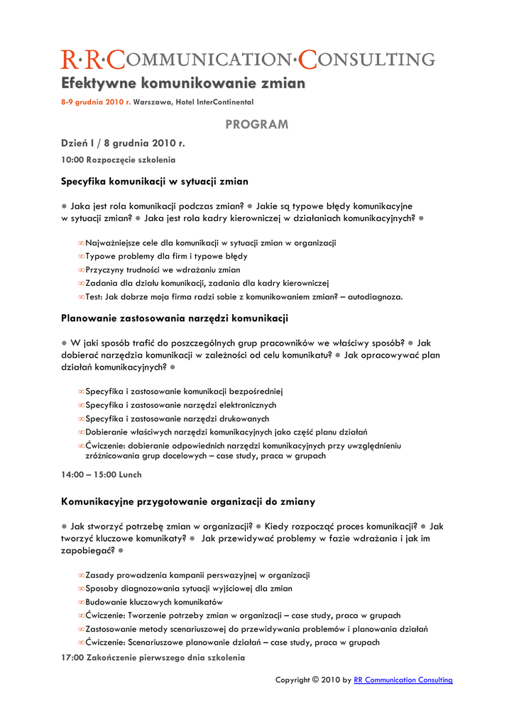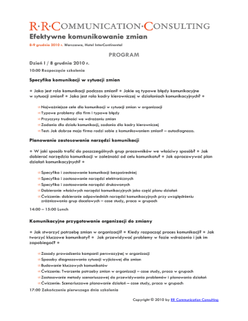 Efektywne komunikowanie zmian 8-9 grudnia 2010 r. Warszawa, Hotel InterContinental PROGRAM Dzień I / 8 grudnia 2010 r. 10:00 Rozpoczęcie szkolenia Specyfika komunikacji w sytuacji zmian ● Jaka jest rola komunikacji podczas zmian? ● Jakie są typowe błędy komunikacyjne w sytuacji zmian? ● Jaka jest rola kadry kierowniczej w działaniach komunikacyjnych? ● • • • • • Najważniejsze cele dla komunikacji w sytuacji zmian w organizacji Typowe problemy dla firm i typowe błędy Przyczyny trudności we wdrażaniu zmian Zadania dla działu komunikacji, zadania dla kadry kierowniczej Test: Jak dobrze moja firma radzi sobie z komunikowaniem zmian? – autodiagnoza. Planowanie zastosowania narzędzi komunikacji ● W jaki sposób trafić do poszczególnych grup pracowników we właściwy sposób? ● Jak dobierać narzędzia komunikacji w zależności od celu komunikatu? ● Jak opracowywać plan działań komunikacyjnych? ● • • • • • Specyfika i zastosowanie komunikacji bezpośredniej Specyfika i zastosowanie narzędzi elektronicznych Specyfika i zastosowanie narzędzi drukowanych Dobieranie właściwych narzędzi komunikacyjnych jako część planu działań Ćwiczenie: dobieranie odpowiednich narzędzi komunikacyjnych przy uwzględnieniu zróżnicowania grup docelowych – case study, praca w grupach 14:00 – 15:00 Lunch Komunikacyjne przygotowanie organizacji do zmiany ● Jak stworzyć potrzebę zmian w organizacji? ● Kiedy rozpocząć proces komunikacji? ● Jak tworzyć kluczowe komunikaty? ● Jak przewidywać problemy w fazie wdrażania i jak im zapobiegać? ● • • • • • • Zasady prowadzenia kampanii perswazyjnej w organizacji Sposoby diagnozowania sytuacji wyjściowej dla zmian Budowanie kluczowych komunikatów Ćwiczenie: Tworzenie potrzeby zmian w organizacji – case study, praca w grupach Zastosowanie metody scenariuszowej do przewidywania problemów i planowania działań Ćwiczenie: Scenariuszowe planowanie działań – case study, praca w grupach 17:00 Zakończenie pierwszego dnia szkolenia Copyright © 2010 by RR Communication Consulting Dzień II / 9 grudnia 2010 r. 9:00 Rozpoczęcie szkolenia Działania komunikacyjne w trakcie wdrażania zmiany ● Jak zmieniają się nastawienia pracowników w poszczególnych fazach zmian? ● Jak dopasować działania komunikacyjne do poszczególnych faz zmian? ● Jak angażować kierowników do komunikowania zmian? ● • Fazy zmian i nastawienia pracowników • Ćwiczenie: Kluczowe działania komunikacyjne w poszczególnych fazach zmian – praca w grupach • Zastosowanie dialogowych form komunikacji • Sposoby angażowania kierowników do komunikowania zmian • Ćwiczenie: Przygotowanie materiałów pomocniczych dla kierowników liniowych Specyfika komunikowania zróżnicowanych typów zmian ● Na co kłaść nacisk w działaniach komunikacyjnych w różnych sytuacjach zmian? ● Jakie kluczowe treści przekazywać pracownikom? ● Jakie sposoby komunikacji wykorzystywać? ● • • • • Specyfika komunikacji w sytuacji restrukturyzacji i zwolnień Specyfika komunikacji podczas wprowadzania nowych rozwiązań organizacyjnych Specyfika komunikacji w sytuacji zmiany kulturowej Specyfika komunikacji przy zmianach wynagrodzeń 13:00 – 14:00 Lunch Specyfika komunikowania zróżnicowanych typów zmian – c.d. • Ćwiczenie: Opracowanie planu komunikacji w sytuacji zmian dla mojej firmy – praca w grupach 16:00 Zakończenie szkolenia Copyright © 2010 by RR Communication Consulting