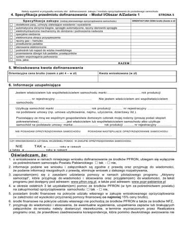 Należy wypełnić w przypadku wniosku dot. dofinansowania zakupu / montażu oprzyrządowania do posiadanego samochodu 4. Specyfikacja przedmiotu dofinansowania - Moduł I/Obszar A/Zadanie 1 S p e c y f i k a c j a z a k u p u (rodzaj planowanego oprzyrządowania samochodu) £ £ £ £ £ £ £ £ £ £ £ £ STRONA 5 ORIENTACYJNA CENA brutto (kwota w zł) dodatkowe pasy, uchwyty ułatwiające wsiadanie i wysiadanie automatyczna skrzynia biegów, sprzęgło automatyczne, ręczny sterownik sprzęgła elektrohydrauliczne mechanizmy do obniżania i podnoszenia nadwozia specjalne siedzenia elektroniczna obręcz przyspieszenia ręczny gaz – hamulec przedłużenie pedałów sterowanie elektroniczne podnośnik lub najazd do wózka inwalidzkiego przeniesienie dźwigni lub pedałów, przełączników system wspomagania parkowania inne, jakie: RAZEM 5. Wnioskowana kwota dofinansowania Orientacyjna cena brutto (razem z pkt 4 – w zł) Kwota wnioskowana (w zł) 6. Informacje uzupełniające Jestem właścicielem lub współwłaścicielem samochodu marki:...................................rok produkcji .............., nr rejestracyjny ..................................... samochodu Nie jestem właścicielem ani współwłaścicielem Użytkuję samochód marki ..................................... rok produkcji ........... nr rejestracyjny .......................... na podstawie umowy (np. umowa użytkowania, najmu, użyczenia, dzierżawy itd.). Pozostający ze mną we wspólnym gospodarstwie domowym członek mojej rodziny (proszę podać stopień pokrewieństwa)...............................jest właścicielem lub współwłaścicielem samochodu albo użytkuje samochód na podstawie umowy: marka:........................... rok produkcji .........., nr rejestracyjny ................ NIE POSIADAM OPRZYRZĄDOWANIA SAMOCHODU POSIADAM NASTĘPUJĄCE OPRZYRZĄDOWANIE SAMOCHODU: ............................................................................................................................. CZY WNIOSKODAWCA UZYSKAŁ WCZEŚNIEJ POMOC W ZAKUPIE OPRZYRZĄDOWANIA SAMOCHODU: NIE TAK w . . . . . . . . . . . . r o k u w r a m a c h . . . . . . . . . . . . . . . . . . . . . . . . . . . . . . . . . . . . . . . . . . . . . . . . . . . . . . . . . . . . . . . . . . . . . . . . . . . . . . . . . . . . . . . . . . . . . . a także w .................... roku w ramach ........................................................................................................... Oświadczam, że: 1. o wnioskowane w ramach niniejszego wniosku dofinansowanie ze środków PFRON, ubiegam się wyłącznie za pośrednictwem samorządu Powiatu Pabianickiego £ tak - £ nie, 2. informacje podane we wniosku i załącznikach są zgodne z prawdą oraz przyjmuję do wiadomości, że podanie informacji niezgodnych z prawdą, eliminuje wniosek z dalszego rozpatrywania, 3. zapoznałam(em) się z zasadami udzielania pomocy w ramach pilotażowego programu „Aktywny samorząd”, które przyjmuję do wiadomości i stosowania oraz przyjęłam(em) do wiadomości, że tekst programu jest dostępny pod adresem: www.pfron.org.pl, a także pod adresem: www.pcpr-pabianice.pl 4. w okresie ostatnich 3 lat uzyskałam(em) pomoc ze środków PFRON (w tym za pośrednictwem powiatu) na zakup/montaż oprzyrządowania samochodu: £ tak - £ nie, 5. posiadam środki finansowe na pokrycie udziału własnego w zakupie wnioskowanego oprzyrządowania (w zależności od wysokości przyznanej pomocy finansowej co najmniej 15% ceny brutto), 6. środki finansowe na pokrycie udziału własnego nie pochodzą ze środków PFRON a także ze środków NFZ, 7. przyjmuję do wiadomości i stosowania, że ewentualne wyjaśnienia, uzupełnienia zapisów lub brakujących załączników do wniosku należy dostarczyć niezwłocznie, w terminie wyznaczonym przez Realizatora programu oraz, że prawidłowo zaadresowana korespondencja, która pomimo dwukrotnego awizowania nie zostanie odebrana, uznawana będzie za doręczoną, STRONA 6 8 . w ciągu ostatnich 3 lat byłem(am) stroną umowy dofinansowania ze środków PFRON i rozwiązanej z przyczyn leżących po mojej stronie: £ tak - £ nie, 9. przyjmuję do wiadomości i stosowania, iż złożenie niniejszego wniosku o dofinansowanie nie gwarantuje uzyskania pomocy w ramach realizacji programu oraz, że warunkiem zawarcia umowy dofinansowania jest spełnianie warunków uczestnictwa określonych w programie także w dniu podpisania umowy, 10. przyjmuję do wiadomości i stosowania, iż w przypadku przyznanego dofinansowania, przekazanie środków finansowych PFRON następuje na rachunek sprzedawcy przedmiotu zakupu, na podstawie przedstawionej i podpisanej przez Wnioskodawcę faktury VAT. Wnioskodawca nie mogący pisać, lecz mogący czytać, zamiast podpisu może uczynić na dokumencie tuszowy odcisk palca, a obok tego odcisku inna osoba wypisze jej imię i nazwisko umieszczając swój podpis; zamiast Wnioskodawcy może także podpisać się inna osoba, z tym że jej podpis musi być poświadczony przez notariusza lub wójta (burmistrza, prezydenta miasta), starostę lub marszałka województwa z zaznaczeniem, że podpis został złożony na życzenie nie mogącego pisać, lecz mogącego czytać. ...................................... dnia ..... /....... /20... r. ............................ podpis Wnioskodawcy 7. Załączniki: wymagane do wniosku oraz dodatkowe (wiersze 6 - 12) WYPEŁNIA WYŁĄCZNIE REALIZATOR PROGRAMU (należy zaznaczyć właściwe) Nazwa załącznika 1. Kserokopia aktualnego orzeczenia o znacznym lub umiarkowanym stopniu niepełnosprawności lub orzeczenia równoważnego albo orzeczenia o niepełnosprawności podopiecznego (osoby do 16 roku życia) 2. Oświadczenie o wysokości średnich miesięcznych dochodów w przeliczeniu na jednego członka rodziny pozostającego we wspólnym gospodarstwie domowym (sporządzone wg wzoru określonego w załączniku nr 1 do wniosku) 3. Oświadczenie o wyraże