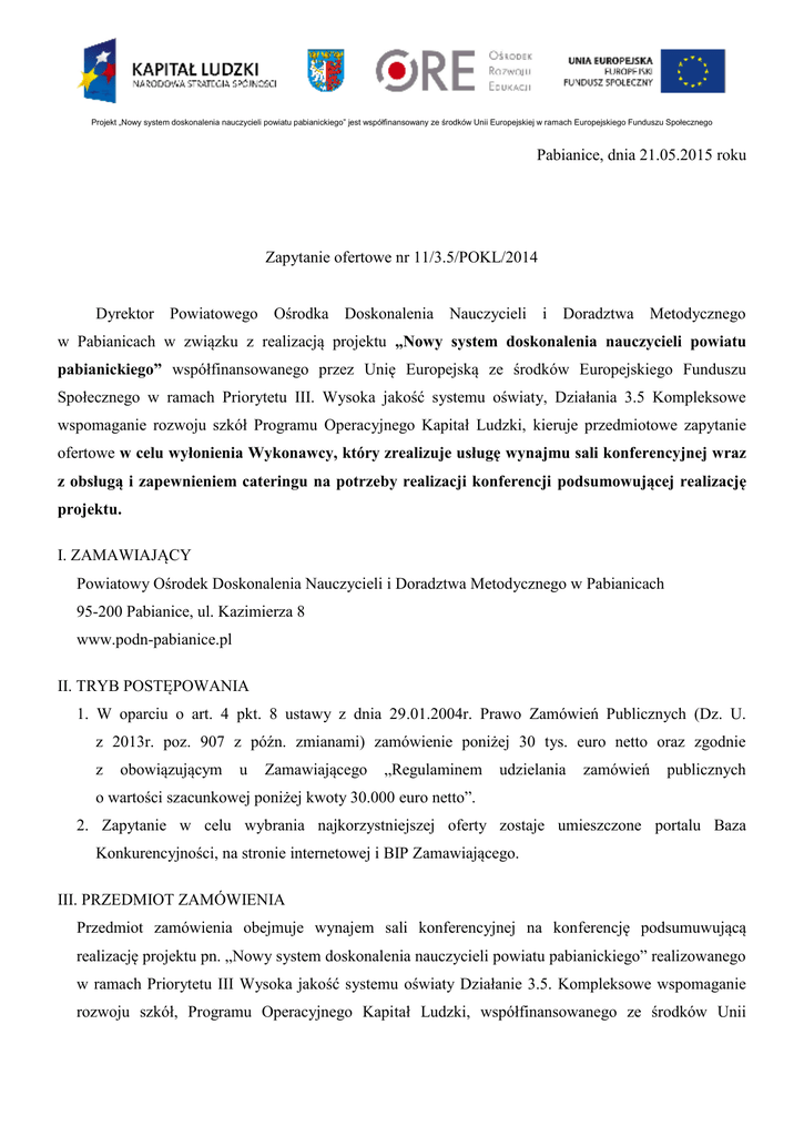 Pabianice, dnia 21.05.2015 roku Zapytanie ofertowe nr 11/3.5/POKL