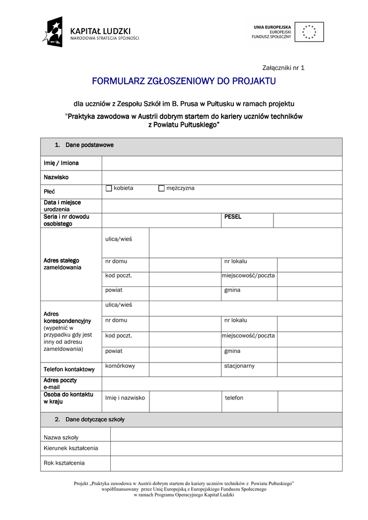 Załączniki nr 1 FORMULARZ ZGŁOSZENIOWY DO PROJAKTU dla uczniów z Zespołu Szkół im B. Prusa w Pułtusku w ramach projektu "Praktyka Praktyka zawodowa w Austrii dobrym startem do kariery uczniów techników z Powiatu Pułtuskiego” 1. Dane podstawowe Imię / Imiona Nazwisko Nazwisko kobieta Płeć Data i miejsce urodzenia Seria i nr dowodu osobistego mężczyzna PESEL ulica/wieś Adres stałego zameldowania nr domu kod poczt. powiat nr lokalu miejscowość/poczta gmina ulica/wieś Adres korespondencyjny (wypełnić w przypadku gdy jest inny od adresu zameldowania) Telefon kontaktowy Adres poczty e-mail Osoba do kontaktu kontaktu w kraju nr domu kod poczt. nr lokalu miejscowość/poczta powiat gmina komórkowy stacjonarny Imię i nazwisko telefon 2. Dane dotyczące szkoły Nazwa szkoły Kierunek kształcenia Rok kształcenia Projekt „Praktyka zawodowa w Austrii dobrym startem do kariery uczniów techników z Powiatu Pułtuskiego” współfinansowany przez Unię Europejską z Europejskiego Funduszu Społecznego w ramach Programu Operacyjnego Kapitał Ludzki Średnia ocen na koniec semestru roku szkol. 2012/2013 3. Osiągnięcia szkolne i pozaszkolne Udział w konkursach kulinarnych szkolnych Udział w olimpiadach o tematyce zawodowej, etap szkolny Udział w konkursach, turniejach kulinarnych poza szkolnych Udział w olimpiadach o tematyce zawodowej, etap okręgowy TAK (w jakich) NIE TAK (w jakich) NIE TAK (w jakich) NIE TAK (w jakich) NIE Udział w poza lekcyjnych zajęciach podnoszących umiejętności praktyczne zawodowe w latach 2011-2012 Ocena z technologii gastronomiczne semestr I r.sz. 2012/2013 Czy brałaś/eś udział w wymianach, wyjazdach zagranicznych w ramach programu Leonardo da Vinci TAK (w jakich) NIE TAK (w jakich) NIE TAK NIE Opinia wychowawcy wychowawcy Projekt „Praktyka zawodowa w Austrii dobrym startem do kariery uczniów techników z Powiatu Pułtuskiego” współfinansowany przez Unię Europejską z Europejskiego Funduszu Społecznego w ramach Programu Operacyjnego Kapitał Ludzki Załącznik nr 2 DEKLARACJA UCZESTNICTWA W PROJEKCIE 1. Deklaruję udział w projekcie "Praktyka zawodowa w Austrii dobrym startem do kariery uczniów techników z Powiatu Pułtuskiego” 2. Zobowiązuję się do: a) uczestnictwa w następujących formach wsparcia: 40 godzinny kurs języka niemieckiego 3 godzinny kurs pedagogiczny 8 godzinne przygotowanie kulturowe w Austrii b) aktywnego uczestnictwa w 4-tygodniowej praktyce w Austrii oraz we wszystkich zaproponowanych działaniach zaplanowanych w ramach projektu, c) wypełniania w trakcie zajęć testów sprawdzających, ankiet poziomu zadowolenia, ankiet ewaluacyjnych, d) wzięcia udziału w badaniach ewaluacyjnych po zakończeniu projektu. 3. Oświadczam, że: zapoznałam/em się i akceptuję warunki wskazane w Regulaminie rekrutacji i uczestnictwa w projekcie "Praktyka zawodowa w Austrii dobrym startem do kariery uczniów techników z Powiatu Pułtuskiego” z własnej inicjatywy wyrażam chęć udziału w Projekcie 4. Uprzedzona/y o odpowiedzialności karnej z art.. 233 Kodeksu Karnego za złożenie nieprawidłowego oświadczenia lub zatajenie prawdy niniejszym oświadczam, że dane przedstawione w deklaracji uczestnictwa w projekcie odpowiadają stanowi faktycznemu i są zgodne z prawdą. ……………………….…… (Miejscowość, data) …………………………..… (Miejscowość, data) …………………………....... (Podpis uczestnika) …………………………........................ (Podpis rodzica/opiekuna prawnego) Projekt „Praktyka zawodowa w Austrii dobrym startem do kariery uczniów techników z Powiatu Pułtuskiego” współfinansowany przez Unię Europejską z Europejskiego Funduszu Społecznego w ramach Programu Operacyjnego Kapitał Ludzki Załącznik nr 3 OŚWIADCZENIE UCZESTNIKA PROJEKTU O WYRAŻENIU ZGODY NA PRZETWARZANIE DANYCH OSOBOWYCH W związku z przystąpieniem do projektu "Praktyka zawodowa w Austrii dobrym startem do kariery uczniów techników techników z Powiatu Pułtuskiego” wyrażam zgodę na przetwarzanie moich danych osobowych. Oświadczam, iż przyjmuję do wiadomości, że: 1. administratorem moich danych osobowych jest Minister Rozwoju Regionalnego pełniący funkcję Instytucji Zarządzającej dla Programu Operacyjnego Kapitał Ludzki, mający siedzibę przy ul. Wspólnej 2/4, 00-926 Warszawa. 2. moje dane osobowe będą przetwarzane wyłącznie w celu udzielenia wsparcia i obsługi projektu, 3. moje dane osobowe mogą zostać udostępnione innym podmiotom w celu ewaluacji, jak również w celu realizacji zadań związanych z monitoringiem i sprawozdawczością w ramach projektu "Praktyka zawodowa w Austrii dobrym startem do kariery uczniów techników z Powiatu Pułtuskiego” 4. podanie danych jest dobrowolne, aczkolwiek odmowa ich podania jest równoznaczna z brakiem możliwości udzielenia wsparcia w ramach projektu, 5. mam prawo dostępu do treści swoich danych i ich poprawiania. Oświadczam, że wyrażam zgodę na wykorzystanie w różnej formie mojego wizerunku przez Powiat Pułtuski, do celów upowszechniania rezultatów i promocji projektu "Praktyka zawodowa w Austrii dobrym startem do kariery uczniów techników z Powiatu Pułtuskiego” …………………………. .. (Miejscowość, data) ……………………………. (Miejscowość, data) …………………………....... (Podpis uczestnika) ……………………………………………… (Podpis rodzica/opiekuna prawnego) Projekt „Praktyka zawodowa w Austrii dobrym startem do kariery uczniów techników z Powiatu Pułtuskiego” współfinansowany przez Unię Europejską z Europejskiego Funduszu Społecznego w ramach Programu Operacyjnego Kapitał Ludzki Załącznik nr 4 Scenariusz rozmowy kwalifikacyjnej Część pierwsza – bank pytań w języku angielskim 1) Do you like cooking? 2) What is your favorite meal? 3) What meals can you make? 4) Can you describe traditional P