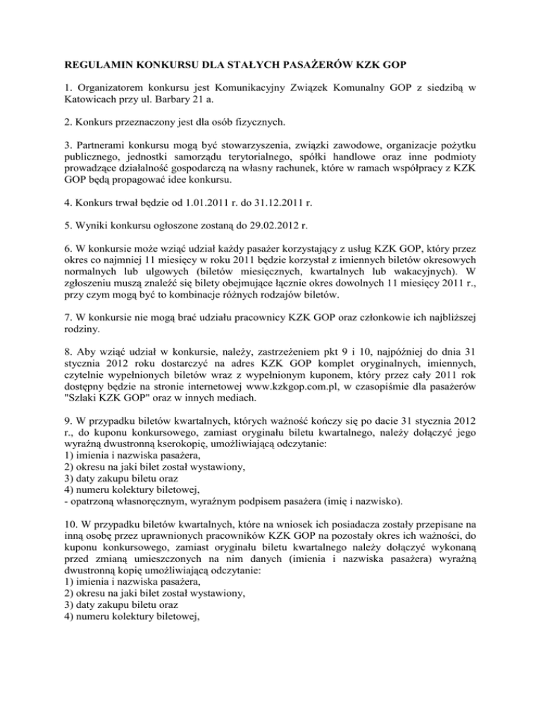 REGULAMIN KONKURSU DLA STAŁYCH PASAŻERÓW KZK GOP