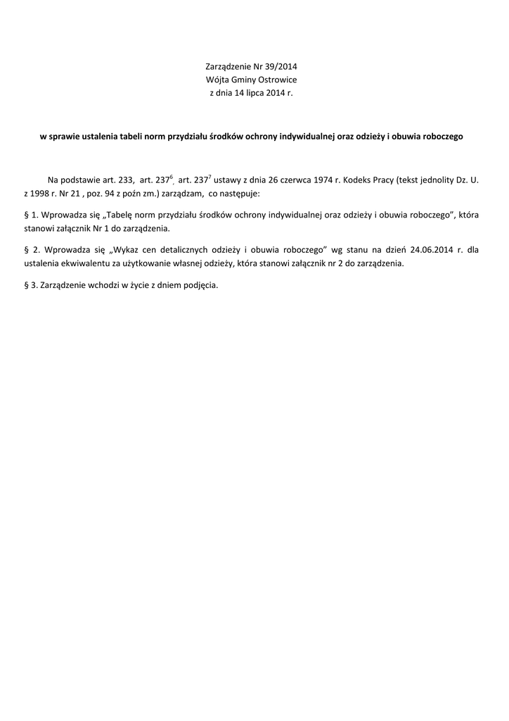 Zarządzenie Nr 39/2014 Wójta Gminy Ostrowice z dnia 14 lipca 2014 r. w sprawie ustalenia tabeli norm przydziału środków ochrony indywidualnej oraz odzieży i obuwia roboczego Na podstawie art. 233, art. 2376, art. 2377 ustawy z dnia 26 czerwca 1974 r. Kodeks Pracy (tekst jednolity Dz. U. z 1998 r. Nr 21 , poz. 94 z poźn zm.) zarządzam, co następuje: § 1. Wprowadza się „Tabelę norm przydziału środków ochrony indywidualnej oraz odzieży i obuwia roboczego”, która stanowi załącznik Nr 1 do zarządzenia. § 2. Wprowadza się „Wykaz cen detalicznych odzieży i obuwia roboczego” wg stanu na dzień 24.06.2014 r. dla ustalenia ekwiwalentu za użytkowanie własnej odzieży, która stanowi załącznik nr 2 do zarządzenia. § 3. Zarządzenie wchodzi w życie z dniem podjęcia. Załącznik nr 1 do zarządzenia nr 39/2014 z dnia 14 lipca 2014 r. Tabela norm przydziału środków ochrony indywidualnej oraz odzieży i obuwia roboczego. Stanowisko pracy Zakres wyposażenia: R - odzież i obuwie robocze O – ochrony indywidualne 1 Kierowca, konserwator 2 Konserwator wodociągów R – czapka drelichowa lub beret R – ubranie lub fartuch drelichowy R – trzewiki przemysłowe sk./gm. O – buty gumowe (w razie potrzeby) O – kamizelka lub bluza ocieplana O – kurtka przeciwdeszczowa wg potrzeb O – rękawice ochronne R – czapka drelichowa lub beret R – ubranie lub fartuch drelichowy R – trzewiki przemysłowe sk./gm. O – buty gumowe (w razie potrzeby) O – kamizelka lub bluza ocieplana O – kurtka przeciwdeszczowa wg potrzeb O – rękawice robocze O – kask ochronny O – szelki bezpieczeństwa O – linka bezpieczeństwa R – czapka drelichowa lub beret R – ubranie lub fartuch drelichowy R – trzewiki przemysłowe sk./gm. O – buty gumowe (w razie potrzeby) O – kamizelka lub bluza ocieplana O – kurtka przeciwdeszczowa wg potrzeb O – rękawice robocze O – kask ochronny O – szelki bezpieczeństwa O – linka bezpieczeństwa R – ubranie robocze R – trzewiki przemysłowe R – czapka drelichowa lub beret O – bluza ocieplana Lp. 3 4. Konserwator oczyszczalni ścieków Pracownicy interwencyjni wykonujący proste różnorodne prace Przewidywany okres używalności w miesiącach zimowych (o.z.) i do zużycia 18 miesięcy 12 miesięcy 12 miesięcy 24 miesiące 3 okresy zimowe 3 okresy zimowe 48 miesięcy do zużycia 12 miesięcy 12 miesięcy 12 miesięcy 18 miesięcy 3 okresy zimowe do zużycia do zużycia do zużycia do zużycia do zużycia 12 miesięcy 12 miesięcy 12 miesięcy 18 miesięcy 3 okresy zimowe do zużycia do zużycia do zużycia do zużycia do zużycia 12 miesięcy 18 miesięcy 18 miesięcy 3 okresy zimowe 5. Sprzątaczka O – gumofilce O – buty gumowe O – kurtka przeciwdeszczowa wg potrzeb O – rękawice ochronne O – bluza odblaskowa O – przyłbice na twarz dla kosiarza O – okulary ochronne 3 okresy zimowe 24 miesiące do zużycia R – fartuch drelichowy R – trzewiki profilaktyczne O – buty gumowe O – rękawice gumowe 12 miesięcy 12 miesięcy 24 miesiące do zużycia do zużycia do zużycia do zużycia do zużycia 1. W zamian za odzież i obuwie robocze za zgodą pracownika można wypłacić ekwiwalent pieniężny, naliczony według aktualnych cen detalicznych. 2. Za pranie i naprawę odzieży można wypłacać za zgodą pracownika ekwiwalent pieniężny uwzględniający faktycznie poniesione koszty przy praniu odzieży roboczej. 3. Ocieplane szorty odzieżowe wydawane są przy wykonaniu prac w okresach zimowych od 01.11 do 31.03 danego roku na zewnątrz pomieszczeń lub w nieogrzewanych pomieszczeniach. 4. Sprzęt ochrony osobistej wydawany jest w zależności od rodzaju wykonywanej pracy. 5. Odzież robocza, ochronna i sprzęt ochrony osobistej, stanowią własność zakładu pracy i po okresie użytkowania muszą być zwrócone do zakładu. 6. W przypadku przedwczesnego zużycia odzieży roboczej i ochronnej zakład pracy wydaje pracownikowi nieuszkodzone szaty odzieżowe po wypraniu i konserwacji ich z wyjątkiem obuwia. Załącznik nr 2 do zarządzenia nr 39/2014 z dnia 14 lipca 2014 Wykaz cen detalicznych odzieży i obuwia roboczego według stanu na dzień 24.06.2014 r. dla ustalenia ekwiwalentu za użytkowanie własnej odzieży: Lp. Nazwa sortu 1. 2. 3. Ubranie robocze Fartuch drelichowy Trzewiki przemysłowe 4. Czapka drelichowa 5. Buty gumowe 6. 7. Bluza ocieplana Gumofilce 8. Kurtka przeciwdeszczowa 9. Trzewiki profilaktyczne 10. Ekwiwalent za pranie i naprawę odzieży Okres używalności Ekwiwalent miesięczny Cena detaliczna 12 miesięcy 12 miesięcy 18 miesięcy i 12 miesięcy 18 miesięcy i 12 miesięcy 24 miesiące i 18 miesięcy 36 miesięcy 36 miesięcy i 24 miesiące 48 miesięcy i 36 miesięcy 12 miesięcy 65,00 35,00 75,00 40,00 5,40 2,90 4,20 6,25 0,55 0,85 1,50 1,90 2,10 1,70 2,50 1,15 1,50 3,30 - - 6,50 Ekwiwalent pieniężny dla poszczególnych stanowisk: 1. Kierowca – konserwator – 25,50 zł miesięcznie 2. Konserwator wodociągów – 27,50 zł miesięcznie 3. Pracownicy interwencyjni 23,50 zł miesięcznie 4. Sprzątaczka – 14,20 zł miesięcznie 5. Konserwator oczyszczalni – 27,50 zł miesięcznie 10,00 35,00 75,00 60,00 55,00