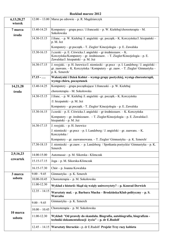 Rozkład marzec 2012 6,13,20,27 wtorek 7 marca 12.00 – 13.00 Marsz po zdrowie – p. R. Magdziarczyk 13.40-14.25 Komputery – grupa pocz./ J.francuski – p. W. Kiełebaj/choreoterapia – M. Sokołowska 14.30-15.15 J.franc. – p. W. Kiełebaj /J. angielski –gr. początk.– K. Korczyńska/J. hiszpański – p. M. Jeż środa Komputery – gr.początk.– T. Ziegler/ Kinezjologia – p. E. Zawalska 14,21,28 15.30-16.15 J.czeski – p. E. Ciświcka J. angielski – gr średniozaaw. – K. Korczyńska/Komputery – gr. średniozaaw. – T. Ziegler/Kinezjologia – p. E. Zawalska/J. hiszpański – p. M. Jeż 16.30-17.15 J. rosyjski. – p. H. Jurewicz/J. niemiecki – gr.pocz - p. I. Landzberg / J. angielski – gr. zaawans. – K. Korczyńska / Komputery – gr. zaaw. – T. Ziegler/ Gimnastyka – p. K. Sznerch/ 17.15 - …. Walentynki i Dzień Kobiet – występ grupy poetyckiej, występ choreoterapii, występ chóru, poczęstunek 13.40-14.25 Komputery – grupa początkująca/ J.francuski – p. W. Kiełebaj choreoterapia – M. Sokołowska środa 14.30-15.15 J.franc. – p. W. Kiełebaj /J. angielski –gr. początk.– K. Korczyńska /J. hiszpański – p. M. Jeż Komputery – gr.początk.– T. Ziegler/ Kinezjologia – p. E. Zawalska 15.30-16.15 J.czeski – p. E. Ciświcka J. angielski – gr średniozaaw. – K. Korczyńska Komputery – gr. średniozaaw. – T. Ziegler/Kinezjologia – p. E. Zawalska/J. hiszpański – p. M. Jeż 16.30-17.15 J. rosyjski. – p. H. Jurewicz J. niemiecki – gr.pocz - p. I. Landzberg / J. angielski – gr. zaawans. – K. Korczyńska / Komputery – gr. zaawansowana. – T. Ziegler/ Gimnastyka – p. K. Sznerch/ 2,9,16,23 czwartek 3 marca sobota 17.30-18.15 J. niemiecki – gr.zaaw. - p. Landzberg / Spotkania poetyckie/ Gimnastyka – p. K. Sznerch 14.00-15.00 Automasaż – p. M. Sikorska - Klimczak 15.15-17.15 Joga – p. M. Sikorska-Klimczak 16.15-17.30 Chór – p. Joanna Kowalska 9.00 – 9.45 Gimnastyka – p. K. Sznerch 10.00-10.45 Choreoterapia - p. M. Sokołowska 11.00-12.30 Wykład z historii: Skąd się wzięły uniwersytety? – p. Konrad Derwich 12.35 – 14.15 Warsztaty mal. – p. Barbara Mucha – Brodzińska/Klub polityczny – p. S. Warcaba 9.00 – 9.45 Gimnastyka – p. K. Sznerch 10.00 – 10.45 Choreoterapia - p. M. Sokołowska 10 marca sobota 11.00-12.30 Wykład: "Od prawdy do skandalu. Biografia, autobiografia, biografizm techniki dokumentalizacji życia" – p. dr E.Rudolf 12.45 – 14.15 Warsztaty literackie - p. dr E.Rudolf Projekt Trzy razy kobieta 9.00 – 9.45 17 marca sobota Gimnastyka – p. K. Sznerch 10.00 – 10.45 Choreoterapia - p. M. Sokołowska 11.00-12.30 Wykład: antropologia – p. dr P. Dąbrowski 12.45 – 14.15 Warsztaty mal. – p. Barbara Mucha – Brodzińska/Klub polityczny – p. S. Warcaba 9.00 – 9.45 24 marca Gimnastyka – p. K. Sznerch 10.00 – 10.45 Choreoterapia - p. M. Sokołowska sobota 31 marca sobota 11.00-12.30 Wykład: Kultura krajowców Australii – p. M. Jeż 9.00 – 9.45 Gimnastyka – p. K. Sznerch 10.00 – 10.45 Choreoterapia - p. M. Sokołowska 11.00-12.30 Wykład z historii muzyki – Historia muzyki tanecznej – c. d. – p. K. Swoboda 12.45 – 14.15 Warsztaty literackie - p. dr E.Rudolf Projekt Trzy razy kobieta BASEN i AEROBIK WODNY poniedziałek 19.00 PSP nr 21, ul. Grodzka 71, Wałbrzych