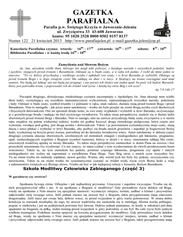 GAZETKA PARAFIALNA Parafia p.w. Świętego Krzyża w Jaworznie-Jeleniu ul. Zwycięstwa 33 43-608 Jaworzno konto: 95 1020 2528 0000 0502 0157 8137 Numer 122 21 kwiecień 2013 http://www.parafiajelen.pl e-mail:[email protected] Kancelaria Parafialna czynna: wtorek: 1600 – 1730 Biblioteka Parafialna : w każdą środę 1600 - 1800 czwartek: 1600 – 1730 sobota: 830 - 1000 Zamyślenia nad Słowem Bożym Ja, Jan, ujrzałem wielki tłum, którego nie mógł nikt policzyć, z każdego narodu i wszystkich pokoleń, ludów i języków, stojących przed tronem i Barankiem. Odziani są w białe szaty, a w ręku ich palmy. I rzekł do mnie jeden ze starców: "To ci, którzy przychodzą z wielkiego ucisku i opłukali swe szaty, i w krwi Baranka je wybielili. Dlatego są przed tronem Boga i w Jego świątyni cześć Mu oddają we dnie i w nocy. A Siedzący na tronie rozciągnie nad nimi namiot. Nie będą już łaknąć ani nie będą już pragnąć, i nie porazi ich słońce ani żaden upał, bo paść ich będzie Baranek, który jest pośrodku tronu, i poprowadzi ich do źródeł wód życia: i każdą łzę otrze Bóg z ich oczu". Ap 7,9.14b-17 Początek drugiego, dzisiejszego, niedzielnego czytania zaczerpnięty z Apokalipsy św. Jana ukazuje nam wielki tłum ludzi, wymykający się wszelkim matematycznym wyliczeniom, reprezentujących wszystkie narody, pokolenia i ludy. Odziani w białe szaty, symbol triumfu i z palmami w ręku, znak radości, dumnie stoją przed tronem Boga i przed Barankiem. Nim to nastąpiło - jak pisze autor natchniony - trzeba im było przejść na ziemi drogę ucisku czyli duchowych i fizycznych doświadczeń. Oni im sprostali dzięki temu, że swe szaty wypłukali i wybielili w krwi Baranka, oczyszczając je z grzechowego brudu i nadając im biel życiowego świadectwa. To także moja perspektywa, znaleźć się w tłumie ludzi zbawionych przed tronem Boga i Baranka. Nim to nastąpi, nim na zawsze przyodzieję białą szatę zwycięstwa a w moim ręku znajdzie się palma wiekuistej radości, trzeba mi godnie kroczyć drogą ziemskiego pielgrzyma, która często jest wyboista, wiodąca pod górkę, jest drogą ucisku i doświadczeń. Także i ja powinienem systematycznie moje szaty, moją duszę i serce płukać i wybielać w krwi Baranka, aby pozbyć się brudu moich grzechów i napełnić je bogactwem Bożej łaski, wysłużonej na krzyżu przez Jezusa, potrzebnej mi do dawania świadectwa wiary. Autor natchniony w dalszej części drugiego czytania ukazuje zbawionych, uwolnionych od ziemskich zmagań i niedogodności jak łaknienie, pragnienie, upał, zamieszkujących wspólnie z Bogiem (symbol namiotu), którzy w dzień i w nocy, nieustannie oddają Mu cześć, otoczonych troskliwą opieką ze strony Baranka. To także moja perspektywa zamieszkać w domu Pana na zawsze i bez przeszkód, nieustannie Go wysławiać. Co nie znaczy, że mam czekać z tym wysławianiem do chwili przekroczenia bram wieczności. Także tu, na tym ziemskim łez padole, pomimo częstego łaknienia, pragnienia czy upału i innych niedogodności nie wolno mi zapominać o uwielbieniu Pana Boga. Tam Bóg otrze z moich oczu wszystkie łzy. Tu na ziemi trzeba mi niekiedy zapłakać, nawet gorzko. Ważne, aby wśród tych łez były łzy pokuty, oczyszczenia czy nawrócenia. Także tu na ziemi trzeba mi systematycznie czerpać ze źródeł wody życia czyli Bożej łaski a więc z sakramentów świętych czy Bożego słowa. Trzeba mi być w jak najlepszej relacji z Jezusem, Bożym Barankiem. Szkoła Modlitwy Człowieka Zabieganego (część 3) W garniturze czy swetrze? Spotkania bywają różne. Oficjalne i jak najbardziej prywatne. Uroczyste i zupełnie zwyczajne. Trzeba się do nich przygotowywać albo i nie. A na spotkanie z Bogiem w modlitwie? Gdy prowadzisz życie dalekie od Boga, wtedy na spotkanie z Nim musisz się specjalnie nastawić: wyznaczyć miejsce, termin, zadbać o klimat i przywdziać odpowiedni strój swojego serca. Jeśli jednak starasz się zawsze być z Bogiem, takie przygotowania mają znaczenie drugorzędne. Jeśli masz już swoje lata, dobrze wiesz, że przed wyjazdem w góry warto potrenować. W miarę dobra kondycja to warunek niezbędny do tego, by urocza wędrówka nie zamieniła się w mordęgę. Można trochę pobiegać, pograć w siatkówkę i już na podejściach powinno być łatwiej. Dobrze jednak pamiętasz, że kiedy w młodości pół dnia spędzałeś na bieganiu za piłką, żaden trening przed wyjazdem w góry potrzebny ci nie był. Bo całe życie było jednym wielkim treningiem. Podobnie można spojrzeć na kwestię przygotowania do modlitwy. Gdy prowadzisz życie dalekie od Boga, wtedy na spotkanie z Nim musisz się specjalnie nastawić: wyznaczyć miejsce, termin, zadbać o klimat i przywdziać odpowiedni strój swojego serca. Jeśli jednak starasz się zawsze być z Bogiem, takie przygotowania mają znaczenie drugorzędne. Wtedy stale jesteś blisko Niego. Jest obecny w Twoim życiu jak dobry przyjaciel. I jak spotkania z przyjacielem nie musisz umawiać, organizować i martwić się, że coś wyjdzie nie tak, tak jest i z twoją modlitwą. Jest jedno „ale”. Jak prowadzić życie z Bogiem? Czy to właśnie nie modlitwa miała być sposobem na owo bycie blisko Boga? Racja. Ale to sprzeczność tylko pozorna. Modlitwa pomaga żyć w obecności Boga, ale jednocześnie życie w obecności Boga pomaga w modlitwie. Im więcej się modlisz, tym bardziej prowadzisz życie z Bogiem. A jednocześnie to życie w obecności Boga sprawia, że łatwiej Ci się modlić. Ty jesteś już chrześcijaninem. Ty już się mniej lub więcej modlisz. I mniej lub bardziej już prowadzisz życie z Bogiem. Masz na czym budować. Najgorzej gdybyś powiedział, że nie jesteś gotowy i w ogóle z modlitwy zrezygnował. Zacznij od codziennej modlitwy porannej i wieczornej. Choćby były bardzo krótkie rozpoczynaj i kończ dzień z Bogiem. W porannej polecaj Mu swoje sprawy, w w