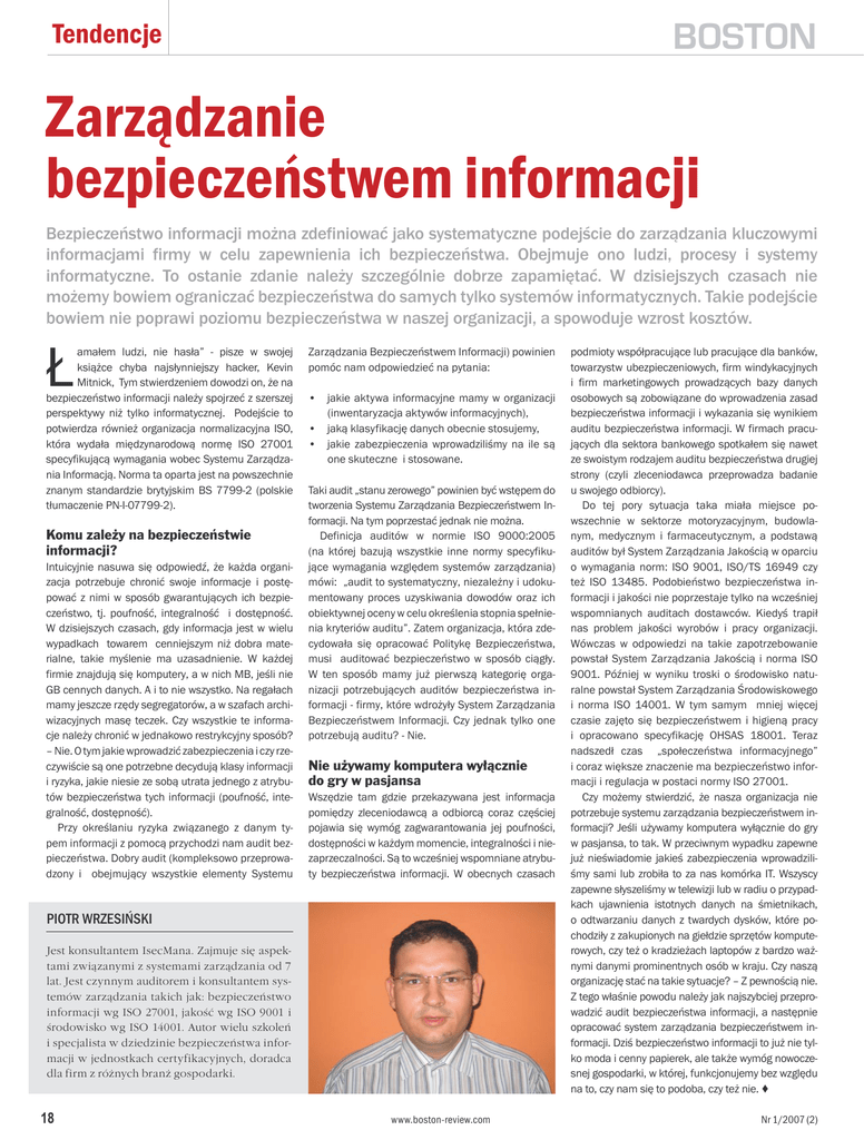BOSTON Tendencje Zarządzanie bezpieczeństwem informacji Bezpieczeństwo informacji można zdefiniować jako systematyczne podejście do zarządzania kluczowymi informacjami firmy w celu zapewnienia ich bezpieczeństwa. Obejmuje ono ludzi, procesy i systemy informatyczne. To ostanie zdanie należy szczególnie dobrze zapamiętać. W dzisiejszych czasach nie możemy bowiem ograniczać bezpieczeństwa do samych tylko systemów informatycznych. Takie podejście bowiem nie poprawi poziomu bezpieczeństwa w naszej organizacji, a spowoduje wzrost kosztów. Ł amałem ludzi, nie hasła” - pisze w swojej książce chyba najsłynniejszy hacker, Kevin Mitnick, Tym stwierdzeniem dowodzi on, że na bezpieczeństwo informacji należy spojrzeć z szerszej perspektywy niż tylko informatycznej. Podejście to potwierdza również organizacja normalizacyjna ISO, która wydała międzynarodową normę ISO 27001 specyfikującą wymagania wobec Systemu Zarządzania Informacją. Norma ta oparta jest na powszechnie znanym standardzie brytyjskim BS 7799-2 (polskie tłumaczenie PN-I-07799-2). Komu zależy na bezpieczeństwie informacji? Intuicyjnie nasuwa się odpowiedź, że każda organizacja potrzebuje chronić swoje informacje i postępować z nimi w sposób gwarantujących ich bezpieczeństwo, tj. poufność, integralność i dostępność. W dzisiejszych czasach, gdy informacja jest w wielu wypadkach towarem cenniejszym niż dobra materialne, takie myślenie ma uzasadnienie. W każdej firmie znajdują się komputery, a w nich MB, jeśli nie GB cennych danych. A i to nie wszystko. Na regałach mamy jeszcze rzędy segregatorów, a w szafach archiwizacyjnych masę teczek. Czy wszystkie te informacje należy chronić w jednakowo restrykcyjny sposób? – Nie. O tym jakie wprowadzić zabezpieczenia i czy rzeczywiście są one potrzebne decydują klasy informacji i ryzyka, jakie niesie ze sobą utrata jednego z atrybutów bezpieczeństwa tych informacji (poufność, integralność, dostępność). Przy określaniu ryzyka związanego z danym typem informacji z pomocą przychodzi nam audit bezpieczeństwa. Dobry audit (kompleksowo przeprowadzony i obejmujący wszystkie elementy Systemu Zarządzania Bezpieczeństwem Informacji) powinien pomóc nam odpowiedzieć na pytania: • jakie aktywa informacyjne mamy w organizacji (inwentaryzacja aktywów informacyjnych), • jaką klasyfikację danych obecnie stosujemy, • jakie zabezpieczenia wprowadziliśmy na ile są one skuteczne i stosowane. Taki audit „stanu zerowego” powinien być wstępem do tworzenia Systemu Zarządzania Bezpieczeństwem Informacji. Na tym poprzestać jednak nie można. Definicja auditów w normie ISO 9000:2005 (na której bazują wszystkie inne normy specyfikujące wymagania względem systemów zarządzania) mówi: „audit to systematyczny, niezależny i udokumentowany proces uzyskiwania dowodów oraz ich obiektywnej oceny w celu określenia stopnia spełnienia kryteriów auditu”. Zatem organizacja, która zdecydowała się opracować Politykę Bezpieczeństwa, musi auditować bezpieczeństwo w sposób ciągły. W ten sposób mamy już pierwszą kategorię organizacji potrzebujących auditów bezpieczeństwa informacji - firmy, które wdrożyły System Zarządzania Bezpieczeństwem Informacji. Czy jednak tylko one potrzebują auditu? - Nie. Nie używamy komputera wyłącznie do gry w pasjansa Wszędzie tam gdzie przekazywana jest informacja pomiędzy zleceniodawcą a odbiorcą coraz częściej pojawia się wymóg zagwarantowania jej poufności, dostępności w każdym momencie, integralności i niezaprzeczalności. Są to wcześniej wspomniane atrybuty bezpieczeństwa informacji. W obecnych czasach PIOTR WRZESIŃSKI Jest konsultantem IsecMana. Zajmuje się aspektami związanymi z systemami zarządzania od 7 lat. Jest czynnym auditorem i konsultantem systemów zarządzania takich jak: bezpieczeństwo informacji wg ISO 27001, jakość wg ISO 9001 i środowisko wg ISO 14001. Autor wielu szkoleń i specjalista w dziedzinie bezpieczeństwa informacji w jednostkach certyfikacyjnych, doradca dla firm z różnych branż gospodarki. 18 www.boston-review.com podmioty współpracujące lub pracujące dla banków, towarzystw ubezpieczeniowych, firm windykacyjnych i firm marketingowych prowadzących bazy danych osobowych są zobowiązane do wprowadzenia zasad bezpieczeństwa informacji i wykazania się wynikiem auditu bezpieczeństwa informacji. W firmach pracujących dla sektora bankowego spotkałem się nawet ze swoistym rodzajem auditu bezpieczeństwa drugiej strony (czyli zleceniodawca przeprowadza badanie u swojego odbiorcy). Do tej pory sytuacja taka miała miejsce powszechnie w sektorze motoryzacyjnym, budowlanym, medycznym i farmaceutycznym, a podstawą auditów był System Zarządzania Jakością w oparciu o wymagania norm: ISO 9001, ISO/TS 16949 czy też ISO 13485. Podobieństwo bezpieczeństwa informacji i jakości nie poprzestaje tylko na wcześniej wspomnianych auditach dostawców. Kiedyś trapił nas problem jakości wyrobów i pracy organizacji. Wówczas w odpowiedzi na takie zapotrzebowanie powstał System Zarządzania Jakością i norma ISO 9001. Później w wyniku troski o środowisko naturalne powstał System Zarządzania Środowiskowego i norma ISO 14001. W tym samym mniej więcej czasie zajęto się bezpieczeństwem i higieną pracy i opracowano specyfikację OHSAS 18001. Teraz nadszedł czas „społeczeństwa informacyjnego” i coraz większe znaczenie ma bezpieczeństwo informacji i regulacja w postaci normy ISO 27001. Czy możemy stwierdzić, że nasza organizacja nie potrzebuje systemu zarządzania bezpieczeństwem informacji? Jeśli używamy komputera wyłącznie do gry w pasjansa, to tak. W przeciwnym wypadku zapewne już nieświadomie jakieś zabezpieczenia wprowadziliśmy sami lub zrobiła to za nas komórka IT. Wszyscy zapewne słyszeliśmy w telewizji lub w radiu o przypadkach ujawnienia istotnych danych na śmietni