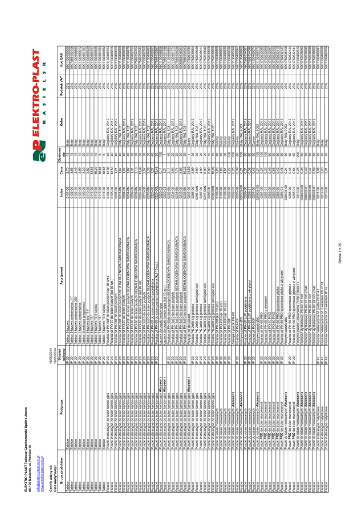 Tablice Tablice Tablice Tablice Tablice Tablice Tablice Tablice Tablice Tablice Puszki Puszki Puszki Puszki Puszki Puszki Puszki Puszki Puszki Puszki Puszki Puszki Puszki Puszki Puszki Puszki Puszki Puszki Puszki Puszki Puszki Puszki Puszki Puszki Puszki Puszki Puszki Puszki Puszki Puszki Puszki Puszki Puszki Puszki Puszki Puszki Puszki Puszki Puszki Puszki Puszki Puszki Puszki Puszki Puszki Puszki Puszki Puszki Puszki Puszki Puszki Puszki Puszki Puszki Puszki Grupa produktów Cennik ważny od: Data modyfikacji: [email protected] www.elektro-plast.com.pl Tablice Tablice Tablice Tablice Tablice Tablice Tablice Tablice Tablice Tablice Puszki instalacyjne do ścian karton-gips Puszki instalacyjne do ścian karton-gips Puszki instalacyjne do ścian karton-gips Puszki instalacyjne do ścian karton-gips Puszki instalacyjne do ścian karton-gips Puszki instalacyjne do ścian karton-gips Puszki instalacyjne do ścian karton-gips Puszki instalacyjne do ścian karton-gips Puszki instalacyjne do ścian karton-gips Puszki instalacyjne do ścian karton-gips Puszki instalacyjne do ścian karton-gips Puszki instalacyjne do ścian karton-gips Puszki instalacyjne do ścian karton-gips Puszki instalacyjne do ścian karton-gips -Akcesoria Puszki instalacyjne do ścian karton-gips -Akcesoria Puszki instalacyjne do ścian karton-gips Puszki instalacyjne do ścian karton-gips Puszki instalacyjne do ścian karton-gips Puszki instalacyjne do ścian karton-gips Puszki instalacyjne do ścian karton-gips Puszki instalacyjne do ścian karton-gips -Akcesoria Puszki instalacyjne do ścian karton-gips Puszki instalacyjne do ścian karton-gips Puszki instalacyjne do ścian karton-gips Puszki instalacyjne do ścian karton-gips Puszki instalacyjne do ścian karton-gips Puszki instalacyjne do ścian karton-gips Puszki do ścian murowanych Puszki do ścian murowanych Puszki do ścian murowanych Puszki do ścian murowanych Puszki do ścian murowanych -Akcesoria Puszki do ścian murowanych Puszki do ścian murowanych -Akcesoria Puszki do ścian murowanych Puszki do ścian murowanych Puszki do ścian murowanych Puszki do ścian murowanych -Akcesoria Puszki PRO do ścian murowanych Puszki PRO do ścian murowanych Puszki PRO do ścian murowanych Puszki PRO do ścian murowanych Puszki PRO do ścian murowanych Puszki PRO do ścian murowanych Puszki do ścian murowanych -Akcesoria Puszki PRO do ścian murowanych Puszki PRO do ścian murowanych Puszki do ścian murowanych -Akcesoria Puszki do ścian murowanych -Akcesoria Puszki do ścian murowanych -Akcesoria Puszki do ścian murowanych -Akcesoria Puszki do ścian murowanych -Akcesoria Puszki instalacyjne natynkowe Puszki instalacyjne natynkowe Puszki instalacyjne natynkowe Podgrupa ELEKTRO-PLAST Tadeusz Czachorowski Spółka Jawna 05-190 Nasielsk, ul. Płońska 18 IP 41 IP 41 IP 42 IP 20 IP 20 IP 20 IP 20 IP 20 IP 20 IP 20 IP 20 IP 20 IP 20 IP 20 IP 20 IP 20 IP 20 IP 20 IP 20 IP 20 IP 20 IP 20 IP 20 IP 20 IP 20 IP 20 IP 20 IP 20 IP 20 IP 20 16/06/2014 16/05/2014 Stopień ochrony IP 20 IP 20 IP 20 IP 20 IP 20 IP 20 IP 20 IP 20 IP 20 IP 20 IP 20 IP 20 IP 20 IP 20 IP 20 IP 20 IP 20 IP 20 IP 20 IP 20 IP 20 IP 20 IP 20 Asortyment Strona 1 z 25 Tablica 1-fazowa Tablica 3-fazowa uniwersalna „11” Tablica 3-fazowa uniwersalna 350 Tablica 3-fazowa uniwersalna Tablica licznikowa (zegarowa) Tablica 1-fazowa b/z "11" Tablica 1-fazowa "S" Tablica 1-fazowa "S"z szybą Tablica 3-fazowa "S" Tablica 3-fazowa "S"z szybą Puszka p/t PK-60F do ścian pustych (kpl 10 szt.) Puszka p/t PO-70 do ścian pustych(kpl 10 szt.) Puszka p/t PK-60F do ścian pustych Puszka p/t PK-60F do ścian pustych BEZHALOGENOWA SAMOGASNĄCA Puszka p/t PO-70 do ścian pustych Puszka p/t PO-70F do ścian pustych BEZHALOGENOWA SAMOGASNĄCA Puszka p/t PO-80 do ścian pustych Puszka p/t PO-80 do ścian pustych BEZHALOGENOWA SAMOGASNĄCA Puszka p/t PO-80 do ścian pustych(kpl 10 szt) Puszka p/t PK-2x60 do ścian pustych Puszka p/t PK-2x60 do ścian pustych BEZHALOGENOWA SAMOGASNĄCA Puszka p/t PK-60 do ścian pustych pogłębiana Puszka p/t PK-60 do ścian pustych pogłębiana (kpl 10 szt.) Łącznik do puszki karton-gips Łącznik do puszki karton-gips (kpl 10 szt.) Puszka p/t PK-60do ścian pustych BEZHALOGENOWA SAMOGASNĄCA Puszka p/t PK-3x60 do ścian pustych Puszka p/t PK-3x60 do ścian pustych BEZHALOGENOWA SAMOGASNĄCA Puszka p/t PK-4x60 do ścian pustych Puszka p/t PK-4x60 do ścian pustych BEZHALOGENOWA SAMOGASNĄCA Pozycjoner do puszek Puszka PK-2x60 k/g głeboka Puszka PK-2x60 k/g głeboka samogasnąca Puszka PK-3x60 k/g głeboka Puszka PK-3x60 k/g głeboka samogasnąca Puszka PK-4x60 k/g głeboka Puszka PK-4x60 k/g głeboka samogasnąca Puszka p/t PK-60F(kpl 10 szt.) Puszka p/t PO-70F(kpl 10 szt.) Puszka p/t PO-80F(kpl 10 szt.) Puszka p/t PK-60F Zaślepka puszki PK-60 Puszka p/t PO-70F Pokrywa puszki Ø70 Puszka p/t PK-60 LUX pogłębiana Puszka p/t PK-60 LUX pogłębiana z wkrętami Puszka p/t PO-80F Pokrywa puszki Ø80 Puszka p/t PK-60 PRO Puszka p/t PK-60 PRO z wkrętami Puszka p/t PO-70 PRO Puszka p/t PO-80 PRO Puszka p/t PK-60 PRO łączeniowa płytka Puszka p/t PK-60 PRO łączeniowa płytka z wkrętami Pokrywa puszki Ø60 Puszka p/t PK-60 PRO łączeniowa głęboka Puszka p/t PK-60 PRO łączeniowa głęboka z wkrętami Pokrywa puszki uniwersalna 70/80 (”dekiel”) Pierścień dystansowy PK-60 12 mm Pierścień dystansowy PK-60 12 mm z/wkr Pierścień dystansowy PK-60 24 mm Pierścień dystansowy PK-60 24 mm z/wkr Puszka hermetyczna n/t pusta P0 IP 41 Puszka hermetyczna n/t z wkładem P5 IP 41 Puszka hermetyczna n/t z wkładem IP 42 Index 0101-00 0102-00 0102-10 0103-00 0109-00 0110-00 0111-00 0112-00 0113-00 0114-00 0104-00 0105-00 0201-00 0201-0N 0204-00 0204-0N 0209-00 0209-0N 0209-00L 0210-00 0210-0N 0220-00 0220-00L 0220-02 0220-03 0220-0N 0234-00 0234-0N 0235-00 0235-0N 0237-00 0286-00 0286-00N 0287-00 0287-00N 0288-00 0288-00N 0106-00 0107-00 0108-00 0202-00 0202-02 0205-00 020502-00 0206-50 0206-51 