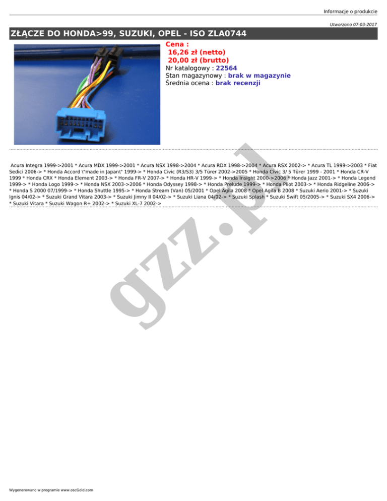 Informacje o produkcie Utworzono 07-03-2017 ZŁĄCZE DO HONDA>99, SUZUKI, OPEL - ISO ZLA0744 Cena : 16,26 zł (netto) 20,00 zł (brutto) Nr katalogowy : 22564 Stan magazynowy : brak w magazynie Średnia ocena : brak recenzji gz z .p l Acura Integra 1999->2001 * Acura MDX 1999->2001 * Acura NSX 1998->2004 * Acura RDX 1998->2004 * Acura RSX 2002-> * Acura TL 1999->2003 * Fiat Sedici 2006-> * Honda Accord \"made in Japan\" 1999-> * Honda Civic (R3/S3) 3/5 Türer 2002->2005 * Honda Civic 3/ 5 Türer 1999 - 2001 * Honda CR-V 1999 * Honda CRX * Honda Element 2003-> * Honda FR-V 2007-> * Honda HR-V 1999-> * Honda Insight 2000->2006 * Honda Jazz 2001-> * Honda Legend 1999-> * Honda Logo 1999-> * Honda NSX 2003->2006 * Honda Odyssey 1998-> * Honda Prelude 1999-> * Honda Pliot 2003-> * Honda Ridgeline 2006-> * Honda S 2000 07/1999-> * Honda Shuttle 1995-> * Honda Stream (Van) 05/2001 * Opel Agila 2008 * Opel Agila B 2008 * Suzuki Aerio 2001-> * Suzuki Ignis 04/02-> * Suzuki Grand Vitara 2003-> * Suzuki Jimny II 04/02-> * Suzuki Liana 04/02-> * Suzuki Splash * Suzuki Swift 05/2005-> * Suzuki SX4 2006-> * Suzuki Vitara * Suzuki Wagon R+ 2002-> * Suzuki XL-7 2002-> Wygenerowano w programie www.oscGold.com