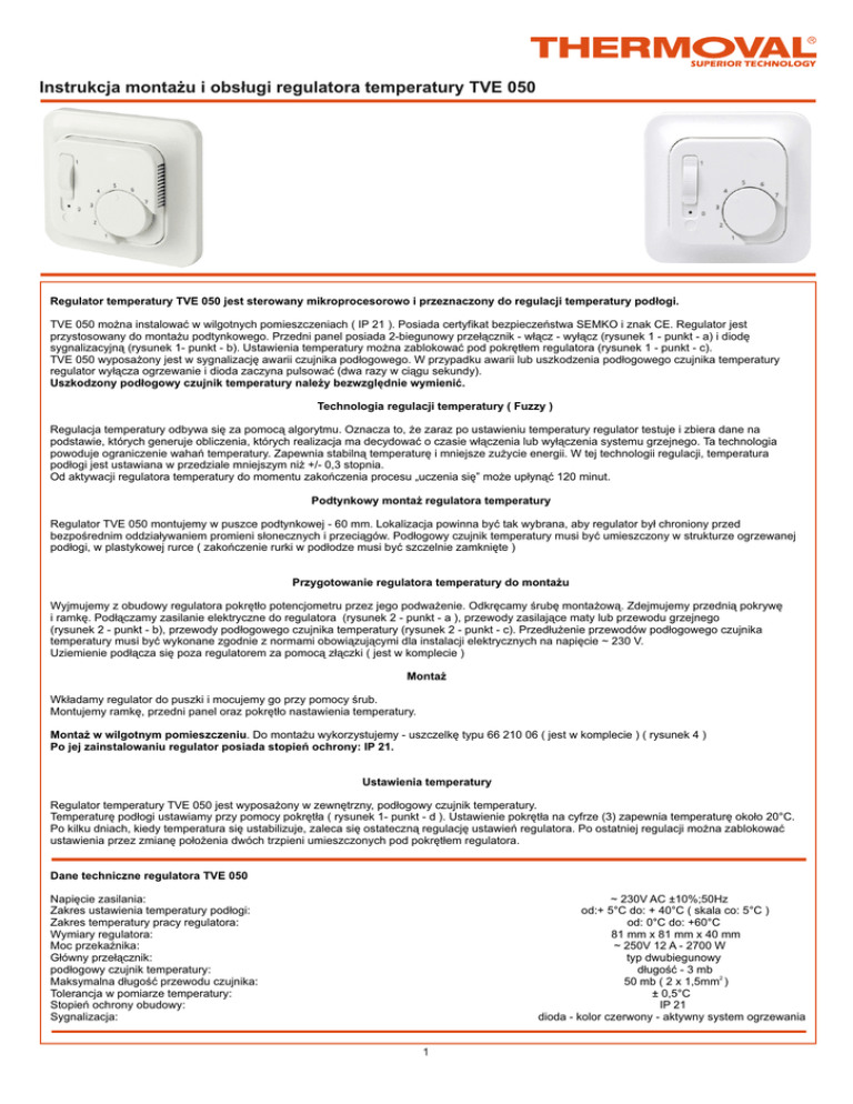 Instrukcja montażu i obsługi regulatora temperatury TVE 050 Regulator temperatury TVE 050 jest sterowany mikroprocesorowo i przeznaczony do regulacji temperatury podłogi. TVE 050 można instalować w wilgotnych pomieszczeniach ( IP 21 ). Posiada certyfikat bezpieczeństwa SEMKO i znak CE. Regulator jest przystosowany do montażu podtynkowego. Przedni panel posiada 2-biegunowy przełącznik - włącz - wyłącz (rysunek 1 - punkt - a) i diodę sygnalizacyjną (rysunek 1- punkt - b). Ustawienia temperatury można zablokować pod pokrętłem regulatora (rysunek 1 - punkt - c). TVE 050 wyposażony jest w sygnalizację awarii czujnika podłogowego. W przypadku awarii lub uszkodzenia podłogowego czujnika temperatury regulator wyłącza ogrzewanie i dioda zaczyna pulsować (dwa razy w ciągu sekundy). Uszkodzony podłogowy czujnik temperatury należy bezwzględnie wymienić. Technologia regulacji temperatury ( Fuzzy ) Regulacja temperatury odbywa się za pomocą algorytmu. Oznacza to, że zaraz po ustawieniu temperatury regulator testuje i zbiera dane na podstawie, których generuje obliczenia, których realizacja ma decydować o czasie włączenia lub wyłączenia systemu grzejnego. Ta technologia powoduje ograniczenie wahań temperatury. Zapewnia stabilną temperaturę i mniejsze zużycie energii. W tej technologii regulacji, temperatura podłogi jest ustawiana w przedziale mniejszym niż +/- 0,3 stopnia. Od aktywacji regulatora temperatury do momentu zakończenia procesu „uczenia się” może upłynąć 120 minut. Podtynkowy montaż regulatora temperatury Regulator TVE 050 montujemy w puszce podtynkowej - 60 mm. Lokalizacja powinna być tak wybrana, aby regulator był chroniony przed bezpośrednim oddziaływaniem promieni słonecznych i przeciągów. Podłogowy czujnik temperatury musi być umieszczony w strukturze ogrzewanej podłogi, w plastykowej rurce ( zakończenie rurki w podłodze musi być szczelnie zamknięte ) Przygotowanie regulatora temperatury do montażu Wyjmujemy z obudowy regulatora pokrętło potencjometru przez jego podważenie. Odkręcamy śrubę montażową. Zdejmujemy przednią pokrywę i ramkę. Podłączamy zasilanie elektryczne do regulatora (rysunek 2 - punkt - a ), przewody zasilające maty lub przewodu grzejnego (rysunek 2 - punkt - b), przewody podłogowego czujnika temperatury (rysunek 2 - punkt - c). Przedłużenie przewodów podłogowego czujnika temperatury musi być wykonane zgodnie z normami obowiązującymi dla instalacji elektrycznych na napięcie ~ 230 V. Uziemienie podłącza się poza regulatorem za pomocą złączki ( jest w komplecie ) Montaż Wkładamy regulator do puszki i mocujemy go przy pomocy śrub. Montujemy ramkę, przedni panel oraz pokrętło nastawienia temperatury. Montaż w wilgotnym pomieszczeniu. Do montażu wykorzystujemy - uszczelkę typu 66 210 06 ( jest w komplecie ) ( rysunek 4 ) Po jej zainstalowaniu regulator posiada stopień ochrony: IP 21. Ustawienia temperatury Regulator temperatury TVE 050 jest wyposażony w zewnętrzny, podłogowy czujnik temperatury. Temperaturę podłogi ustawiamy przy pomocy pokrętła ( rysunek 1- punkt - d ). Ustawienie pokrętła na cyfrze (3) zapewnia temperaturę około 20°C. Po kilku dniach, kiedy temperatura się ustabilizuje, zaleca się ostateczną regulację ustawień regulatora. Po ostatniej regulacji można zablokować ustawienia przez zmianę położenia dwóch trzpieni umieszczonych pod pokrętłem regulatora. Dane techniczne regulatora TVE 050 Napięcie zasilania: Zakres ustawienia temperatury podłogi: Zakres temperatury pracy regulatora: Wymiary regulatora: Moc przekaźnika: Główny przełącznik: podłogowy czujnik temperatury: Maksymalna długość przewodu czujnika: Tolerancja w pomiarze temperatury: Stopień ochrony obudowy: Sygnalizacja: ~ 230V AC ±10%;50Hz od:+ 5°C do: + 40°C ( skala co: 5°C ) od: 0°C do: +60°C 81 mm x 81 mm x 40 mm ~ 250V 12 A - 2700 W typ dwubiegunowy długość - 3 mb 50 mb ( 2 x 1,5mm2 ) ± 0,5°C IP 21 dioda - kolor czerwony - aktywny system ogrzewania 1 schematy - regulator temperatury TVE 050 Widok regulatora temperatury - front Widok regulatora temperatury - po zdjęciu pokrywy zasilanie regulatora ~ 230V +/- 10% 50 Hz otwory technologiczne panel czołowy wyłącznik włącz - wyłącz dioda - czerwona wskazuje aktywację systemu ogrzewania pulsując - awarię czujnika pokrętło ustawiania temperatury podłączenie ekranu ( kostka w komplecie ) otwory do mocowania regulatora w puszce podłączenie podłogowego czujnika temperatury podłączenie zasilania maty grzejnej lub przewodu grzejnego Po zdjęciu pokrętła od potencjometru wykręcamy śrubkę. Zdejmujemy panel i ramkę. Teraz regulator przygotowany jest do podłączenia przewodów zasilających i przewodów podłogowego czujnika temperatury. Wartości rezystancji podłogowego czujnika temperatury Montaż uszczelki dla IP 21 uszczelka 6621006 - IP 21 Rezystancja czujnika ( NTC ) Temperatura (°C) 10°C 15°C 20°C 25°C 30°C Rezystancja: ( kOhm ) 19,9 kOhm 15,7 kOhm 12,5 kOhm 10,0 kOhm 8,0 kOhm uszczelkę instalujemy w górnej części obudowy regulatora THERMOVAL POLSKA 02 - 690 Warszawa ul. Bokserska 25 tel: 22 853 27 27 2 22 853 70 66 22 647 04 43 www.thermoval.pl fax: 22 647 04 43 w.116 e-mail: [email protected]