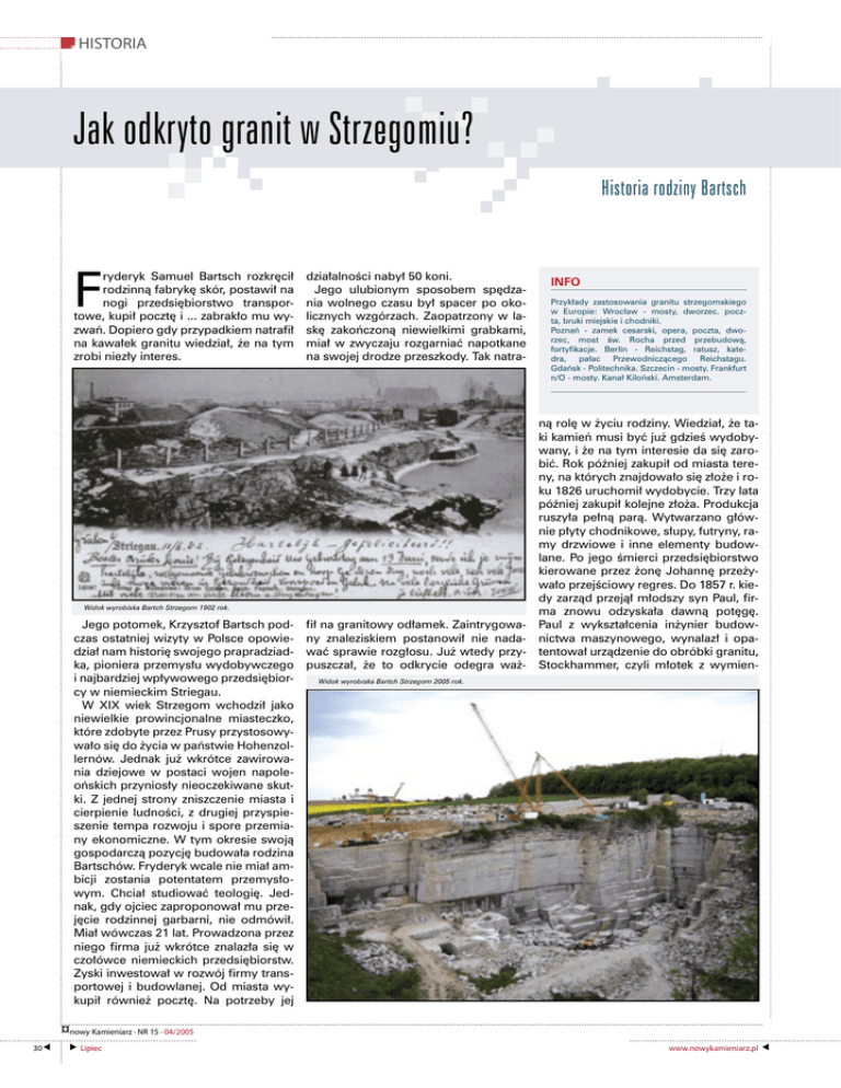 HISTORIA Jak odkryto granit w Strzegomiu? Historia rodziny Bartsch F ryderyk Samuel Bartsch rozkręcił rodzinną fabrykę skór, postawił na nogi przedsiębiorstwo transportowe, kupił pocztę i ... zabrakło mu wyzwań. Dopiero gdy przypadkiem natrafił na kawałek granitu wiedział, że na tym zrobi niezły interes. działalności nabył 50 koni. Jego ulubionym sposobem spędzania wolnego czasu był spacer po okolicznych wzgórzach. Zaopatrzony w laskę zakończoną niewielkimi grabkami, miał w zwyczaju rozgarniać napotkane na swojej drodze przeszkody. Tak natra- INFO Przykłady zastosowania granitu strzegomskiego w Europie: Wrocław - mosty, dworzec. poczta, bruki miejskie i chodniki. Poznań - zamek cesarski, opera, poczta, dworzec, most św. Rocha przed przebudową, fortyfikacje. Berlin - Reichstag, ratusz, katedra, pałac Przewodniczącego Reichstagu. Gdańsk - Politechnika. Szczecin - mosty. Frankfurt n/O - mosty. Kanał Kiloński. Amsterdam. ną rolę w życiu rodziny. Wiedział, że taki kamień musi być już gdzieś wydobywany, i że na tym interesie da się zarobić. Rok później zakupił od miasta tereny, na których znajdowało się złoże i roku 1826 uruchomił wydobycie. Trzy lata później zakupił kolejne złoża. Produkcja ruszyła pełną parą. Wytwarzano głównie płyty chodnikowe, słupy, futryny, ramy drzwiowe i inne elementy budowlane. Po jego śmierci przedsiębiorstwo kierowane przez żonę Johannę przeżywało przejściowy regres. Do 1857 r. kiedy zarząd przejął młodszy syn Paul, firWidok wyrobiska Bartch Strzegom 1902 rok. ma znowu odzyskała dawną potęgę. Jego potomek, Krzysztof Bartsch pod- fił na granitowy odłamek. Zaintrygowa- Paul z wykształcenia inżynier budowczas ostatniej wizyty w Polsce opowie- ny znaleziskiem postanowił nie nada- nictwa maszynowego, wynalazł i opadział nam historię swojego prapradziad- wać sprawie rozgłosu. Już wtedy przy- tentował urządzenie do obróbki granitu, ka, pioniera przemysłu wydobywczego puszczał, że to odkrycie odegra waż- Stockhammer, czyli młotek z wymieni najbardziej wpływowego przedsiębiorWidok wyrobiska Bartch Strzegom 2005 rok. cy w niemieckim Striegau. W XIX wiek Strzegom wchodził jako niewielkie prowincjonalne miasteczko, które zdobyte przez Prusy przystosowywało się do życia w państwie Hohenzollernów. Jednak już wkrótce zawirowania dziejowe w postaci wojen napoleońskich przyniosły nieoczekiwane skutki. Z jednej strony zniszczenie miasta i cierpienie ludności, z drugiej przyspieszenie tempa rozwoju i spore przemiany ekonomiczne. W tym okresie swoją gospodarczą pozycję budowała rodzina Bartschów. Fryderyk wcale nie miał ambicji zostania potentatem przemysłowym. Chciał studiować teologię. Jednak, gdy ojciec zaproponował mu przejęcie rodzinnej garbarni, nie odmówił. Miał wówczas 21 lat. Prowadzona przez niego firma już wkrótce znalazła się w czołówce niemieckich przedsiębiorstw. Zyski inwestował w rozwój firmy transportowej i budowlanej. Od miasta wykupił również pocztę. Na potrzeby jej ¤nowy Kamieniarz · NR 15 · 04/2005 30  Lipiec www.nowykamieniarz.pl  HISTORIA nymi nasadkami (groszkownik). Warsztat znajdował się przy obecnej ulicy Kościuszki. Potomkowie Pawła systematycznie rozwijali produkcję, kupując i dzierżawiąc kolejne kamieniołomy, budując bocznicę kolejową. Rodzina Bartschów zasłużyła sobie na życzliwą pamięć strzegomian, nie tylko jako najzamożniejszy ród w mieście. Znani byli również ze swej charytatywnej i społecznej działalności. Członkowie rodziny należeli do założycieli licznych fundacji na rzecz biednych. Dotowali również zdolnych uczniów i studentów. Rozwój transportu kolejowego znacznie przyspieszył sprzedaż urobku i gotowych wyrobów granitowych. Sprzyjał również rozwijaniu eksportu, głównie do Holandii i krajów bałtyckich. Produkowaną na ogromną skalę kostką brukową pokrywano nie tylko ulice Strzegomia, Wrocławia, ale również wielu innych miast śląskich. Granit wykorzystywano także do zdobienia elewacji repre- wydobywano nawet 300 tys. ton kamienia. Liczba robotników stałych wynosiła 2 tys. W czasie koniunktury zwiększała się dwukrotnie. Łączna suma pieniędzy przez nich zarabianych dochodziła nierzadko, jak w 1902 do 1,6 mln marek rocznie. Lata po I wojnie światowej nie były dla przemysłu skalnego najlepsze. Słaba koniunktura, nadwyżki produkcji, wzrost taryf kolejowych i konieczność redukcji zatrudnienia robotników sprawiły, że miasto stanęło przed widmem bankructwa. W 1933 roku kamieniołomy zatrudniały zaledwie 10% dawnej liczby robotników i to najczęściej w niepełnym wymiarze godzin. Nic nie wskazywało na to, że Strzegom kiedykolwiek odzyska utraconą pozycję. Krzysztof Bartsch obecnie mieszka w okolicach Monachium. Nigdy nie chciał powrócić do zajęcia swoich przodków. Wydarzeń z czasów, gdy na teren Strzegomia wkroczyły wojska radzieckie nie wspomina najlepiej. Kiedy po wojnie zentacyjnych budowli. Międzynarodowy rozgłos zyskało kamieniarstwo nagrobne. W strzegomskich kamieniołomach znajdowano również rzadkie okazy minerałów, które trafiały do najważniejszych muzeów mineralogicznych w Londynie, Paryżu, Budapeszcie i Wiedniu. Strzegom z dominującym przemysłem skalnym zyskał ogromne znaczenie gospodarcze. Tylko z kamieniołomów strzegomskich wywożono rocznie 20 tys. ton granitu. W całym powiecie było wówczas 30 kopalni, z których osiedlił się z matką w Niemczech, wiedział że dawne życie i wszystko co pozostało w jego rodzinnym mieście, nigdy już nie będzie w jego zasięgu. To trzecia wizyta Bartscha w Polsce. Przyciąga go w te strony pamięć o krewnych, którzy pochowani są w rodzinnym mauzoleum. I za każdym razem odwiedza kamieniołomy, które do dzisiejszych czasów noszą nieoficjalną nazwę „Bartsch”.  Agnieszka Środoń ¤nowy Kamieniarz · NR 15 · 04/2005 32  Lipiec www.nowy