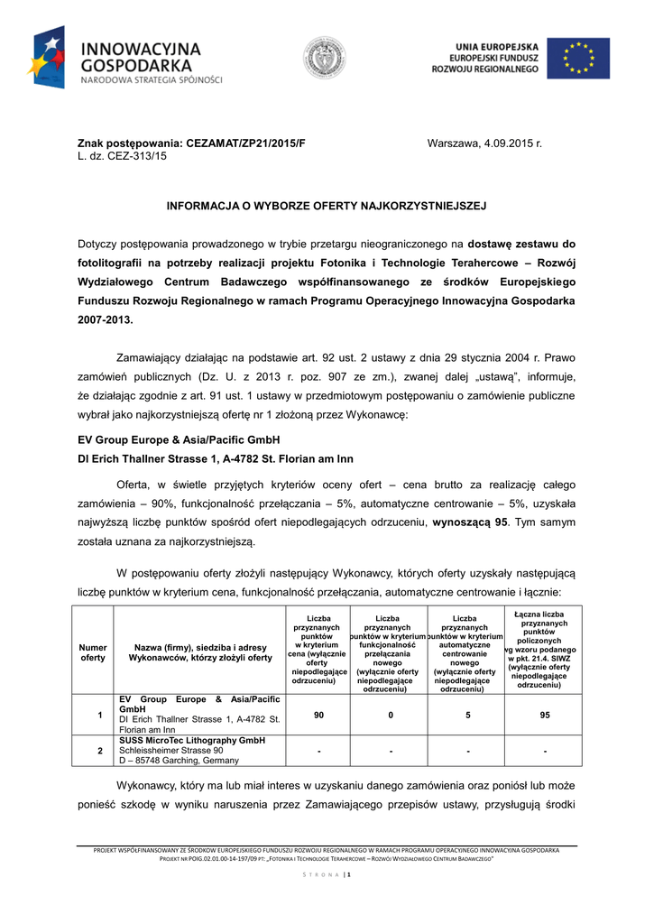 Znak postępowania: CEZAMAT/ZP21/2015/F L. dz. CEZ-313/15 Warszawa, 4.09.2015 r. INFORMACJA O WYBORZE OFERTY NAJKORZYSTNIEJSZEJ Dotyczy postępowania prowadzonego w trybie przetargu nieograniczonego na dostawę zestawu do fotolitografii na potrzeby realizacji projektu Fotonika i Technologie Terahercowe – Rozwój Wydziałowego Centrum Badawczego współfinansowanego ze środków Europejskiego Funduszu Rozwoju Regionalnego w ramach Programu Operacyjnego Innowacyjna Gospodarka 2007-2013. Zamawiający działając na podstawie art. 92 ust. 2 ustawy z dnia 29 stycznia 2004 r. Prawo zamówień publicznych (Dz. U. z 2013 r. poz. 907 ze zm.), zwanej dalej „ustawą”, informuje, że działając zgodnie z art. 91 ust. 1 ustawy w przedmiotowym postępowaniu o zamówienie publiczne wybrał jako najkorzystniejszą ofertę nr 1 złożoną przez Wykonawcę: EV Group Europe & Asia/Pacific GmbH DI Erich Thallner Strasse 1, A-4782 St. Florian am Inn Oferta, w świetle przyjętych kryteriów oceny ofert – cena brutto za realizację całego zamówienia – 90%, funkcjonalność przełączania – 5%, automatyczne centrowanie – 5%, uzyskała najwyższą liczbę punktów spośród ofert niepodlegających odrzuceniu, wynoszącą 95. Tym samym została uznana za najkorzystniejszą. W postępowaniu oferty złożyli następujący Wykonawcy, których oferty uzyskały następującą liczbę punktów w kryterium cena, funkcjonalność przełączania, automatyczne centrowanie i łącznie: Numer oferty 1 2 Nazwa (firmy), siedziba i adresy Wykonawców, którzy złożyli oferty EV Group Europe & Asia/Pacific GmbH DI Erich Thallner Strasse 1, A-4782 St. Florian am Inn SUSS MicroTec Lithography GmbH Schleissheimer Strasse 90 D – 85748 Garching, Germany Łączna liczba Liczba Liczba Liczba przyznanych przyznanych przyznanych przyznanych punktów punktów punktów w kryterium punktów w kryterium policzonych w kryterium funkcjonalność automatyczne wg wzoru podanego cena (wyłącznie przełączania centrowanie w pkt. 21.4. SIWZ oferty nowego nowego (wyłącznie oferty niepodlegające (wyłącznie oferty (wyłącznie oferty niepodlegające odrzuceniu) niepodlegające niepodlegające odrzuceniu) odrzuceniu) odrzuceniu) 90 0 5 95 - - - - Wykonawcy, który ma lub miał interes w uzyskaniu danego zamówienia oraz poniósł lub może ponieść szkodę w wyniku naruszenia przez Zamawiającego przepisów ustawy, przysługują środki PROJEKT WSPÓŁFINANSOWANY ZE ŚRODKOW EUROPEJSKIEGO FUNDUSZU ROZWOJU REGIONALNEGO W RAMACH PROGRAMU OPERACYJNEGO INNOWACYJNA GOSPODARKA PROJEKT NR POIG.02.01.00-14-197/09 PT: „FOTONIKA I TECHNOLOGIE TERAHERCOWE – ROZWÓJ WYDZIAŁOWEGO CENTRUM BADAWCZEGO" S T R O N A |1 ochrony prawnej przewidziane w Dziale VI ustawy. Romuald Beck /-/ Wiceprezes Zarządu CEZAMAT PW Sp. z o.o. ds. naukowych Mariusz Wielec /-/ Prezes Zarządu CEZAMAT PW Sp. z o.o. PROJEKT WSPÓŁFINANSOWANY ZE ŚRODKOW EUROPEJSKIEGO FUNDUSZU ROZWOJU REGIONALNEGO W RAMACH PROGRAMU OPERACYJNEGO INNOWACYJNA GOSPODARKA PROJEKT NR POIG.02.01.00-14-197/09 PT: „FOTONIKA I TECHNOLOGIE TERAHERCOWE – ROZWÓJ WYDZIAŁOWEGO CENTRUM BADAWCZEGO" S T R O N A |2