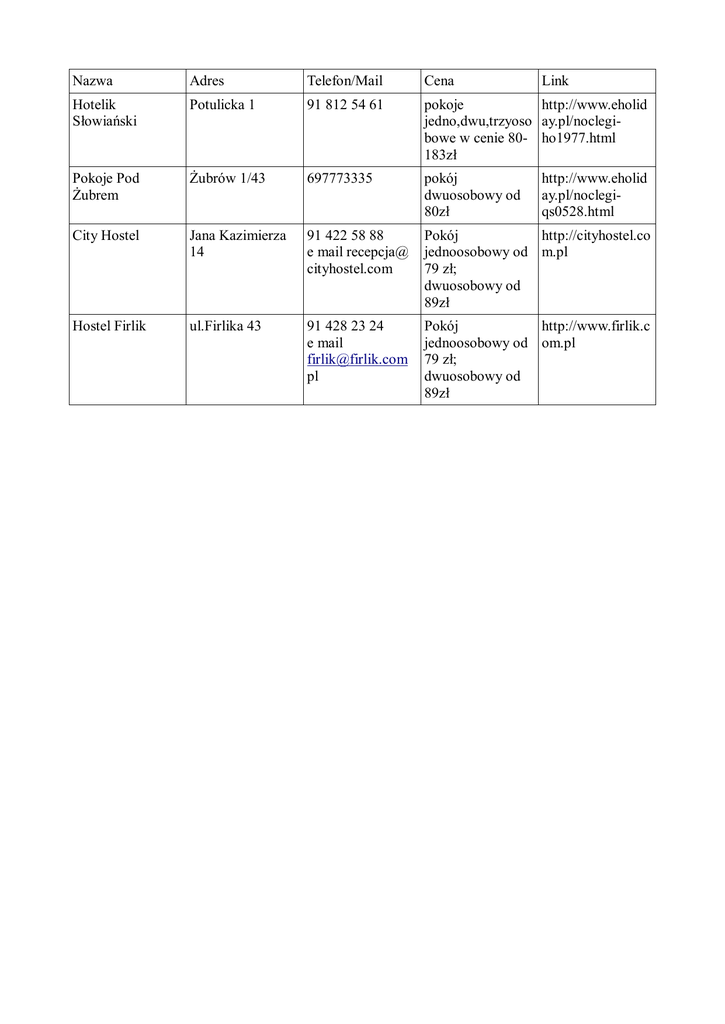 Nazwa Adres Telefon/Mail Cena Link Hotelik Słowiański Potulicka 1 91 812 54 61 pokoje http://www.eholid jedno,dwu,trzyoso ay.pl/noclegibowe w cenie 80- ho1977.html 183zł Pokoje Pod Żubrem Żubrów 1/43 697773335 pokój dwuosobowy od 80zł City Hostel Jana Kazimierza 14 91 422 58 88 e mail recepcja@ cityhostel.com Pokój http://cityhostel.co jednoosobowy od m.pl 79 zł; dwuosobowy od 89zł Hostel Firlik ul.Firlika 43 91 428 23 24 e mail [email protected] pl Pokój http://www.firlik.c jednoosobowy od om.pl 79 zł; dwuosobowy od 89zł http://www.eholid ay.pl/noclegiqs0528.html
