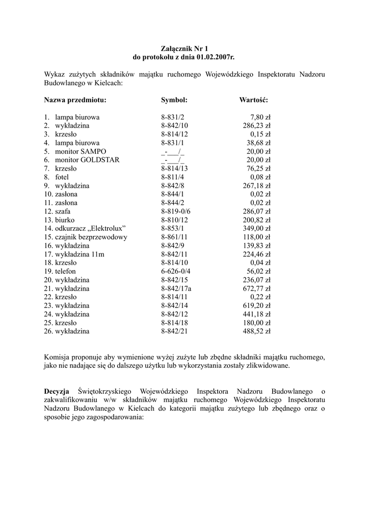 Załącznik Nr 1 do protokołu z dnia 01.02.2007r. Wykaz zużytych składników majątku ruchomego Wojewódzkiego Inspektoratu Nadzoru Budowlanego w Kielcach: Nazwa przedmiotu: Symbol: 1. lampa biurowa 2. wykładzina 3. krzesło 4. lampa biurowa 5. monitor SAMPO 6. monitor GOLDSTAR 7. krzesło 8. fotel 9. wykładzina 10. zasłona 11. zasłona 12. szafa 13. biurko 14. odkurzacz „Elektrolux” 15. czajnik bezprzewodowy 16. wykładzina 17. wykładzina 11m 18. krzesło 19. telefon 20. wykładzina 21. wykładzina 22. krzesło 23. wykładzina 24. wykładzina 25. krzesło 26. wykładzina 8-831/2 8-842/10 8-814/12 8-831/1 _-___/_ _-___/_ 8-814/13 8-811/4 8-842/8 8-844/1 8-844/2 8-819-0/6 8-810/12 8-853/1 8-861/11 8-842/9 8-842/11 8-814/10 6-626-0/4 8-842/15 8-842/17a 8-814/11 8-842/14 8-842/12 8-814/18 8-842/21 Wartość: 7,80 zł 286,23 zł 0,15 zł 38,68 zł 20,00 zł 20,00 zł 76,25 zł 0,08 zł 267,18 zł 0,02 zł 0,02 zł 286,07 zł 200,82 zł 349,00 zł 118,00 zł 139,83 zł 224,46 zł 0,04 zł 56,02 zł 236,07 zł 672,77 zł 0,22 zł 619,20 zł 441,18 zł 180,00 zł 488,52 zł Komisja proponuje aby wymienione wyżej zużyte lub zbędne składniki majątku ruchomego, jako nie nadające się do dalszego użytku lub wykorzystania zostały zlikwidowane. Decyzja Świętokrzyskiego Wojewódzkiego Inspektora Nadzoru Budowlanego o zakwalifikowaniu w/w składników majątku ruchomego Wojewódzkiego Inspektoratu Nadzoru Budowlanego w Kielcach do kategorii majątku zużytego lub zbędnego oraz o sposobie jego zagospodarowania: