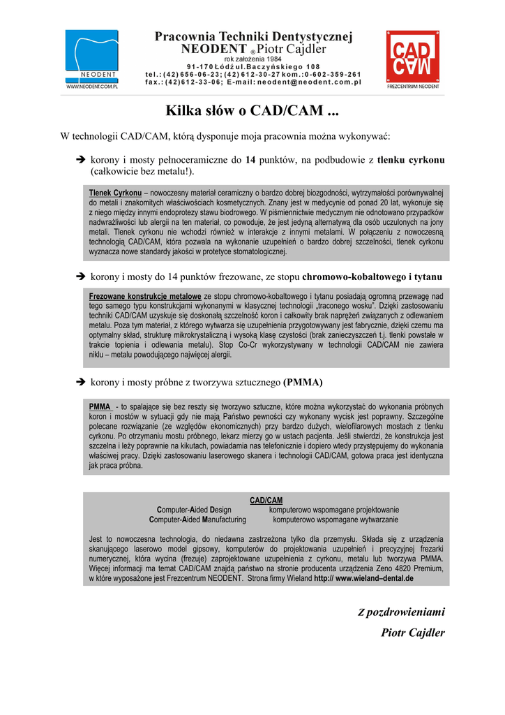Kilka słów o CAD/CAM ... W technologii CAD/CAM, którą dysponuje moja pracownia moŜna wykonywać: korony i mosty pełnoceramiczne do 14 punktów, na podbudowie z tlenku cyrkonu (całkowicie bez metalu!). Tlenek Cyrkonu – nowoczesny materiał ceramiczny o bardzo dobrej biozgodności, wytrzymałości porównywalnej do metali i znakomitych właściwościach kosmetycznych. Znany jest w medycynie od ponad 20 lat, wykonuje się z niego między innymi endoprotezy stawu biodrowego. W piśmiennictwie medycznym nie odnotowano przypadków nadwraŜliwości lub alergii na ten materiał, co powoduje, Ŝe jest jedyną alternatywą dla osób uczulonych na jony metali. Tlenek cyrkonu nie wchodzi równieŜ w interakcje z innymi metalami. W połączeniu z nowoczesną technologią CAD/CAM, która pozwala na wykonanie uzupełnień o bardzo dobrej szczelności, tlenek cyrkonu wyznacza nowe standardy jakości w protetyce stomatologicznej. korony i mosty do 14 punktów frezowane, ze stopu chromowo-kobaltowego i tytanu Frezowane konstrukcje metalowe ze stopu chromowo-kobaltowego i tytanu posiadają ogromną przewagę nad tego samego typu konstrukcjami wykonanymi w klasycznej technologii „traconego wosku”. Dzięki zastosowaniu techniki CAD/CAM uzyskuje się doskonałą szczelność koron i całkowity brak napręŜeń związanych z odlewaniem metalu. Poza tym materiał, z którego wytwarza się uzupełnienia przygotowywany jest fabrycznie, dzięki czemu ma optymalny skład, strukturę mikrokrystaliczną i wysoką klasę czystości (brak zanieczyszczeń t.j. tlenki powstałe w trakcie topienia i odlewania metalu). Stop Co-Cr wykorzystywany w technologii CAD/CAM nie zawiera niklu – metalu powodującego najwięcej alergii. korony i mosty próbne z tworzywa sztucznego (PMMA) PMMA - to spalające się bez reszty się tworzywo sztuczne, które moŜna wykorzystać do wykonania próbnych koron i mostów w sytuacji gdy nie mają Państwo pewności czy wykonany wycisk jest poprawny. Szczególne polecane rozwiązanie (ze względów ekonomicznych) przy bardzo duŜych, wielofilarowych mostach z tlenku cyrkonu. Po otrzymaniu mostu próbnego, lekarz mierzy go w ustach pacjenta. Jeśli stwierdzi, Ŝe konstrukcja jest szczelna i leŜy poprawnie na kikutach, powiadamia nas telefonicznie i dopiero wtedy przystępujemy do wykonania właściwej pracy. Dzięki zastosowaniu laserowego skanera i technologii CAD/CAM, gotowa praca jest identyczna jak praca próbna. Computer-Aided Design Computer-Aided Manufacturing CAD/CAM komputerowo wspomagane projektowanie komputerowo wspomagane wytwarzanie Jest to nowoczesna technologia, do niedawna zastrzeŜona tylko dla przemysłu. Składa się z urządzenia skanującego laserowo model gipsowy, komputerów do projektowania uzupełnień i precyzyjnej frezarki numerycznej, która wycina (frezuje) zaprojektowane uzupełnienia z cyrkonu, metalu lub tworzywa PMMA. Więcej informacji ma temat CAD/CAM znajdą państwo na stronie producenta urządzenia Zeno 4820 Premium, w które wyposaŜone jest Frezcentrum NEODENT. Strona firmy Wieland http:// www.wieland–dental.de Z pozdrowieniami Piotr Cajdler