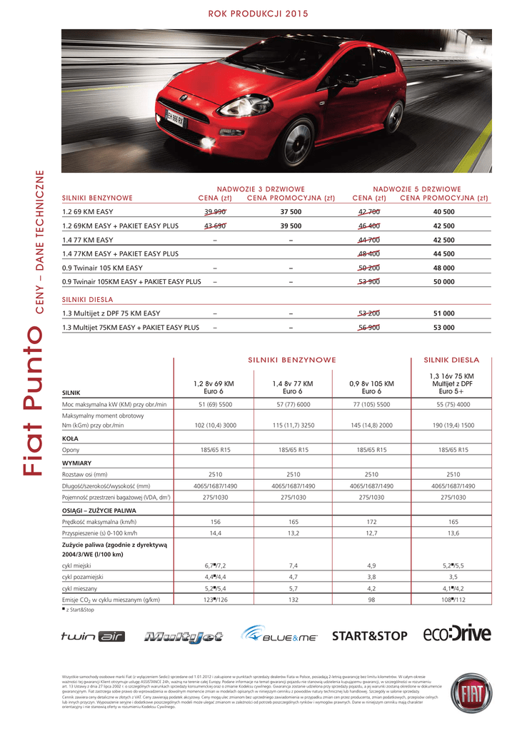 Fiat Punto CENY – DANE TECHNICZNE ROK PRODUKCJI 2015 SILNIKI BENZYNOWE NADWOZIE 3 DRZWIOWE CENA (z∏) CENA PROMOCYJNA (z∏) NADWOZIE 5 DRZWIOWE CENA (z∏) CENA PROMOCYJNA (z∏) 1.2 69 KM EASY 39 990 37 500 42 700 40 500 1.2 69KM EASY + PAKIET EASY PLUS 43 690 39 500 46 400 42 500 – – 44 700 42 500 48 400 44 500 1.4 77 KM EASY 1.4 77KM EASY + PAKIET EASY PLUS 0.9 Twinair 105 KM EASY – – 50 200 48 000 0.9 Twinair 105KM EASY + PAKIET EASY PLUS – – 53 900 50 000 1.3 Multijet z DPF 75 KM EASY – – 53 200 51 000 1.3 Multijet 75KM EASY + PAKIET EASY PLUS – – 56 900 53 000 SILNIKI DIESL A SILNIKI BENZYNOWE SILNIK Moc maksymalna kW (KM) przy obr./min 1,2 8v 69 KM Euro 6 SILNIK DIESLA 1,3 16v 75 KM Multijet z DPF Euro 5+ 1,4 8v 77 KM Euro 6 0,9 8v 105 KM Euro 6 51 (69) 5500 57 (77) 6000 77 (105) 5500 55 (75) 4000 102 (10,4) 3000 115 (11,7) 3250 145 (14,8) 2000 190 (19,4) 1500 185/65 R15 185/65 R15 185/65 R15 185/65 R15 Maksymalny moment obrotowy Nm (kGm) przy obr./min KOŁA Opony WYMIARY Rozstaw osi (mm) Długość/szerokość/wysokość (mm) Pojemność przestrzeni bagażowej (VDA, dm3) 2510 2510 2510 2510 4065/1687/1490 4065/1687/1490 4065/1687/1490 4065/1687/1490 275/1030 275/1030 275/1030 275/1030 OSIĄGI – ZUŻYCIE PALIWA Prędkość maksymalna (km/h) 156 165 172 165 Przyspieszenie (s) 0-100 km/h 14,4 13,2 12,7 13,6 cykl miejski 6,7■/7,2 7,4 4,9 5,2■/5,5 cykl pozamiejski 4,4■/4,4 4,7 3,8 3,5 ■ 5,2 /5,4 5,7 4,2 4,1■/4,2 ■ 132 98 108■/112 Zużycie paliwa (zgodnie z dyrektywą 2004/3/WE (l/100 km) cykl mieszany Emisje CO2 w cyklu mieszanym (g/km) ■ 123 /126 z Start&Stop START&STOP Wszystkie samochody osobowe marki Fiat (z wyłączeniem Sedici) sprzedane od 1.01.2012 i zakupione w punktach sprzedaży dealerów Fiata w Polsce, posiadają 2-letnią gwarancję bez limitu kilometrów. W całym okresie ważności tej gwarancji Klient otrzymuje usługę ASSISTANCE 24h, ważną na terenie całej Europy. Podane informacje na temat gwarancji pojazdu nie stanowią udzielenia kupującemu gwarancji, w szczególności w rozumieniu art. 13 Ustawy z dnia 27 lipca 2002 r. o szczególnych warunkach sprzedaży konsumenckiej oraz o zmianie Kodeksu cywilnego. Gwarancja zostanie udzielona przy sprzedaży pojazdu, a jej warunki zostaną określone w dokumencie gwarancyjnym. Fiat zastrzega sobie prawo do wprowadzenia w dowolnym momencie zmian w modelach opisanych w niniejszym cenniku z powodów natury technicznej lub handlowej. Szczegóły w salonie sprzedaży. Cennik zawiera ceny detaliczne w złotych z VAT. Ceny zawierają podatek akcyzowy. Ceny mogą ulec zmianom bez uprzedniego zawiadomienia w przypadku zmian cen przez producenta, zmian podatkowych, przepisów celnych lub innych przyczyn. Wyposażenie seryjne i dodatkowe poszczególnych modeli może ulegać zmianom w zależności od potrzeb poszczególnych rynków i wymogów prawnych. Dane w niniejszym cenniku mają charakter orientacyjny i nie stanowią oferty w rozumieniu Kodeksu Cywilnego. ROK PRODUKCJI 2015 NR OPCJI LINIA I STYL EASY Klamki w kolorze nadwozia 61A Zderzaki w kolorze nadwozia 876 • • 070 500 zł Przyciemnione szyby boczne tylne i tylna Listwy boczne ochronne w kolorze nadwozia Felgi ze stopów lekkich 15", opony 185/65/15 14-ramienne bicolore 4M5 450 zł 421 1 200 zł Felgi ze stopów lekkich 16",opony 195/55/16 7-ramienne 439 1 600 zł Felgi ze stopów lekkich 17", opony 205/45/17 12-ramienne 5A6 2 500 zł Felgi ze stopów lekkich 15", opony 185/65/15 108 1 200 zł Dojazdowe koło zapasowe stalowe z oponą 175/65 R15, prędkość maksymalna 80 km/h 4UE 300 zł 5IY 350 zł 015 Pełnowymiarowe koło zapasowe stalowe z oponą 185/65 R15 Zestaw naprawczy opon Fix&Go 499 • • • • • • • • • • • • • • • Elektrycznie sterowane i podgrzewane lusterka zewnętrzne, lakierowane z czujnikiem temp. zewnętrznej 041 400 zł /•* Podłokietnik przedni ze schowkiem w środku 132 600 zł Podgrzewane siedzenia przednie 452 1 000 zł Czujniki parkowania tylne 508 1 000 zł Dodatkowa nagrzewnica dla silników Diesla (grzałka w układzie cieczy chłodzącej) 52Y 700 zł System Start & Stop dla silników 1.2 8v 69KM i 1.3 Multijet 16v 75KM 5DE 1 200 zł/• (1) Gniazdo z zasilaniem 12v w bagażniku 823 400 zł Immobiliser FIAT CODE Centralny zamek z pilotem w kluczyku 228+008 Elektrycznie sterowane szyby przednie 028 Klimatyzacja manualna z filtrem przeciwpyłkowym 025 Kolumna kierownicy z regulacją w dwóch płaszczyznach 011 Komputer pokładowy z wyświetlaczem piktogramowym 4RQ Korek wlewu paliwa zamykany na kluczyk 352 Lusterka boczne elektrycznie sterowane w kolorze czarnym 976 Reflektory przednie z funkcją "Folow Me Home" 096 Homologacja 5-osobowa 273 Siedzenie kierowcy z regulacją wysokości 450 Światła do jazdy dziennej (DRL) 692 Wspomaganie kierownicy Dualdrive 112 Zagłówki na tylnej kanapie 182 BEZPIECZEŃSTWO 502 • • • • • • Poduszki powietrzne boczne 505 1 250 zł System przeciwpożarowy FPS 4G5 • Światła przeciwmgielne przednie z funkcją statycznego doświetlania zakretów 097 800 zł Trzeci tylny zagłówek 511 400 zł ABS + EBD + BAS 009+052 TPMS - czujniki ciśnienia powietrza w oponach 7B2 ESP + ASR/MSR, HBA i Hill Holder 392 ESS - system sygnalizacji awaryjnego hamowania 094 Poduszka powietrzna przednia kierowcy 500 Poduszka powietrzna przednia pasażera AUDIO/TELEMATYKA Przystosowanie do montażu radia (okablowanie + antena + 6 głośników) 082 • Radioodtwarzacz CD+MP3 41A 1 200 zł Przyciski do sterowania radiem na kole kierownicy 245 100 zł Radioodtwarzacz CD+MP3 z USB i Bluetooth 717 1 500 zł PAKIET EASY PLUS: (dzielone oparcie tylnej kanapy + skórzana kierownica + radioodtwarzacz CD+MP3 + kurtyny powietrzne) 195+245+320+41A+614 3 800 zł PAKIET SPORT: (spojlery boczny i tylny + felgi ze stopów lekkich 16”+ światła przeciwmgielne + przyciemniane szyby tylne + sportowa skórzana kierownica) 73Q 4 000 zł PAKIET DLA PALĄCYCH: (zapalnicz