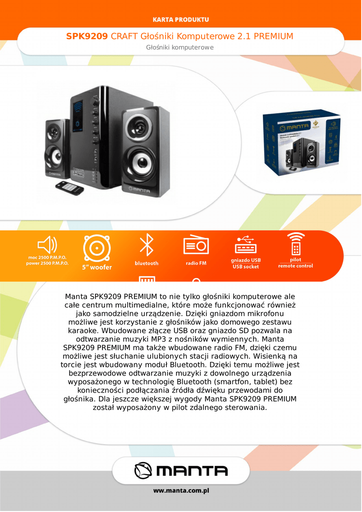 SPK9209CRAFTGłośnikiKomputerowe2.1PREMIUM Głośnikikomputerowe MantaSPK9209PREMIUMtonietylkogłośnikikomputeroweale całecentrummultimedialne,któremożefunkcjonowaćrównież jakosamodzielneurządzenie.Dziękigniazdommikrofonu możliwejestkorzystaniezgłośnikówjakodomowegozestawu karaoke.WbudowanezłączeUSBorazgniazdoSDpozwalana odtwarzaniemuzykiMP3znośnikówwymiennych.Manta SPK9209PREMIUMmatakżewbudowaneradioFM,dziękiczemu możliwejestsłuchanieulubionychstacjiradiowych.Wisienkąna torciejestwbudowanymodułBluetooth.Dziękitemumożliwejest bezprzewodoweodtwarzaniemuzykizdowolnegourządzenia wyposażonegowtechnologięBluetooth(smartfon,tablet)bez koniecznościpodłączaniaźródładźwiękuprzewodamido głośnika.DlajeszczewiększejwygodyMantaSPK9209PREMIUM zostałwyposażonywpilotzdalnegosterowania. SPK9209CRAFTGłośnikiKomputerowe2.1PREMIUM Głośnikikomputerowe Specyfikacja Tozestawnowoczesnych,bogatowyposażonych głośników2.1opotężnychbasachiniezwykle czystymbrzemieniu.Zestawposiadawydajny subwooferz5-calowymgłośnikiemniskotonowym opaśmieprzenoszenia55Hz–160Hzimocy15W. Kolumnysatelitarnewyposażonesąw3-calowe głośnikiśredniotonoweprzenoszącedźwiękiw pasmie90Hz–18kHzimocy2x10W.Toco wyróżniatenmodelpozawszechstronnym zastosowaniem,todesign.Głośnikiwbudowanesą wdrewnianąskrzynię,aichfrontpokrytyjest czarną,eleganckąobudowąwwysokimpołysku. Całośćdopełniadużyinowoczesnywyświetlacz, któryidealniekomponujesięzdesignerskim wyglądem.Panelsterowaniagłośnikówznajduje sięnasubwooferzeiumożliwiadostosowanie ustawieńdowłasnychupodobań. Mocgłośników 1xsubwoofer-5cale,15W,2xsatelitarny -3cale,2x10W Zasilanie AC220-240V~50-60Hz Wymiary(SxWxG) subwoofer-190x320x300mmsatelitarny115x240x108mm Waga 6.26kg Dodatkowefunkcje OdtwarzanieMP3zUSB,SD,Bluetooth, RadioFM,Equalizer,pilot Pasmoprzenoszenia 55Hz-18kHz Rodzajwejścia USB,SD,2xMIC,AUXin,AUXout,zasilanie Liczbagłośników 2.1 Odstępsygnał/szum 69dB Zapraszamydoświata produktówpremium! Najwyższejjakościwykonanieiwyselekcjonowane materiałysągwarancjąsatysfakcjizużytkowania. Jużterazzapoznajsięzcałągamąnaszych PremiumProduct! http://www.manta.com.pl/pl/spk9209 EAN:5902510602048