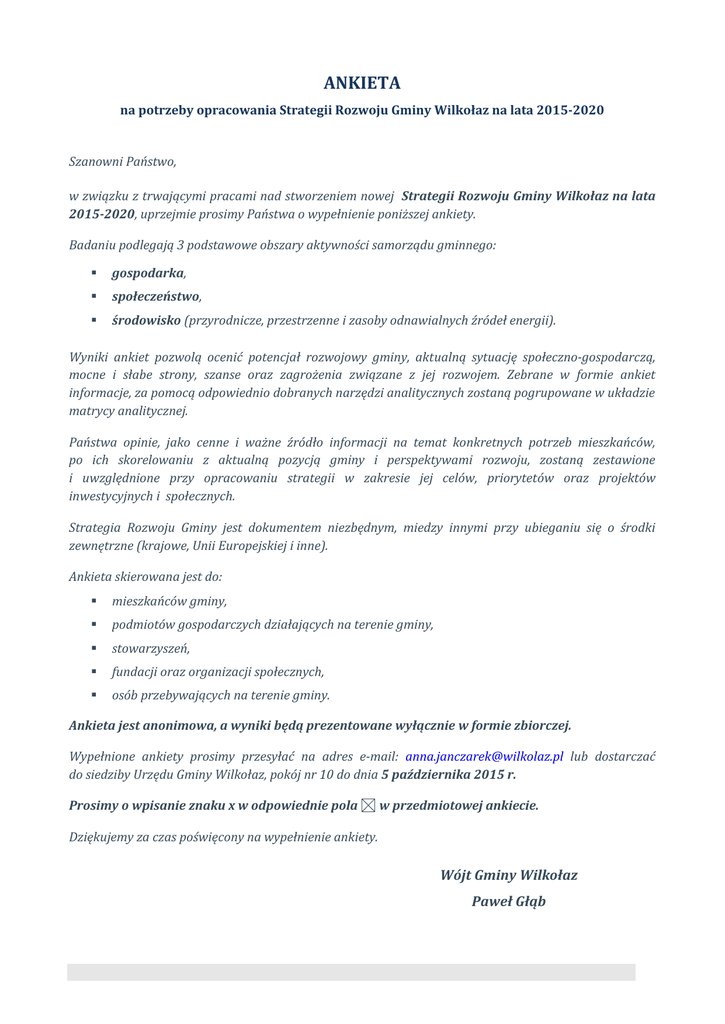 ANKIETA na potrzeby opracowania Strategii Rozwoju Gminy Wilkołaz na lata 2015-2020 Szanowni Państwo, w związku z trwającymi pracami nad stworzeniem nowej Strategii Rozwoju Gminy Wilkołaz na lata 2015-2020, uprzejmie prosimy Państwa o wypełnienie poniższej ankiety. Badaniu podlegają 3 podstawowe obszary aktywności samorządu gminnego: gospodarka, społeczeństwo, środowisko (przyrodnicze, przestrzenne i zasoby odnawialnych źródeł energii). Wyniki ankiet pozwolą ocenić potencjał rozwojowy gminy, aktualną sytuację społeczno-gospodarczą, mocne i słabe strony, szanse oraz zagrożenia związane z jej rozwojem. Zebrane w formie ankiet informacje, za pomocą odpowiednio dobranych narzędzi analitycznych zostaną pogrupowane w układzie matrycy analitycznej. Państwa opinie, jako cenne i ważne źródło informacji na temat konkretnych potrzeb mieszkańców, po ich skorelowaniu z aktualną pozycją gminy i perspektywami rozwoju, zostaną zestawione i uwzględnione przy opracowaniu strategii w zakresie jej celów, priorytetów oraz projektów inwestycyjnych i społecznych. Strategia Rozwoju Gminy jest dokumentem niezbędnym, miedzy innymi przy ubieganiu się o środki zewnętrzne (krajowe, Unii Europejskiej i inne). Ankieta skierowana jest do: mieszkańców gminy, podmiotów gospodarczych działających na terenie gminy, stowarzyszeń, fundacji oraz organizacji społecznych, osób przebywających na terenie gminy. Ankieta jest anonimowa, a wyniki będą prezentowane wyłącznie w formie zbiorczej. Wypełnione ankiety prosimy przesyłać na adres e-mail: [email protected] lub dostarczać do siedziby Urzędu Gminy Wilkołaz, pokój nr 10 do dnia 5 października 2015 r. Prosimy o wpisanie znaku x w odpowiednie pola w przedmiotowej ankiecie. Dziękujemy za czas poświęcony na wypełnienie ankiety. Wójt Gminy Wilkołaz Paweł Głąb 1) Jak ocenia Pani/Pan (4 oznacza - bardzo dobrze, 3 - dobrze, 2 - dostatecznie, 1 - źle): SKALA od 5 do 1 4 3 2 1 GOSPODARKA dostęp i stan podstawowych mediów w gminie (wodociągi, kanalizacja)? rozwiązania komunikacyjne na terenie gminy (połączenia drogowe)? stan dróg w gminie? dostęp do nowoczesnych technologii (komputer, Internet)? warunki do prowadzenia działalności gospodarczej? warunki prowadzenia działalności rolniczej? atrakcyjność inwestycyjną gminy (na zewnątrz, dla inwestorów)? poziom usług i przetwórstwa? poziom handlu, transportu i magazynowania/przechowywania? stan budynków użyteczności publicznej? UWAGI: .................................................................................................................................................................................... ŚRODOWISKO estetykę swojej miejscowości? jakość terenów rekreacyjnych (parki, miejsca spacerowe)? stan zagospodarowania przestrzeni publicznej (parkingi, chodniki, ławki, kosze na śmieci)? stan środowiska naturalnego na terenie gminy? atrakcyjność turystyczną (ilość i jakość zabytków, miejsc atrakcyjnych przyrodniczo, obszary chronione, ścieżki przyrodnicze i edukacyjne)/ poziom wykorzystania odnawialnych źródeł energii na terenie gminy? poziom bazy turystyczno-wypoczynkowej (noclegowa, gastronomiczna)? promocję walorów turystycznych i przyrodniczych gminy? UWAGI: .................................................................................................................................................................................... SPOŁECZEŃSTWO stan lokalnego rynku pracy? dostępność i poziom usług ochrony zdrowia (podstawowa opieka medyczna, apteki, stomatolog)? dochody mieszkańców? sposób rozwiązywania problemów społecznych i profilaktyki? skalę występowania przestępczości i przemocy w rodzinie? działania w zapewnianiu bezpieczeństwa mieszkańców? poziom rozwoju infrastruktury sportowej i rekreacyjnej (boiska, place zabaw, parki, ławeczki)? poziom i liczbę obiektów kulturalnych w gminie? ofertę spędzania wolnego czasu na terenie gminy (dla dzieci, młodzieży, dorosłych, seniorów)? poziom edukacji w gminie (jakość kształcenia, dostępność zajęć dodatkowych dla uczniów, zajęcia wyrównawcze)? liczbę obiektów oświatowych w gminie (przedszkola, szkoły)? efektywność zagospodarowania przestrzeni (czy tereny są wykorzystywane optymalnie)? dostępność administracji publicznej? poziom zaangażowania mieszkańców w sprawy społeczności lokalnej? UWAGI: .................................................................................................................................................................................... 2) Najważniejsze atuty (moce strony) Gminy to (proszę zaznaczyć 10 odpowiedzi): wysokie walory środowiska przyrodniczego dobra dostępność komunikacyjna podmioty gospodarcze o silnej pozycji w regionie położenie przy ważnych szlakach komunikacyjnych istniejące placówki kulturalne bliskość dużych ośrodków miejskich dobra infrastruktura lokalna (drogowa, komunalna, kubaturowa) dobrze rozwinięte i efektywnie funkcjonujące rolnictwo dobra baza oświatowa duża liczba miejsc pracy dobre warunki dla inwestorów wysoki poziom kształcenia w placówkach oświatowych walory turystyczne, atrakcyjne przyrodniczo i kulturowo tereny istniejące wolne tereny pod działalność gospodarczą płynność finansowa budżetu gminy, brak zadłużenia proinwestycyjne nastawienie władz gminy racjonalna polityka podatkowa gminy urozmaicony krajobraz naturalny (zróżnicowanie przyrodnicze i przestrzenne) duży potencjał do rozwoju turystyki i agroturystyki dobrej jakości (klasy) gleby zaplecze owocowo-warzywne produkty lokalne (tradycyjne, regionalne, "ekologiczne") zaplecze sportowe niskie rejestrowane bezrobocie duże zasoby konkurencyjnej płacowo grupy aktywnych zawodowo osób duża aktywność mieszkańców w życiu społecznym rozwinięta sieć telekomunikacyjna korzystne warunki przyrodnicze dla rozwoju rolnictwa ekologicznego dziedz