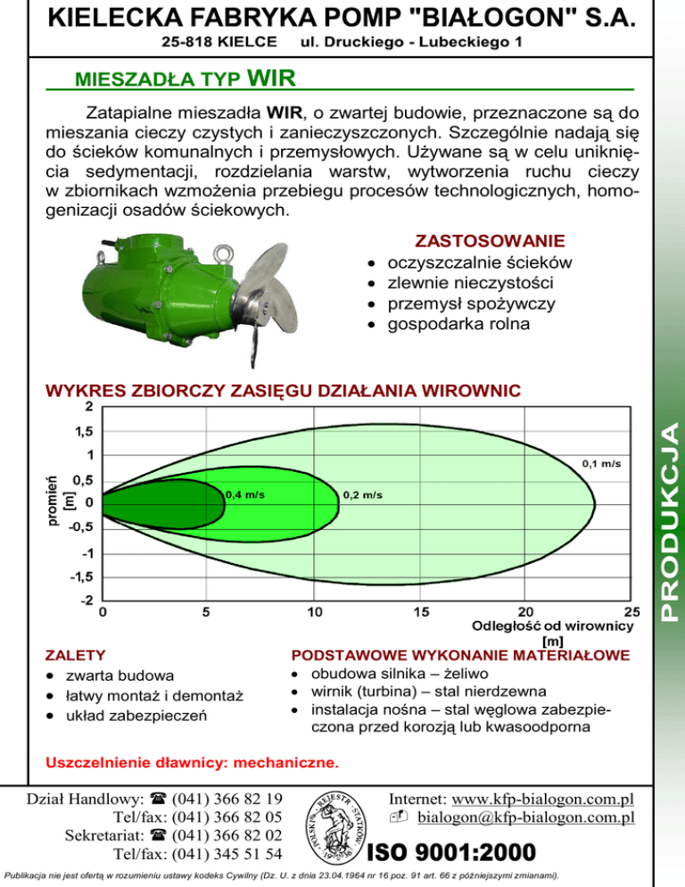 MIESZADŁA TYP WIR Zatapialne mieszadła WIR, o zwartej budowie, przeznaczone są do mieszania cieczy czystych i zanieczyszczonych. Szczególnie nadają się do ścieków komunalnych i przemysłowych. Używane są w celu uniknięcia sedymentacji, rozdzielania warstw, wytworzenia ruchu cieczy w zbiornikach wzmożenia przebiegu procesów technologicznych, homogenizacji osadów ściekowych. · · · · ZASTOSOWANIE oczyszczalnie ścieków zlewnie nieczystości przemysł spożywczy gospodarka rolna WYKRES ZBIORCZY ZASIĘGU DZIAŁANIA WIROWNIC ZALETY · zwarta budowa · łatwy montaż i demontaż · układ zabezpieczeń PODSTAWOWE WYKONANIE MATERIAŁOWE · obudowa silnika – żeliwo · wirnik (turbina) – stal nierdzewna · instalacja nośna – stal węglowa zabezpieczona przed korozją lub kwasoodporna Uszczelnienie dławnicy: mechaniczne. Dział Handlowy: ( (041) 366 82 19 Tel/fax: (041) 366 82 05 Sekretariat: ( (041) 366 82 02 Tel/fax: (041) 345 51 54 Internet: www.kfp-bialogon.com.pl - [email protected] Publikacja nie jest ofertą w rozumieniu ustawy kodeks Cywilny (Dz. U. z dnia 23.04.1964 nr 16 poz. 91 art. 66 z późniejszymi zmianami).