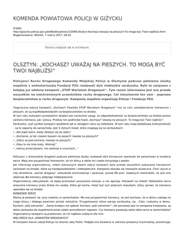 KOMENDA POWIATOWA POLICJI W GIŻYCKU Źródło: http://gizycko.policja.gov.pl/o06/aktualnosci/13069,Olsztyn-Kochasz-Uwazaj-na-pieszych-To-moga-byc-Twoi-najblizsi.html Wygenerowano: Wtorek, 7 marca 2017, 04:42 Strona znajduje się w archiwum. OLSZTYN: „KOCHASZ? UWAŻAJ NA PIESZYCH. TO MOGĄ BYĆ TWOI NAJBLIŻSI” Policjanci Ruchu Drogowego Komendy Miejskiej Policji w Olsztynie podczas pełnienia służby wspólnie z wolontariuszką Fundacji PZU rozdawali dziś niebieskie serduszka. Było to związane z kolejną już odsłoną kampanii „STOP Wariatom Drogowym”. Tym razem skierowana jest ona przede wszystkim na niechronionych uczestników ruchu drogowego. Cel nieustannie ten sam - poprawa bezpieczeństwa w ruchu drogowym. Kampanię wspólnie organizują Policja i Fundacja PZU. Tegoroczna edycja kampanii „Kochasz? Powiedz STOP Wariatom Drogowym” ma na celu uświadomienie kierowcom i pieszym, że są współodpowiedzialni za bezpieczeństwo na drodze. W tym roku motywem przewodnim działań jest zwrócenie uwagi, że odpowiedzialność za bezpieczeństwo na drodze ponosi zarówno kierowca, jak i pieszy. Przekaz ten podkreśla hasło „Kochasz? Uważaj na pieszych. To mogą być Twoi najbliżsi”. Serduszka, czyli symbol kampanii (podobnie jak w ubiegłym roku) są niebieskie. W tym roku mają dodatkową funkcjonalność – są to zapachy do samochodu. Jest 5 różnych haseł, które znajdują się na serduszkach: • „Nie bądź lwem, kiedy zbliżasz się do zebry” • „Kochanie, ja też czasem bywam na pasach! Uważaj na pieszych!” • „Zebry są pod ochroną. Uważaj na pieszych.” • „Pasy to nie linia mety. Wolniej!” • „Hamuj przed pasami, nie zwalniaj w uczuciach…” Policjanci z olsztyńskiej drogówki podczas pełnienia służby rozdawali dziś kierowcom zawieszki do samochodu w kształcie serca. Mają one przypominać kierowcom, że ich bliscy a także oni często korzystają z pasów. Jak informują organizatorzy, celem pierwszych dwóch edycji kampanii było przede wszystkim pokazanie kierowcom zachowań na drodze, które są nieodpowiedzialne i niebezpieczne. Kampania okazała się niezwykle skuteczna. Choć użycie w niej określenia „wariat drogowy” wzbudzało kontrowersje i dyskusje, ponad 88 proc. badanych stwierdziło, że jest ono właściwe dla kierowcy jadącego niebezpiecznie. Organizatorzy zdecydowali, że będą promować pozytywne emocje, a nie agresję. Postawili na miłość! Niebieskie serce wręczone kierowcy przez bliską mu osobę, która go kocha, może być tym jedynym impulsem, który sprawi, że kierowca opamięta się na drodze. NIEBIESKIE SERCE Można je powiesić np. przy lusterku w samochodzie. Ma ono przypominać kierowcy, że jest kochany, że w domu czekają na niego bliscy i dlatego powinien jechać ostrożnie. Przygotowano różne wersje serduszka, np. „Tato, czekamy w domu. Kocham, jedź ostrożnie”, „Sama kredytu nie spłacę! Kocham, jedź ostrożnie!”, ale ponieważ jest to kampania kreatywna, są także serduszka do wypełnienia przez siebie wymyślonym napisem. Czy kierowcy powieszą sobie takie serca w samochodzie? Organizatorzy kampanii są przekonani, że ich najbliżsi zrobią to dla nich. MIEJ SERCE DLA „WARIATÓW DROGOWYCH” W kampanii bierze udział Policja na terenie całej Polski. Podjęła ona działania w zakresie prewencji kryminalnej, prezentując jej zasady w mediach i wręczając kierowcom serduszka przy okazji kontroli drogowych. A gdy rozpocznie się rok szkolny, będzie prowadziła pogadanki w szkołach z dziećmi i rodzicami. Niebieskie serca będą rozdawane w szkołach przez patrole policji i agentów PZU, podczas festiwali muzycznych, jako inserty do prasy oraz na stacjach benzynowych, a także w oddziałach PZU. Fundacja PZU ma nadzieję, że do końca tego roku w polskich samochodach znajdzie się 2 mln serc dla „wariatów drogowych”. Więcej informacji na temat akcji na stronie kampanii Tegoroczna edycja kampanii „Kochasz? Powiedz STOP Wariatom Drogowym” ma na celu uświadomienie kierowcom i pieszym, że są współodpowiedzialni za bezpieczeństwo na drodze. W tym roku motywem przewodnim działań jest zwrócenie uwagi, że odpowiedzialność za bezpieczeństwo na drodze ponosi zarówno kierowca, jak i pieszy. Przekaz ten podkreśla hasło „Kochasz? Uważaj na pieszych. To mogą być Twoi najbliżsi”. Serduszka, czyli symbol kampanii (podobnie jak w ubiegłym roku) są niebieskie. W tym roku mają dodatkową funkcjonalność – są to zapachy do samochodu. Jest 5 różnych haseł, które znajdują się na serduszkach: • „Nie bądź lwem, kiedy zbliżasz się do zebry” • „Kochanie, ja też czasem bywam na pasach! Uważaj na pieszych!” • „Zebry są pod ochroną. Uważaj na pieszych.” • „Pasy to nie linia mety. Wolniej!” • „Hamuj przed pasami, nie zwalniaj w uczuciach…” Policjanci z olsztyńskiej drogówki podczas pełnienia służby rozdawali dziś kierowcom zawieszki do samochodu w kształcie serca. Mają one przypominać kierowcom, że ich bliscy a także oni często korzystają z pasów. Jak informują organizatorzy, celem pierwszych dwóch edycji kampanii było przede wszystkim pokazanie kierowcom zachowań na drodze, które są nieodpowiedzialne i niebezpieczne. Kampania okazała się niezwykle skuteczna. Choć użycie w niej określenia „wariat drogowy” wzbudzało kontrowersje i dyskusje, ponad 88 proc. badanych stwierdziło, że jest ono właściwe dla kierowcy jadącego niebezpiecznie. Organizatorzy zdecydowali, że będą promować pozytywne emocje, a nie agresję. Postawili na miłość! Niebieskie serce wręczone kierowcy przez bliską mu osobę, która go kocha, może być tym jedynym impulsem, który sprawi, że kierowca opamięta się na drodze. NIEBIESKIE SERCE Można je powiesić np. przy lusterku w samochodzie. Ma ono przypominać kierowcy, że jest kochany, że w domu czekają na niego bliscy i dlatego pow