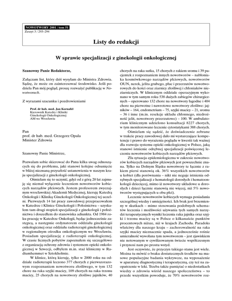 NOWOTWORY 2001 / tom 51 Zeszyt 3 / 293–294 Listy do redakcji W sprawie specjalizacji z ginekologii onkologicznej Szanowny Panie Redaktorze, Za∏àczam list, który dziÊ wysy∏am do Ministra Zdrowia. Sàdz´, ˝e mo˝e on zainteresowaç Êrodowisko. JeÊli podziela Pan mój poglàd, prosz´ rozwa˝yç publikacj´ w Nowotworach. Z wyrazami szacunku i pozdrowieniami Prof. dr hab. med. Jan Kornafel Kierownik Katedry i Kliniki Ginekologii Onkologicznej AM we Wroc∏awiu Pan prof. dr hab. med. Grzegorz Opala Minister Zdrowia Szanowny Panie Ministrze, Pozwalam sobie skierowaç do Pana kilka uwag odnoszàcych si´ do problemu, jaki stanowi kolejne odsuni´cie w bli˝ej nieznanà przysz∏oÊç ustanowienia w naszym kraju specjalizacji z ginekologii onkologicznej. OÊmielam si´ to uczyniç, gdy˝ od z górà 20 lat zajmuj´ si´ niemal wy∏àcznie leczeniem nowotworów kobiecych narzàdów p∏ciowych. Jestem profesorem zwyczajnym wroc∏awskiej Akademii Medycznej, kieruj´ Katedrà Onkologii i Klinikà Ginekologii Onkologicznej tej uczelni. Pierwszych 14 lat pracy zawodowej przepracowa∏em w Katedrze i Klinice Ginekologii i Po∏o˝nictwa – uzyska∏em tam drugi stopieƒ specjalizacji z ginekologii i po∏o˝nictwa i doszed∏em do stanowiska adiunkta. Od 1984 roku pracuj´ w Katedrze Onkologii, b´dàc jednoczeÊnie zast´pcà, a nast´pnie ordynatorem oddzia∏u ginekologii onkologicznej oraz oddzia∏u radioterapii ginekologicznej w regionalnym oÊrodku onkologicznym we Wroc∏awiu. Posiadam specjalizacj´ z radioterapii onkologicznej. W czasie licznych pobytów zapozna∏em si´ szczegó∏owo z organizacjà ochrony zdrowia i systemem opieki onkologicznej w Szwecji, odby∏em m.in. sta˝ kliniczny w Radiumhemmet w Sztokholmie. W klinice, którà kieruj´, tylko w 2000 roku na oddziale radioterapii leczono 377 chorych z pierwszorazowym rozpoznaniem nowotworu z∏oÊliwego, w tym 132 chore na raka szyjki macicy, 109 chorych na raka trzonu macicy, 25 chorych na nowotwory z∏oÊliwe jajników, 40 chorych na raka sutka, 15 chorych z rakiem sromu i 39 pacjentek z rozpoznaniem innych nowotworów – nab∏oniaka kosmówkowego narzàdów p∏ciowych, nowotworów OUN, nerek, jelita grubego, p∏uc i przerzutów nowotworowych do koÊci oraz ziarnicy z∏oÊliwej i ch∏oniaków nieziarniczych. W klinicznym oddziale operacyjnym wykonano w tym samym roku 538 du˝ych zabiegów chirurgicznych – operowano 132 chore na nowotwory ∏agodne i 404 chore na pierwotne i nawrotowe nowotwory z∏oÊliwe: jajników – 164, endometrium – 75, szyjki macicy – 21, sromu – 36 i inne (m.in. resekcje uk∏adu ch∏onnego, niedro˝noÊç jelit, nowotwory przerzutowe) – 100. W ambulatorium klinicznym udzielono konsultacji 8227 chorych, w tym monitorowano leczenie cytostatykami 388 chorych. OÊmielam si´ sàdziç, ˝e doÊwiadczenie zebrane w trakcie pracy zawodowej da∏o mi wystarczajàce kompetencje i prawo do wyra˝enia poglàdu w kwestii tak wa˝nej dla rozwoju systemu opieki onkologicznej w Polsce, jakà stanowi istnienie odr´bnej specjalizacji poÊwi´conej leczeniu nowotworów kobiecych narzàdów p∏ciowych. Z∏a sytuacja epidemiologiczna w zakresie nowotworów kobiecych narzàdów p∏ciowych jest powszechnie znana. Tylko na Dolnym Âlàsku nowotwory te ∏àcznie z rakiem piersi stanowià ok. 36% wszystkich nowotworów u kobiet (dla porównania – nikt nie neguje istnienia odr´bnych specjalizacji z hematologii doros∏ych i hematoonkologii dzieci´cej, mimo i˝ nowotwory uk∏adowe u doros∏ych i dzieci ∏àcznie stanowià nie wi´cej, ni˝ 5% nowotworów wyst´pujàcych u obu p∏ci). Leczenie nowotworów kobiecych wymaga posiadania szczególnej wiedzy i umiej´tnoÊci. Ich brak jest brzemienny w skutkach – mimo stosowania podobnych schematów leczenia i mo˝liwoÊci u˝ywania tych samych narz´dzi terapeutycznych wyniki leczenia raka jajnika oraz szyjki i trzonu macicy sà w Polsce o kilkanaÊcie punktów procentowych ni˝sze, ni˝ w krajach Zachodu. Paradoks w∏aÊciwy dla naszego kraju – zachorowalnoÊç na raka szyjki macicy nieznacznie spada, a jednoczeÊnie roÊnie umieralnoÊç wywo∏ana tym nowotworem – jest zjawiskiem nie notowanym w cywilizowanym Êwiecie wspó∏czesnym i przynosi nam po prostu wstyd. Jest oczywiste, ˝e przyczyn takiego stanu jest wiele. Mo˝na tu mówiç o braku dostatecznych Êrodków na masowe populacyjne badania wykrywcze, na wyposa˝enie w aparatur´ diagnostycznà i terapeutycznà, czy te˝ na zaopatrzenie w leki. Trzeba tak˝e pami´taç o niedostatkach wiedzy o zdrowiu wÊród naszego spo∏eczeƒstwa – to przede wszystkim powoduje, ˝e 70% nowotworów roz- 294 poznawanych jest w Polsce w stadiach zaawansowanych, podczas gdy na Zachodzie tyle samo wykrywa si´ w stadiach wczesnych. B∏´dem by∏oby jednak nie widzieç, ˝e nie ma w naszym kraju przemyÊlanego systemu, w którym konsekwentne przestrzeganie ustalonych regu∏ post´powania dawa∏oby chorym najwi´kszà szans´ na wyleczenie, szans´ optymalnà z punktu widzenia aktualnego stanu wiedzy onkologicznej. Brak konsekwencji widoczny jest jednak na ka˝dym kroku i lekarze profesjonalnie zajmujàcy si´ leczeniem nowotworów kobiecych podaç mogà wiele jego przyk∏adów. Nie jestem odosobniony w opinii, ˝e jednym z podstawowych elementów systemu gwarantujàcego optymalny poziom leczenia nowotworów kobiecych narzàdów p∏ciowych jest istnienie ginekologii onkologicznej jako dziedziny medycyny. W tym kontekÊcie nale˝y zadaç sobie pytanie podstawowe: Czy istnieje w Polsce onkologia ginekologiczna? Odpowiedê na nie jest niejednoznaczna – có˝ bowiem stanowi o istnieniu dyscypliny medycznej: okreÊlone przypadki chorobowe, oÊrodki leczàce, osiàgni´cia badawcze, czy te˝ istnienie towarzystwa naukowego? JeÊli uznaç te warunki za wystarczajàce, to onkologia ginekologiczna w naszym kraju jest w rozkwicie – chorych mnóstwo, klinik i oddzia∏ów wiele, multum bada