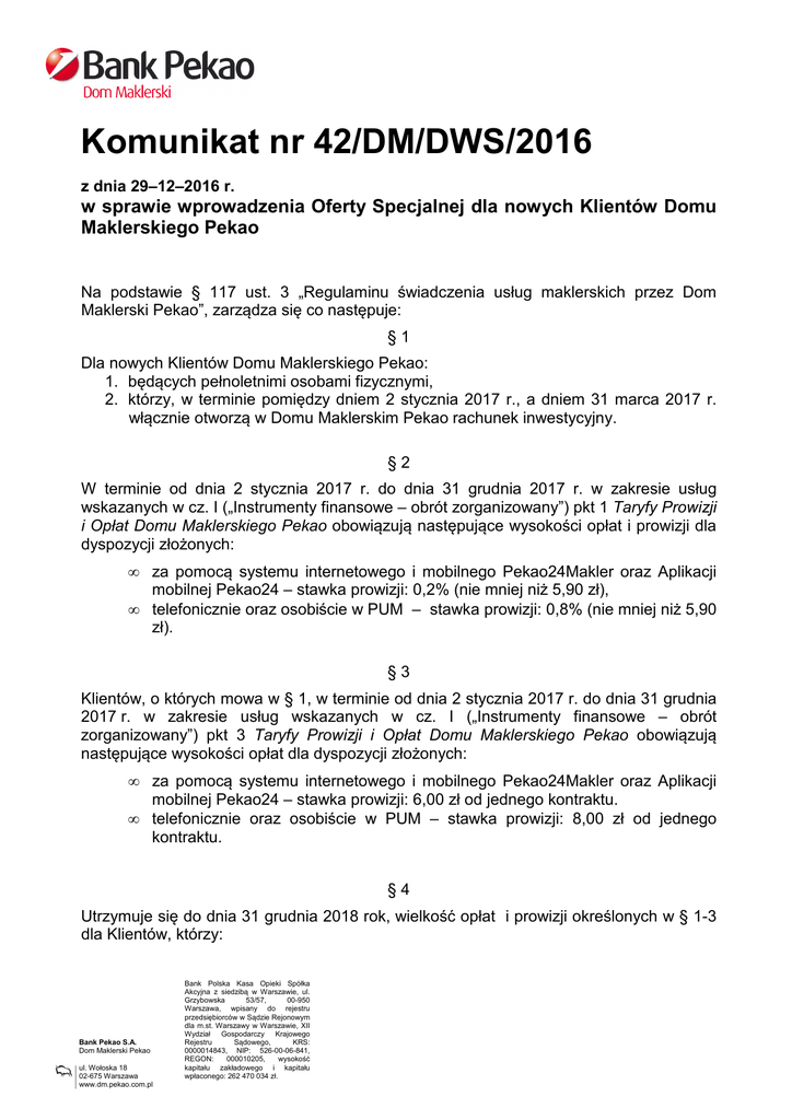 Komunikat nr 42/DM/DWS/2016 z dnia 29–12–2016 r. w sprawie wprowadzenia Oferty Specjalnej dla nowych Klientów Domu Maklerskiego Pekao Na podstawie § 117 ust. 3 „Regulaminu świadczenia usług maklerskich przez Dom Maklerski Pekao”, zarządza się co następuje: §1 Dla nowych Klientów Domu Maklerskiego Pekao: 1. będących pełnoletnimi osobami fizycznymi, 2. którzy, w terminie pomiędzy dniem 2 stycznia 2017 r., a dniem 31 marca 2017 r. włącznie otworzą w Domu Maklerskim Pekao rachunek inwestycyjny. §2 W terminie od dnia 2 stycznia 2017 r. do dnia 31 grudnia 2017 r. w zakresie usług wskazanych w cz. I („Instrumenty finansowe – obrót zorganizowany”) pkt 1 Taryfy Prowizji i Opłat Domu Maklerskiego Pekao obowiązują następujące wysokości opłat i prowizji dla dyspozycji złożonych: • • za pomocą systemu internetowego i mobilnego Pekao24Makler oraz Aplikacji mobilnej Pekao24 – stawka prowizji: 0,2% (nie mniej niż 5,90 zł), telefonicznie oraz osobiście w PUM – stawka prowizji: 0,8% (nie mniej niż 5,90 zł). §3 Klientów, o których mowa w § 1, w terminie od dnia 2 stycznia 2017 r. do dnia 31 grudnia 2017 r. w zakresie usług wskazanych w cz. I („Instrumenty finansowe – obrót zorganizowany”) pkt 3 Taryfy Prowizji i Opłat Domu Maklerskiego Pekao obowiązują następujące wysokości opłat dla dyspozycji złożonych: • • za pomocą systemu internetowego i mobilnego Pekao24Makler oraz Aplikacji mobilnej Pekao24 – stawka prowizji: 6,00 zł od jednego kontraktu. telefonicznie oraz osobiście w PUM – stawka prowizji: 8,00 zł od jednego kontraktu. §4 Utrzymuje się do dnia 31 grudnia 2018 rok, wielkość opłat i prowizji określonych w § 1-3 dla Klientów, którzy: Bank Pekao S.A. Dom Maklerski Pekao ul. Wołoska 18 02-675 Warszawa www.dm.pekao.com.pl Bank Polska Kasa Opieki Spółka Akcyjna z siedzibą w Warszawie, ul. Grzybowska 53/57, 00-950 Warszawa, wpisany do rejestru przedsiębiorców w Sądzie Rejonowym dla m.st. Warszawy w Warszawie, XII Wydział Gospodarczy Krajowego Rejestru Sądowego, KRS: 0000014843, NIP: 526-00-06-841, REGON: 000010205, wysokość kapitału zakładowego i kapitału wpłaconego: 262 470 034 zł. 1. w terminie pomiędzy dniem 2 stycznia 2017 r. a dniem 31 marca 2017 r. włącznie otworzą rachunek inwestycyjny w Domu Maklerskim Pekao, 2. na rachunku tym wielkość obrotu do dnia 31 grudnia 2017 roku przekroczy poziom: • 400.000 zł dla akcji, warrantów i jednostek indeksowych, z wyłączeniem obligacji, lub • 200 sztuk kontraktów terminowych z wyłączeniem kontraktów terminowych na akcje i waluty. §5 Komunikat wchodzi w życie z dniem 2 stycznia 2017 r. Piotr Kozłowski Dyrektor Dom Maklerski Pekao Bank Pekao S.A. Dom Maklerski Pekao ul. Wołoska 18 02-675 Warszawa www.dm.pekao.com.pl Bank Polska Kasa Opieki Spółka Akcyjna z siedzibą w Warszawie, ul. Grzybowska 53/57, 00-950 Warszawa, wpisany do rejestru przedsiębiorców w Sądzie Rejonowym dla m.st. Warszawy w Warszawie, XII Wydział Gospodarczy Krajowego Rejestru Sądowego, KRS: 0000014843, NIP: 526-00-06-841, REGON: 000010205, wysokość kapitału zakładowego i kapitału wpłaconego: 262 470 034 zł.
